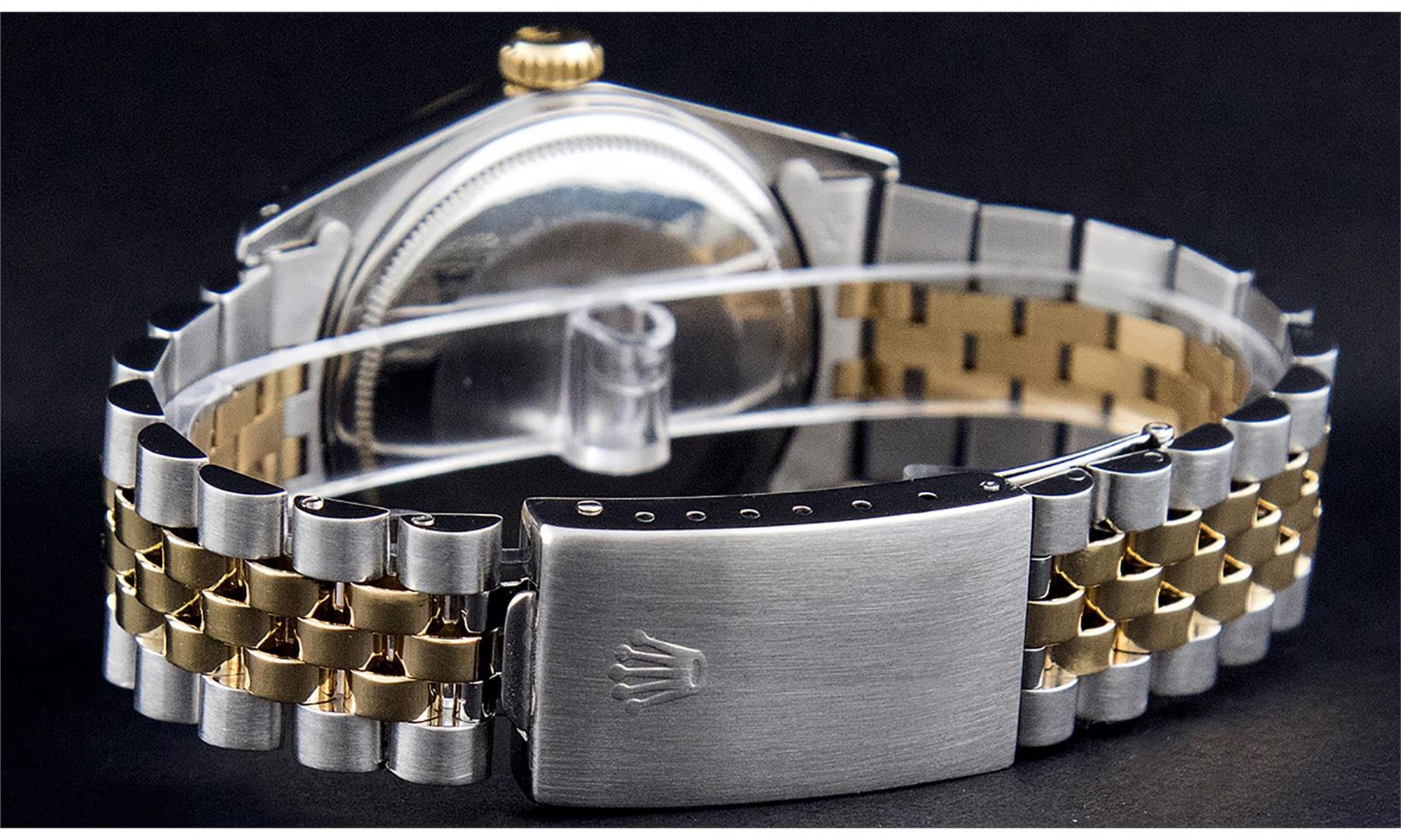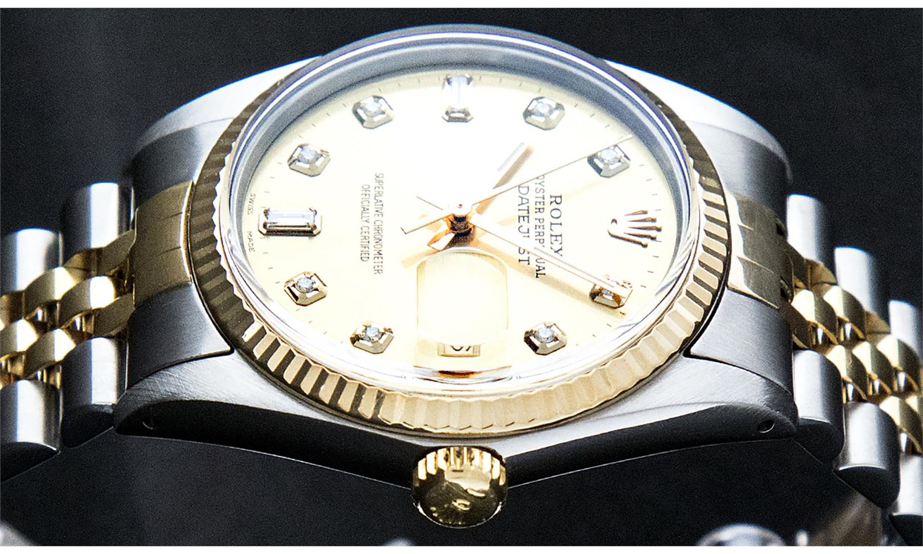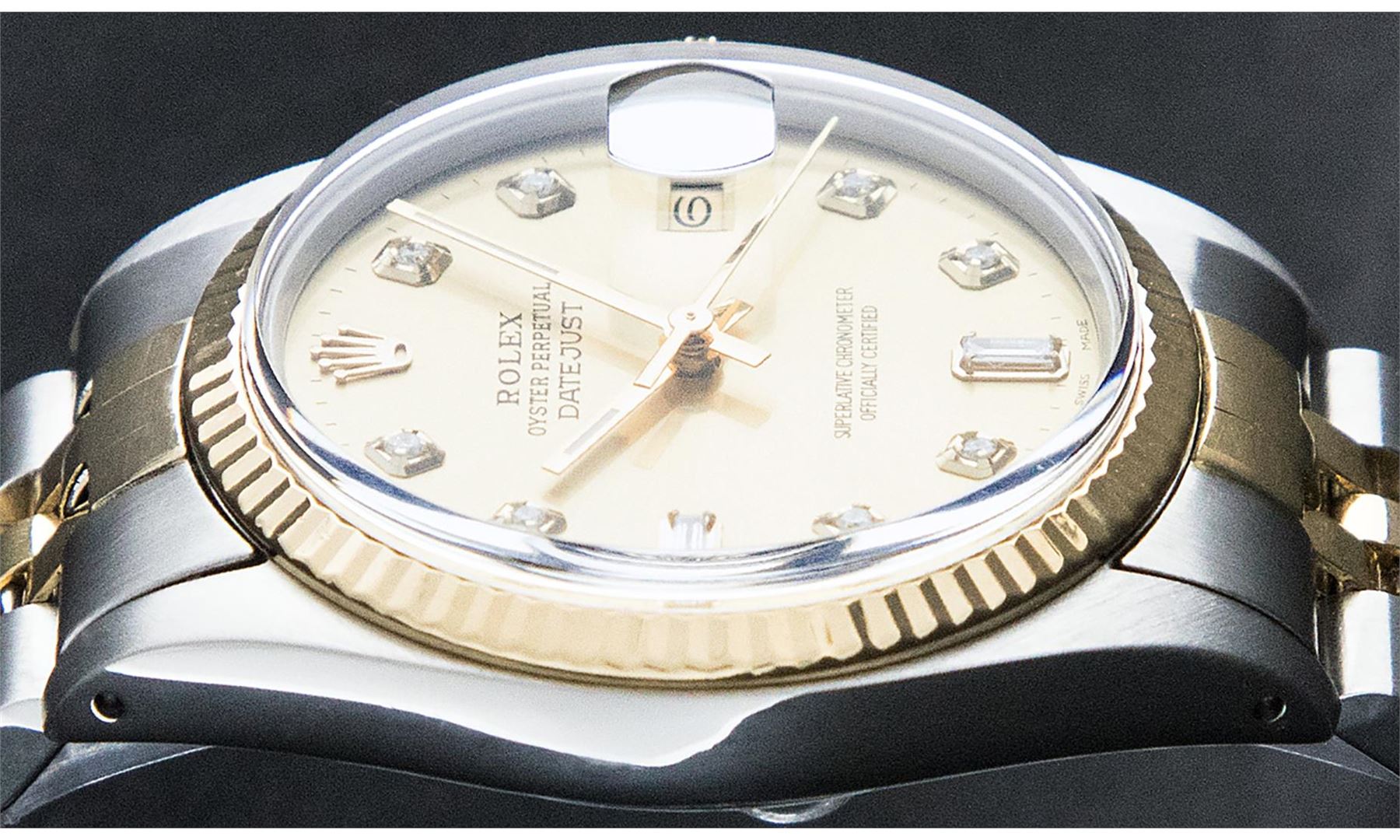 One Mens 14K Yellow Gold Two Tone Rolex Datejust Polished, Serviced & Electronically Tested, 14K Yellow Gold & Stainless Steel Case: 36mm, 14K Yellow Gold Crown, Bezel: 14K Yellow Gold Fluted Bezel. Custom Crystal: New Acrylic Cyclops Lens. Custom Hands: New Luminecent Hands. Movement: Automatic Winding Movement Caliber 3035. Custom Dial: Champagne Diamond Dial, Diamond Count: 8 Diamonds + 2 Baguette Diamonds On Dial, G To H In Color, SI-VS Clarity. Date Window: 3 O'Clock Position Date Display, Quickset, Model: Datejust, Condition: G-6 Extra Fine. Bracelet: Two Tone 14K Yellow Gold & Stainless Steel Jubilee Band. Bright Polish. 7.0 Inch Length, Adjustable. Standard Clasp, With Rolex Logo. This Watch Has Been Serviced And Polished It Is Free Of All Scratches And Dents.