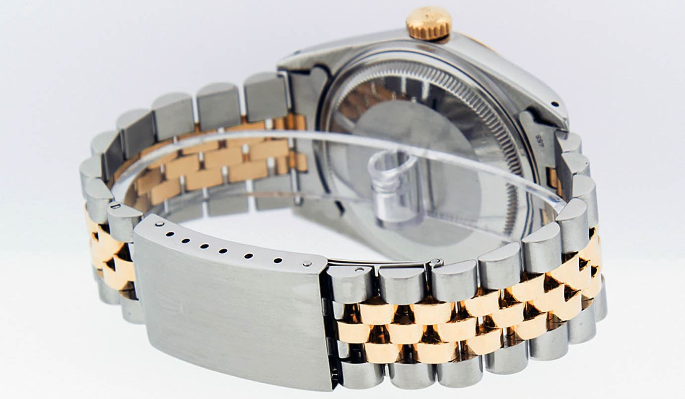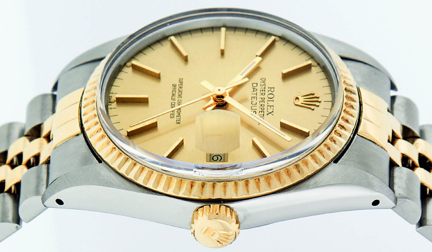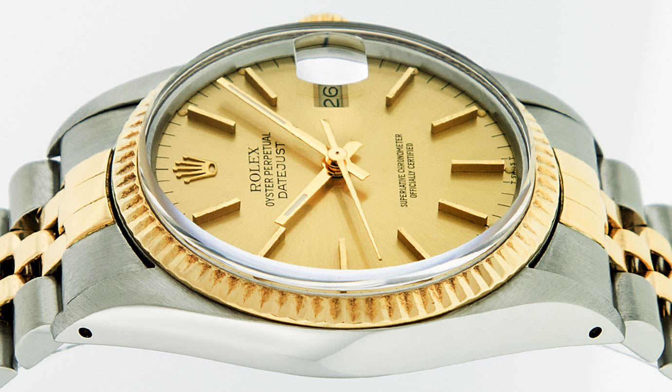 One Mens 14K Yellow Gold Two Tone Rolex Datejust Polished, Serviced & Electronically Tested, 14K Yellow Gold & Stainless Steel Case: 36mm,14K Yellow Gold Crown, Bezel: 14K Yellow Gold Fluted Bezel. Custom Crystal: New Acrylic Cyclops Lens. Custom Hands: New Luminecent Hands. Movement: Automatic Winding Movement Caliber 3035. Dial: Champagne Dial With Index Hour Markers and Small Track. Date Window: 3 O'Clock Position Date Display, Quickset, Model: 16013 Condition: G-6 Extra Fine. Bracelet: Two Tone 14K Yellow Gold & Stainless Steel Jubilee. Bright Polish. 7.0 Inch Length, Adjustable. Standard Clasp, With Rolex Logo. This Watch Has Been Serviced Time Tested And Is In Excellent Condition It Is Free Of All Scratches And Dents.