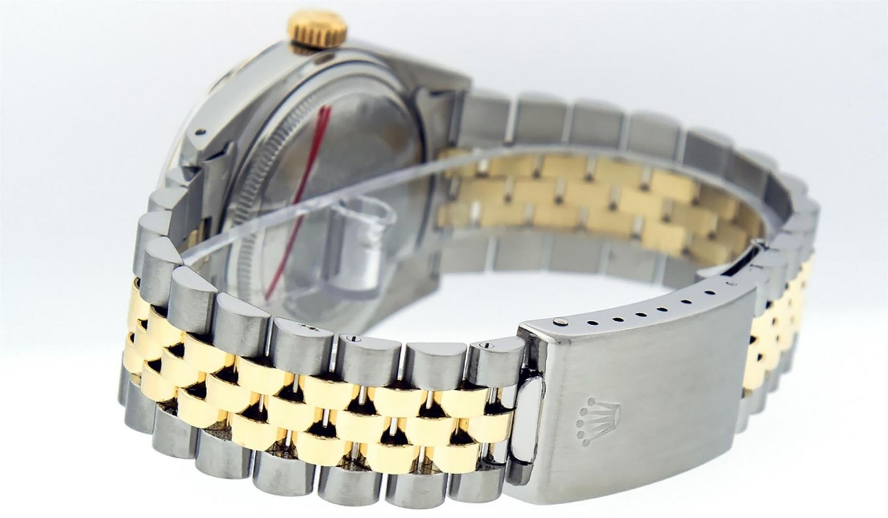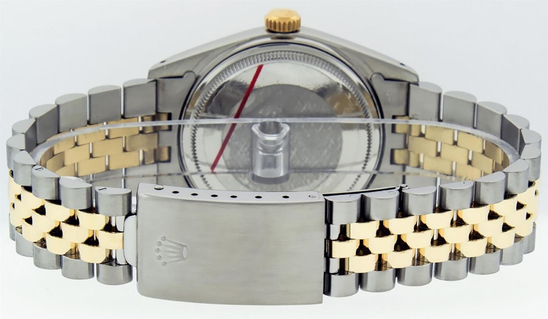 One Mens 14K Yellow Gold Two Tone Rolex Datejust Polished, Serviced & Electronically Tested, 14K Yellow Gold & Stainless Steel Case: 36mm, 14K Yellow Gold Crown, Bezel: 14K Yellow Gold Fluted Bezel. Custom Crystal: New Acrylic Cyclops Lens. Custom Hands: New Luminecent Hands. Movement: Automatic Winding Movement Caliber 3035. Dial: Champagne Linen Dial With Index Hour Markers and Small Track With Lumi Dots. Date Window: 3 O'Clock Position Date Display, Quickset, Model: Datejust. Condition: G-6 Extra Fine. Bracelet: Two Tone 14K Yellow Gold & Stainless Steel Jubilee Band. Bright Polish. 7.0 Inch Length, Adjustable. Standard Clasp, With Rolex Logo. This Watch Has Been Serviced Time Tested And Is In Excellent Condition It Is Free Of All Scratches And Dents. This Watch Comes With A Rolex Box.