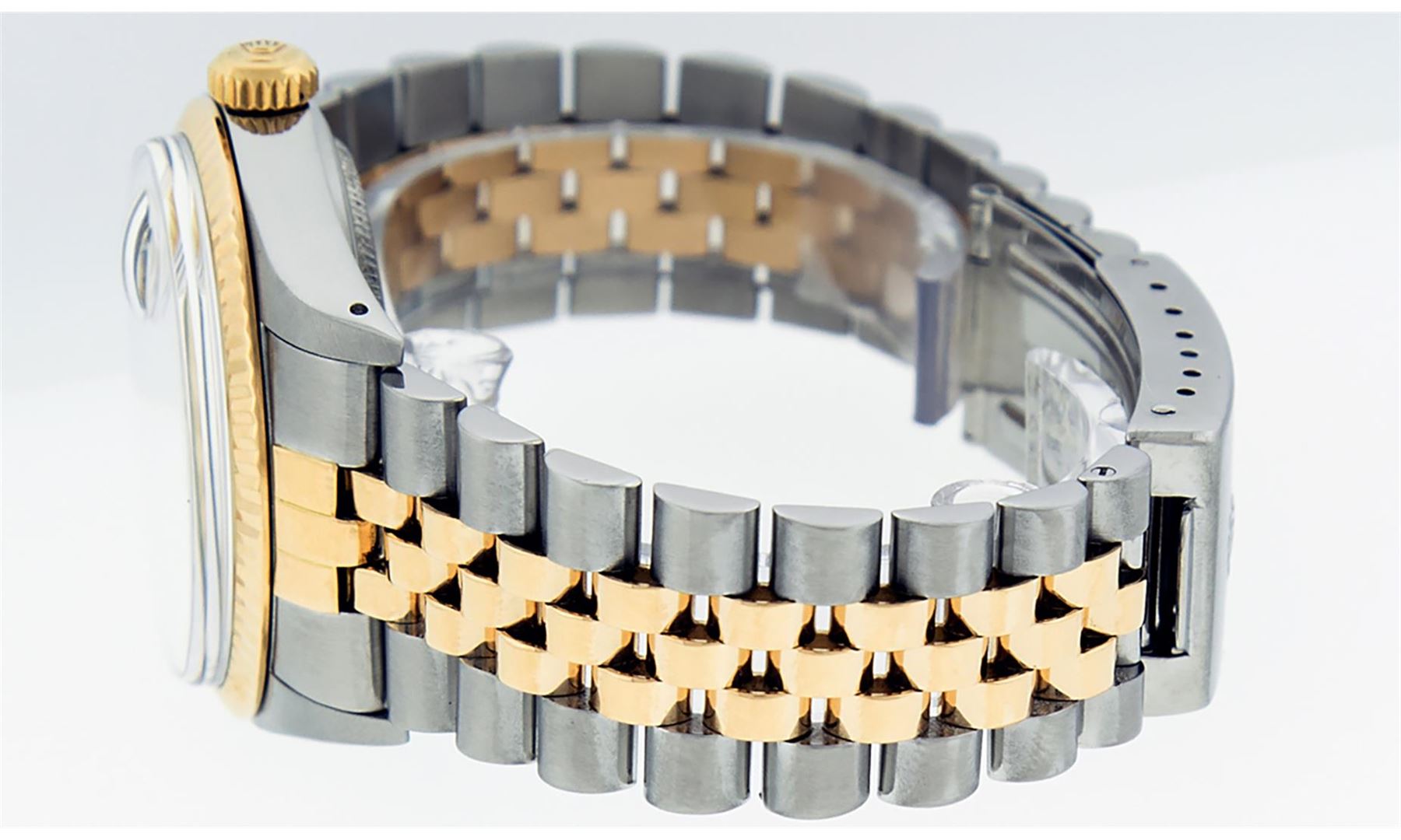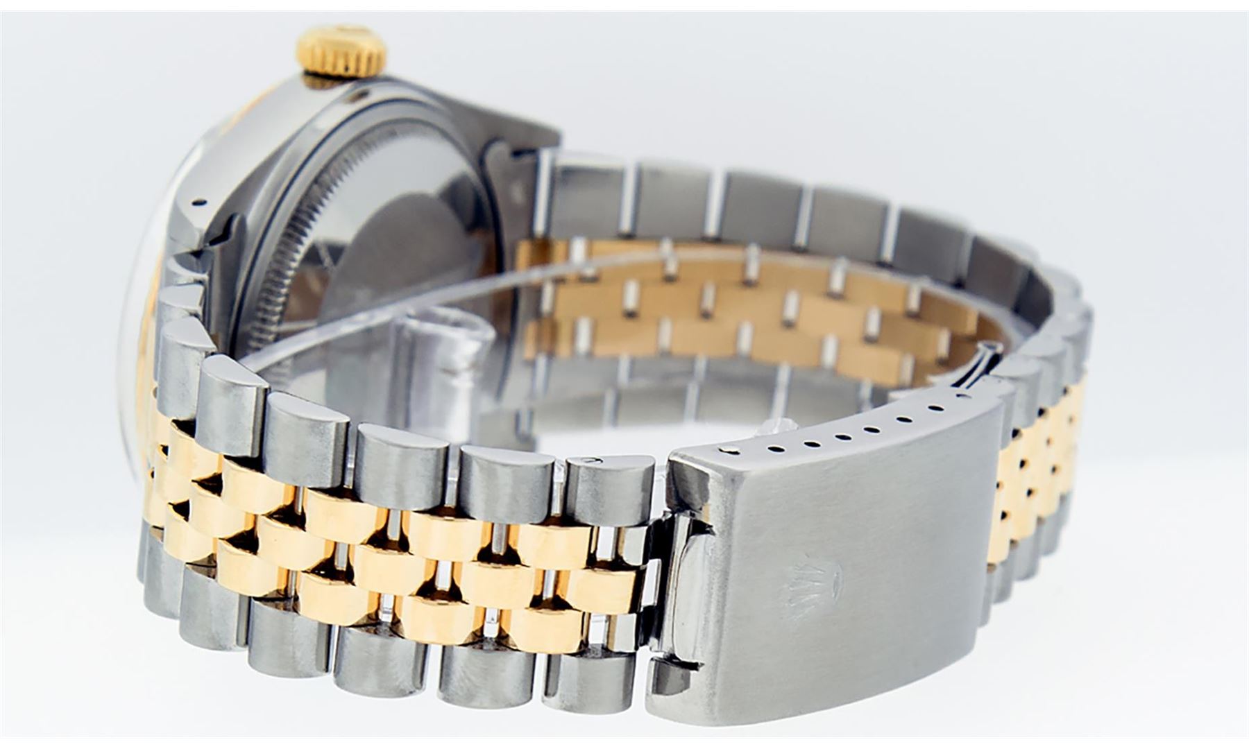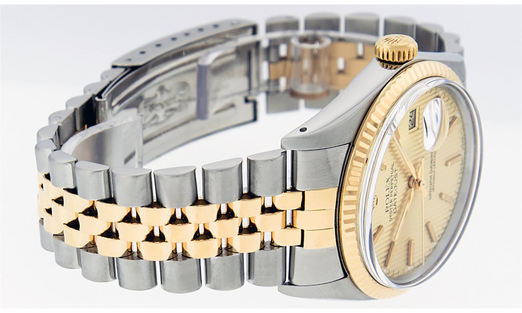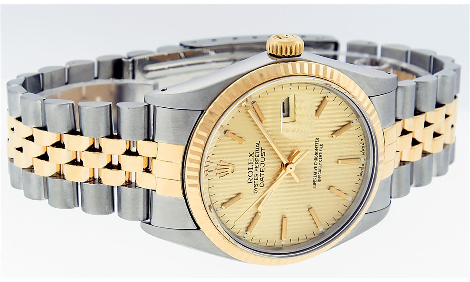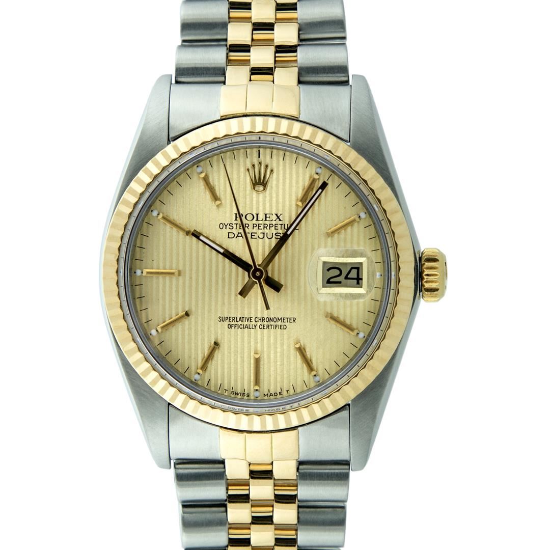 One Mens 14K Yellow Gold Two Tone Rolex Datejust Polished, Serviced & Electronically Tested, 14K Yellow Gold & Stainless Steel Case: 36mm,14K Yellow Gold Crown, Bezel: 14K Yellow Gold Fluted Bezel. Custom Crystal: New Acrylic Cyclops Lens. Custom Hands: New Luminecent Hands. Movement: Automatic Winding Movement Caliber 3035. Dial: Champagne Tapestry Dial With Index Hour Markers and Small Track With Lumi Dots. Date Window: 3 O'Clock Position Date Display, Quickset, Model: Datejust, Condition: G-6 Extra Fine. Bracelet: Two Tone 14K Yellow Gold & Stainless Steel Jubilee Band. Bright Polish. 7.0 Inch Length, Adjustable. Standard Clasp, With Rolex Logo. This Watch Has Been Serviced Time Tested And Is In Excellent Condition It Is Free Of All Scratches And Dents. This Watch Comes With A Rolex Box.