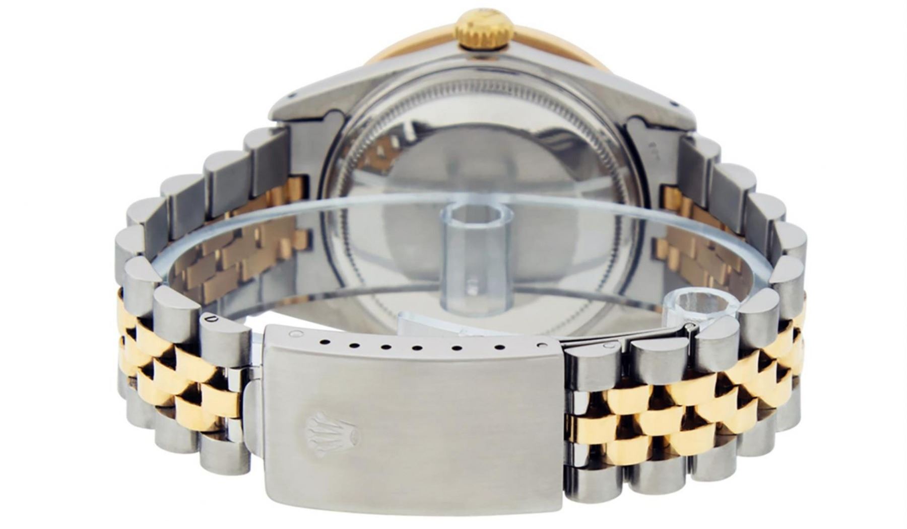 One Mens 14K Yellow Gold Two Tone Rolex Datejust Polished Bright with Satin Finish, Serviced & Electronically Tested, 14K Yellow Gold And Stainless Steel Case: 36mm, Yellow Gold Crown, Custom Bezel: New 14K Yellow Gold Princess Cut Diamond Bezel, Diamond Count: 53 Diamonds, Total Weight 2.75 Carat, Clarity: SI-VS, Color: G to H. Custom Crystal: New Synthetic Sapphire Cyclops Lens. Custom Hands: New Luminecent Hands. Movement: Automatic Winding Movement Caliber 3035. Custom Dial: Green String Diamond Dial, Diamond Count: 58 Diamond in Dial, Dial Color: G To H In Color, Clarity: VS2-SI1. Date Window: 3 O'Clock Position Date Display, Quickset, Model: 16013 Datejust. Condition: G-6 Extra Fine. Bracelet: 14K Yellow Gold And Stainless Steel Jubilee. Bright Polish & Satin Finish. 7.0 Inch Length, Adjustable. Standard Clasp, With Rolex Logo. This Watch Has Been Serviced and Polished And It Is Free Of All Dents And Scratches And Has Been Time Tested.