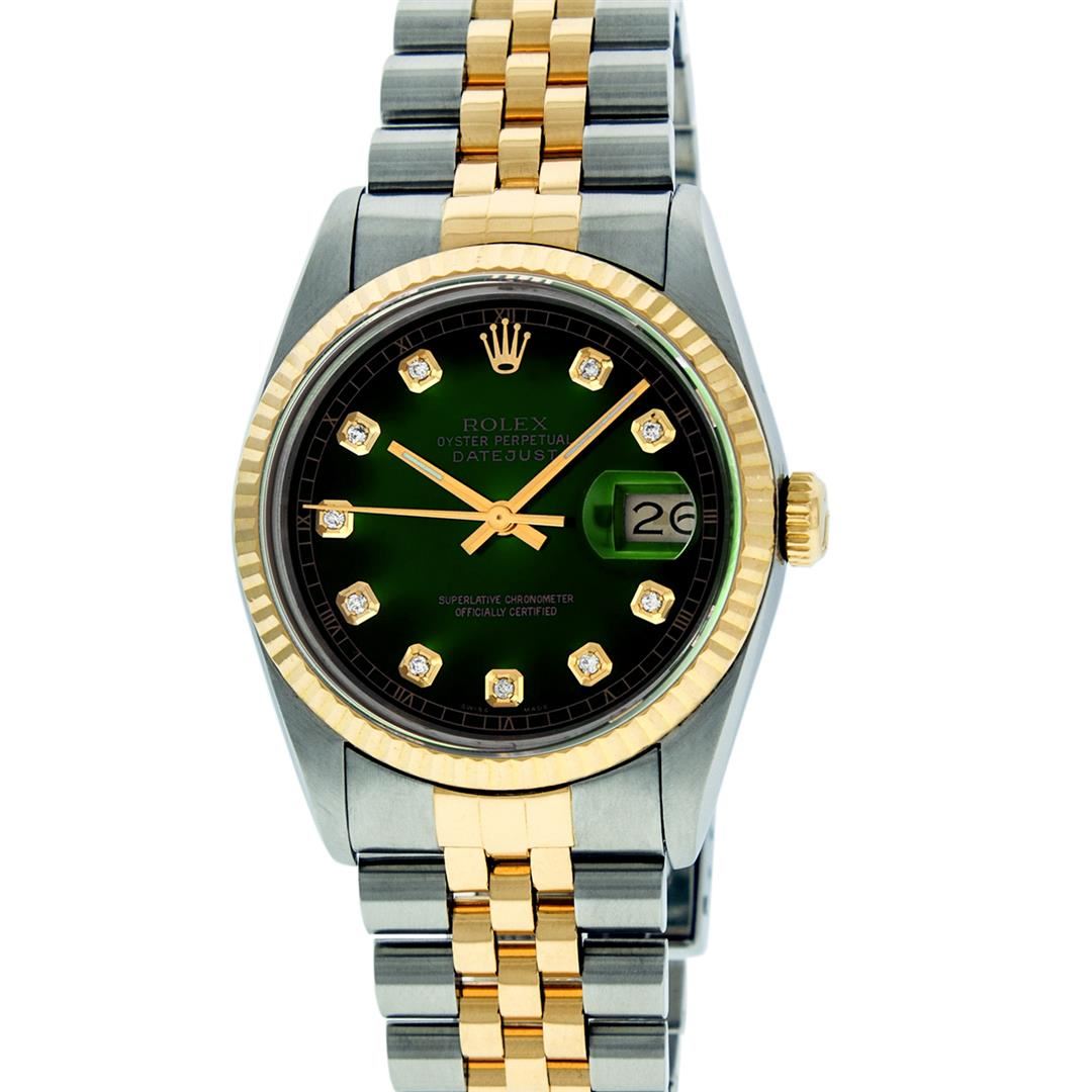One Mens 14K Yellow Gold Two Tone Rolex Datejust Polished, Serviced & Electronically Tested, 14K Yellow Gold & Stainless Steel Case: 36mm, 14K Yellow Gold Crown, Bezel: 14K Yellow Gold Fluted Bezel. Custom Crystal: New Acrylic Cyclops Lens. Custom Hands: New Luminecent Hands. Movement: Automatic Winding Movement Caliber 3035. Custom Dial: Green Vignette Set With Diamond Hour Markers And Square Roman Track, Diamond Count: 10 Diamonds in Dial G To H In Color, SI-VS Clarity. Date Window: 3 O'Clock Position Date Display, Quickset, Model: 16013 Datejust, Condition: G-6 Extra Fine. Bracelet: Two Tone 14K Yellow Gold & Stainless Steel Jubilee. Bright Polish. 7.0 Inch Length, Adjustable. Standard Clasp, With Rolex Logo. This Watch Has Been Serviced And Polished It Is Free Of All Scratches And Dents.