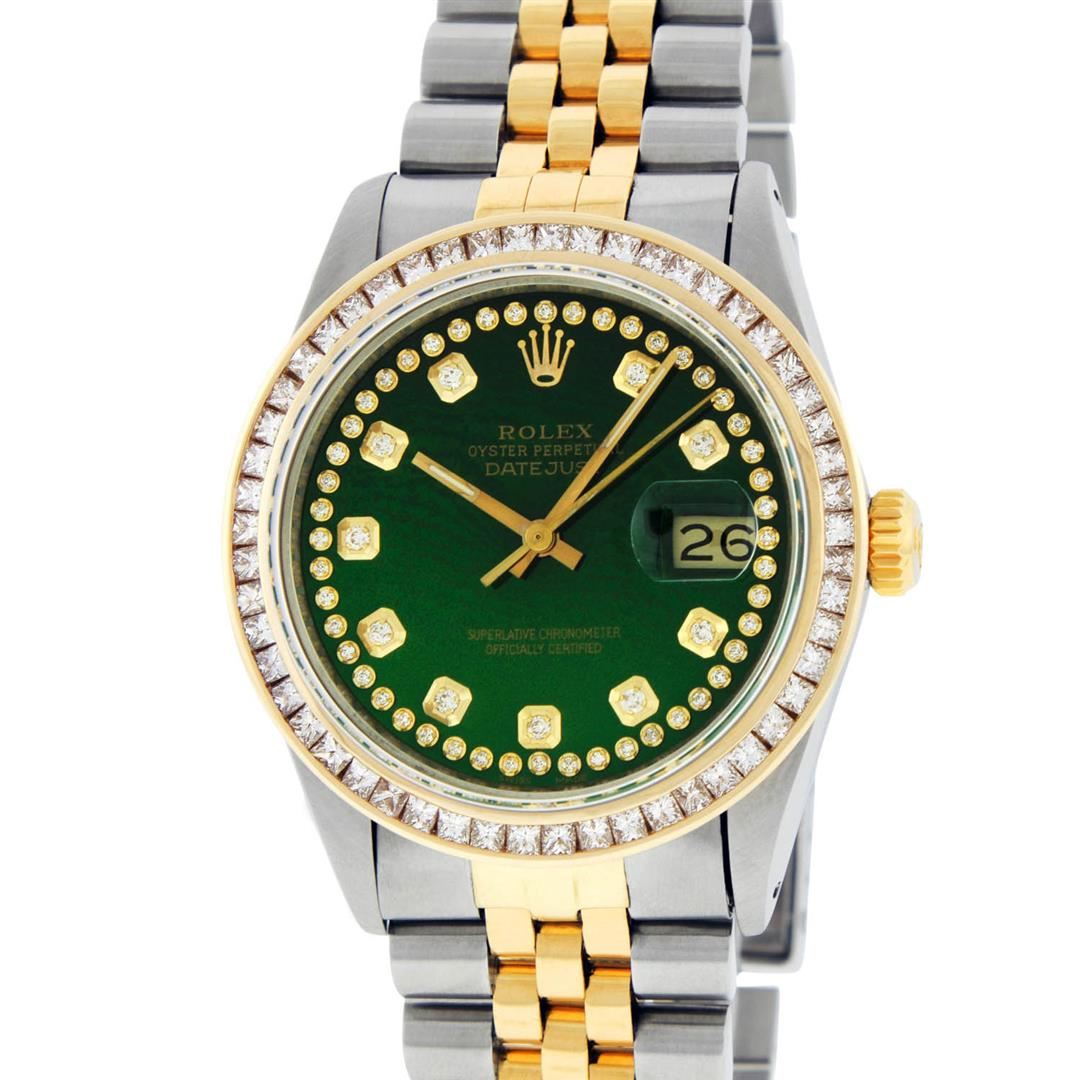 One Mens 14K Yellow Gold Two Tone Rolex Datejust Polished Bright with Satin Finish, Serviced & Electronically Tested, 14K Yellow Gold And Stainless Steel Case: 36mm, Yellow Gold Crown, Custom Bezel: New 14K Yellow Gold Princess Cut Diamond Bezel, Diamond Count: 53 Diamonds, Total Weight 2.75 Carat, Clarity: SI-VS, Color: G to H. Custom Crystal: New Synthetic Sapphire Cyclops Lens. Custom Hands: New Luminecent Hands. Movement: Automatic Winding Movement Caliber 3035. Custom Dial: Green String Diamond Dial, Diamond Count: 58 Diamond in Dial, Dial Color: G To H In Color, Clarity: VS2-SI1. Date Window: 3 O'Clock Position Date Display, Quickset, Model: 16013 Condition: G-6 Extra Fine. Bracelet: 14K Yellow Gold And Stainless Steel Jubilee. Bright Polish & Satin Finish. 7.0 Inch Length, Adjustable. Standard Clasp, With Rolex Logo. This Watch Has Been Serviced and Polished And It Is Free Of All Dents And Scratches And Has Been Time Tested.