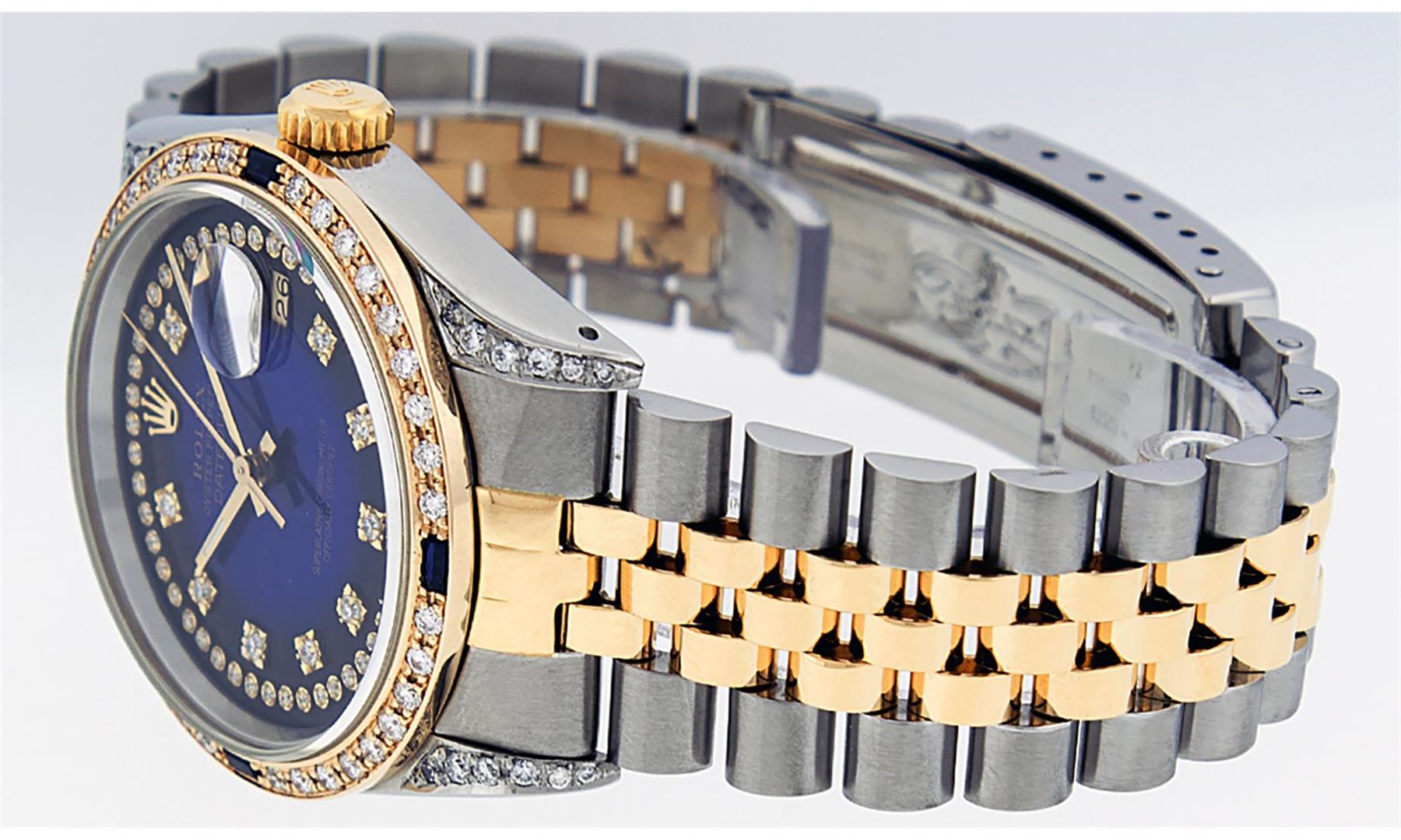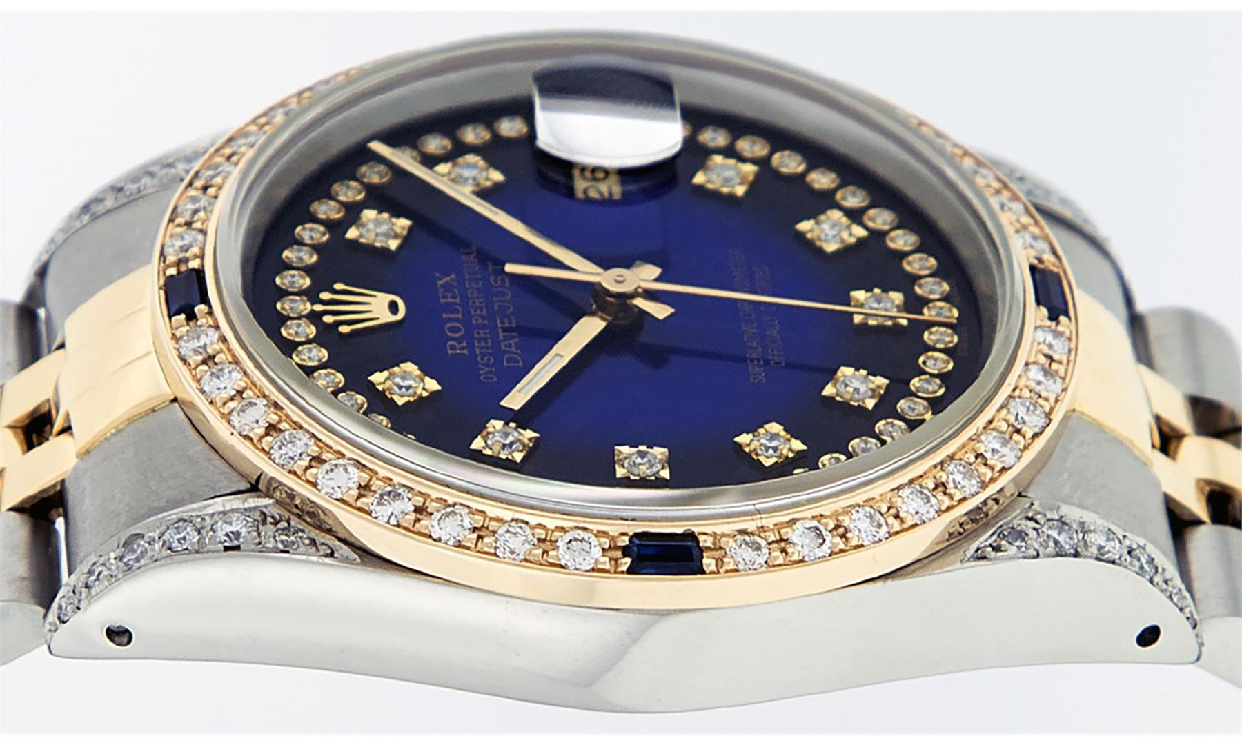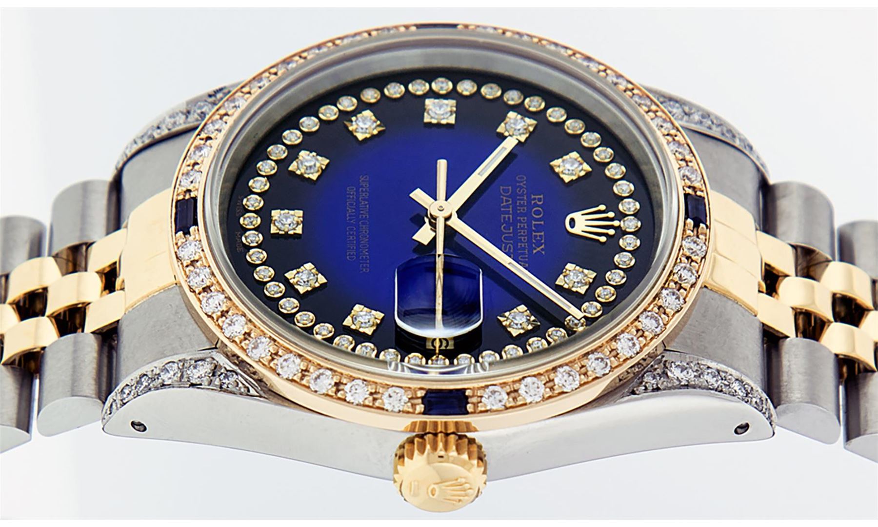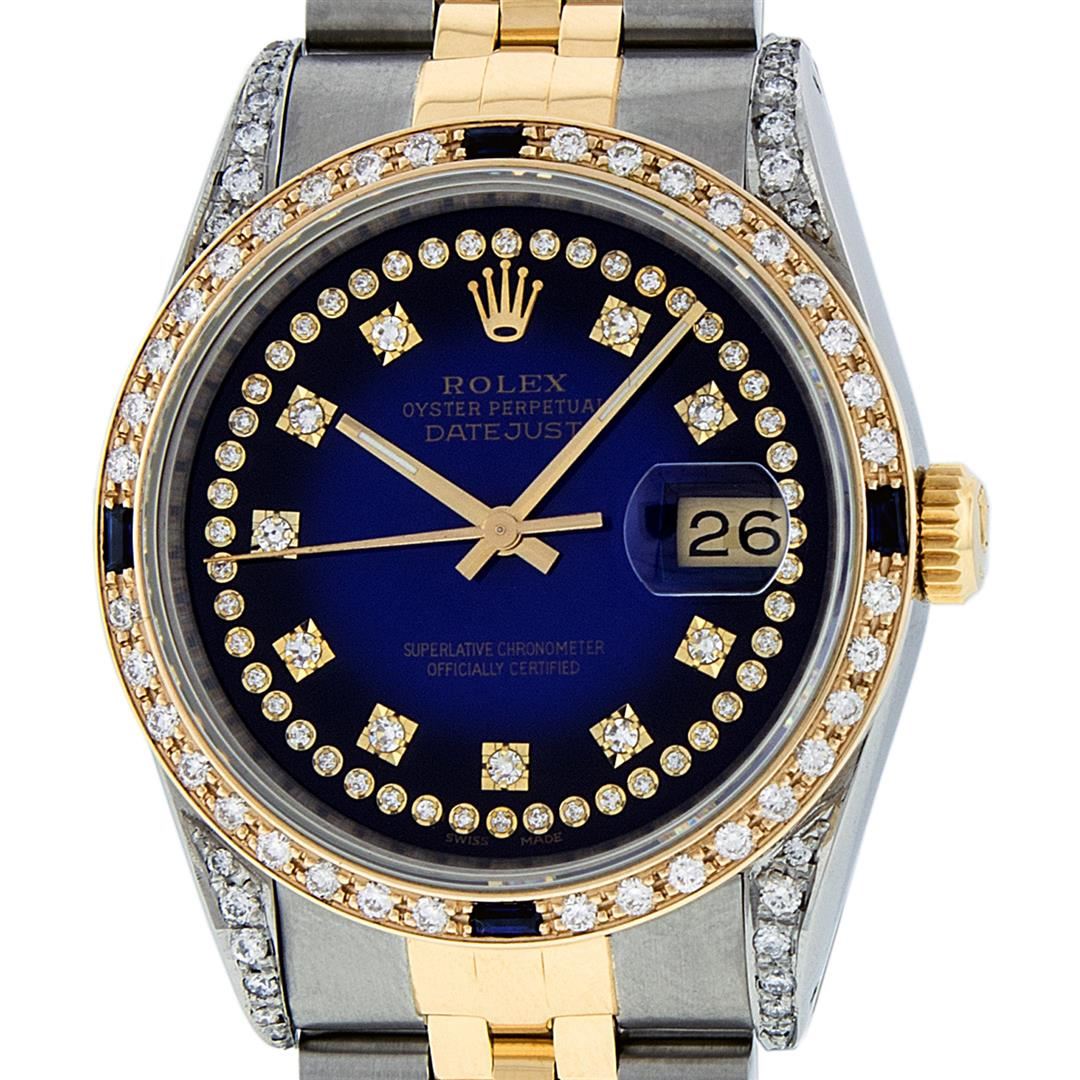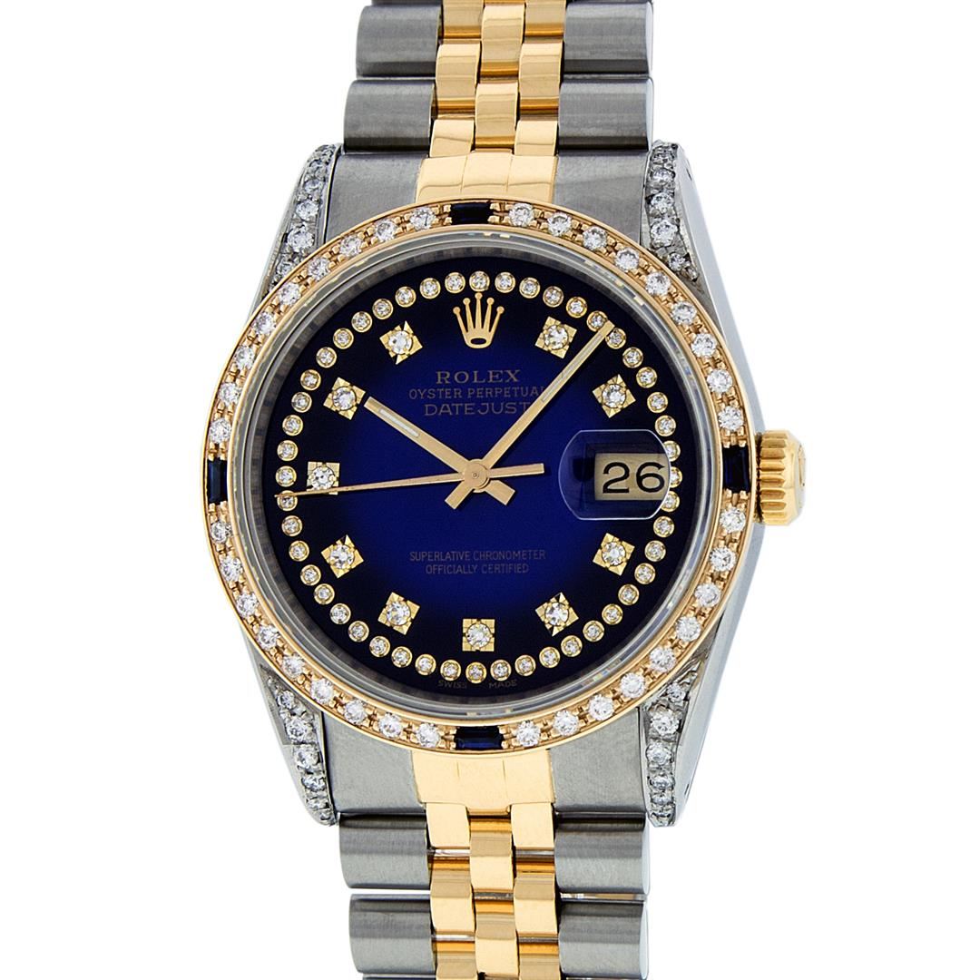 One Mens 14K Yellow Gold Rolex Datejust Polished Bright with Satin Finish, Serviced & Electronically Tested, Stainless Steel Case: 36mm, Custom Diamond Lugs: 28 Diamonds On Lugs, Color: G to H, Clarity: SI-VS. Yellow Gold Crown, Custom Bezel: New 18K Yellow Gold Beadset Diamond + Sapphire Bezel, Diamond + Stone Count: 36Diamonds + 4 Sapphires, Total Weight 1.00 Carat, Clarity: SI-VS, Color: G to H. Custom Crystal: New Scratch Resistant Synthetic Sapphire Cyclops Lens. Custom Hands: New Luminecent Hands. Movement: Automatic Winding Movement Caliber 3035. Custom Dial: Blue Vignette Single Cut String Diamond Dial, Stone Count: 58 Diamonds In Dial, Color: G to H, Clarity: VS2. Date Window: 3 O'Clock Position Date Display, Quickset, Model: 16013 Datejust. Condition: G-6 Extra Fine. Bracelet: 14K Yellow Gold And Stainless Steel Jubilee Band. Bright Polish & Satin Finish. 7.0 Inch Length, Adjustable. Standard Clasp, With Rolex Logo. This Watch Has Been Serviced And Polished It Is Free Of All Scratches And Dents.