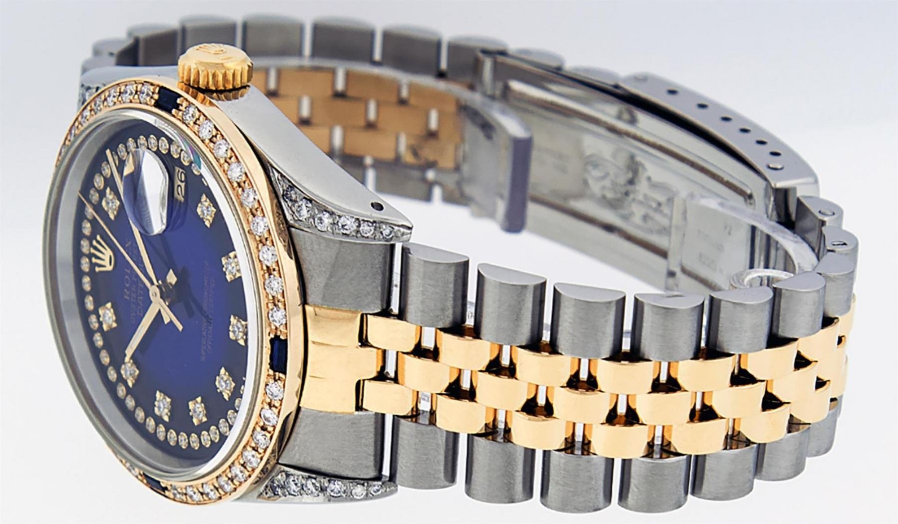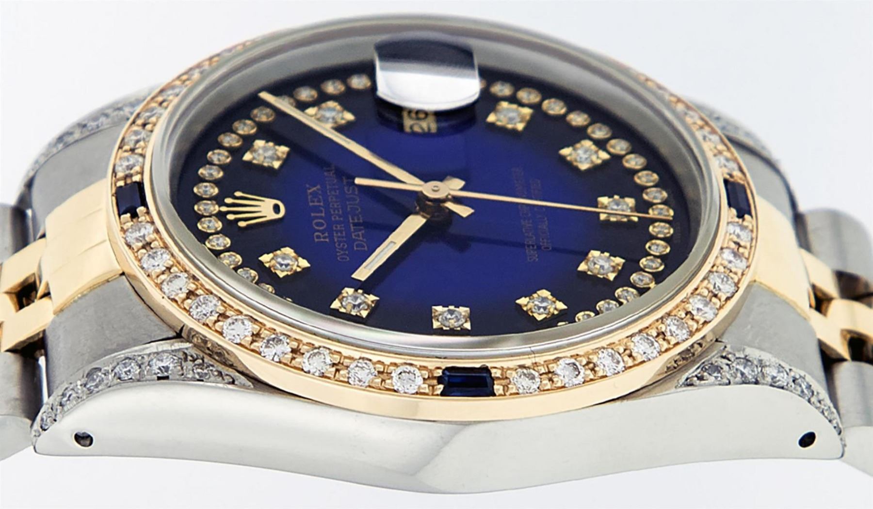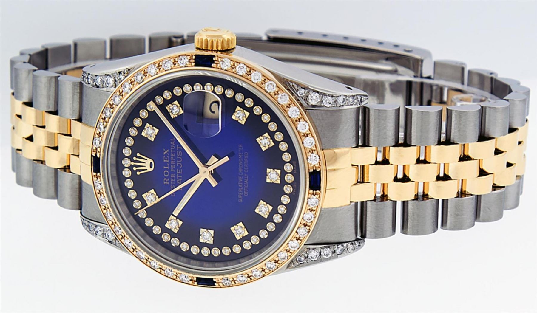 One Mens 14K Yellow Gold Rolex Datejust Polished Bright with Satin Finish, Serviced & Electronically Tested, Stainless Steel Case: 36mm, Custom Diamond Lugs: 28 Diamonds On Lugs, Color: G to H, Clarity: SI-VS. Yellow Gold Crown, Custom Bezel: New 18K Yellow Gold Beadset Diamond + Sapphire Bezel, Diamond + Stone Count: 36Diamonds + 4 Sapphires, Total Weight 1.00 Carat, Clarity: SI-VS, Color: G to H. Custom Crystal: New Scratch Resistant Synthetic Sapphire Cyclops Lens. Custom Hands: New Luminecent Hands. Movement: Automatic Winding Movement Caliber 3035. Custom Dial: Blue Vignette Single Cut String Diamond Dial, Stone Count: 58 Diamonds In Dial, Color: G to H, Clarity: VS2. Date Window: 3 O'Clock Position Date Display, Quickset, Model: 16013 Datejust. Condition: G-6 Extra Fine. Bracelet: 14K Yellow Gold And Stainless Steel Jubilee Band. Bright Polish & Satin Finish. 7.0 Inch Length, Adjustable. Standard Clasp, With Rolex Logo. This Watch Has Been Serviced And Polished It Is Free Of All Scratches And Dents.
