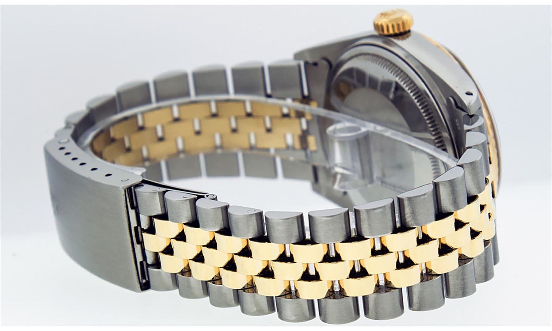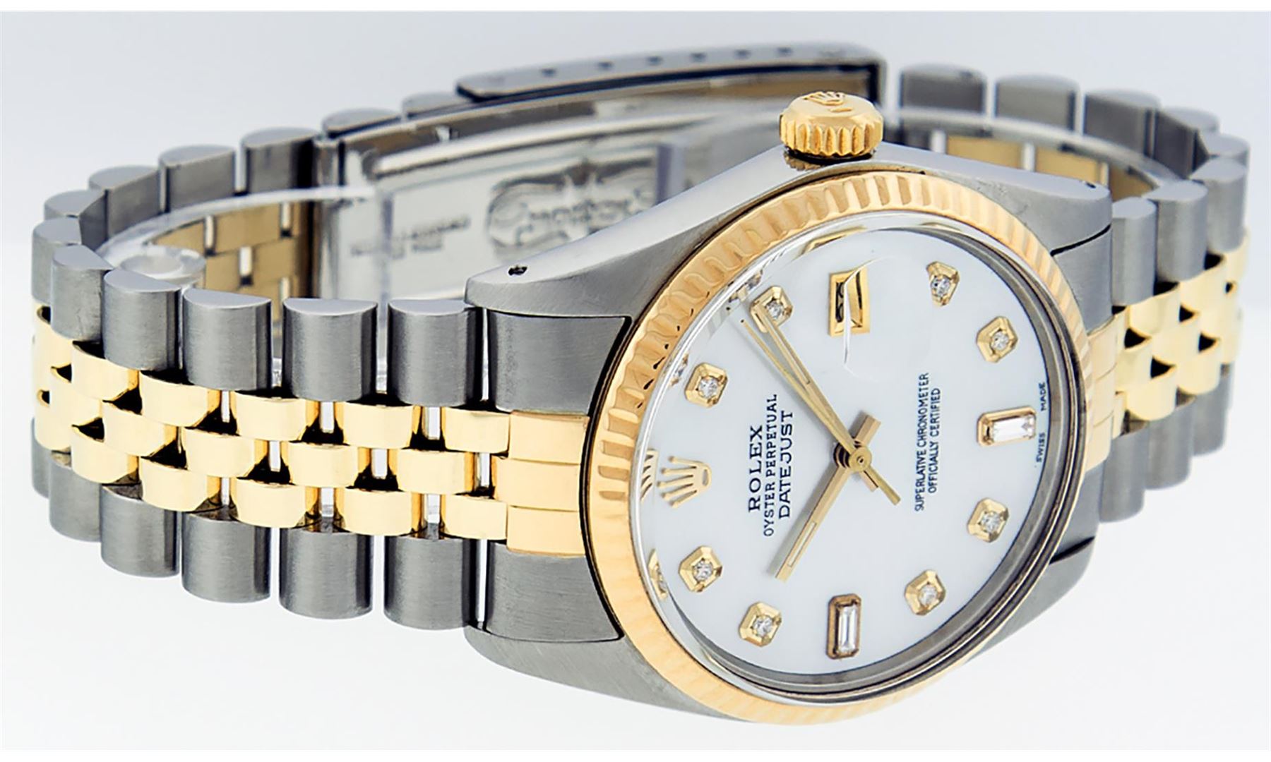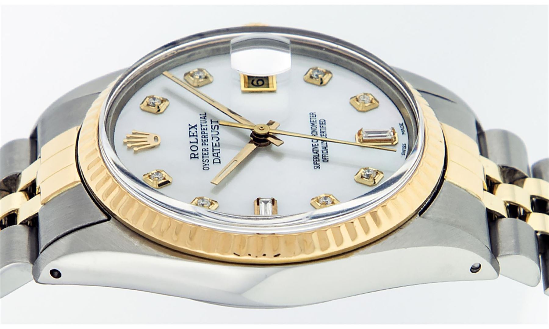 One Mens 14K Yellow Gold Two Tone Rolex Datejust Polished, Serviced & Electronically Tested, 14K Yellow Gold & Stainless Steel Case: 36mm, 14K Yellow Gold Crown, Bezel: 14K Yellow Gold Fluted Bezel. Custom Crystal: New Acrylic Cyclops Lens. Custom Hands: New Luminecent Hands. Movement: Automatic Winding Movement Caliber 3035. Custom Dial: Mother Of Pearl Diamond Dial, Stone Count: 8 Diamonds + 2 Diamond Baguettes in Dial, G To H In Color, SI-VS Clarity. Date Window: 3 O'Clock Position Date Display, Quickset, Model: 16013 Datejust. Condition: G-6 Extra Fine. Bracelet: Two Tone 14K Yellow Gold & Stainless Steel Jubilee. Bright Polish. 7.0 Inch Length, Adjustable. Standard Clasp, With Rolex Logo. This Watch Has Been Serviced And Polished It Is Free Of All Scratches And Dents.