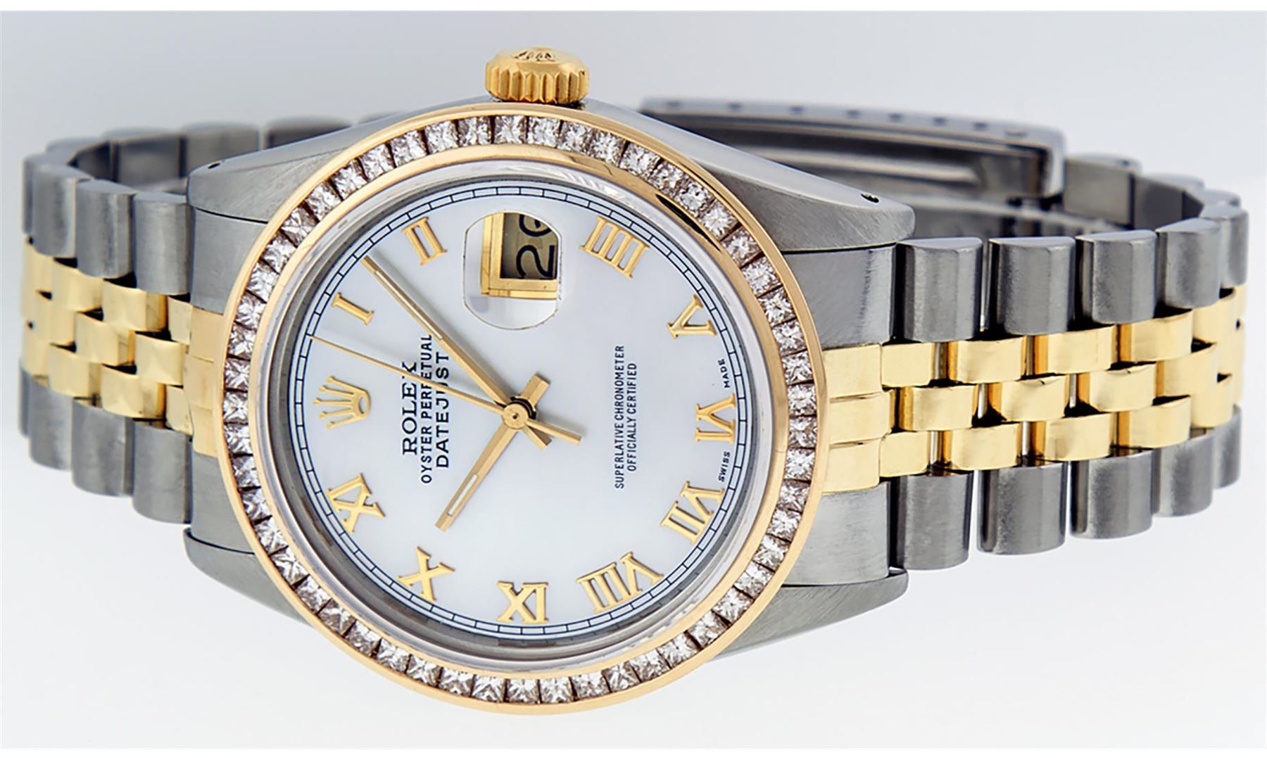One Mens 14K Yellow Gold Two Tone Rolex Datejust Polished Bright with Satin Finish, Serviced & Electronically Tested, 14K Yellow Gold And Stainless Steel Case: 36mm, 14K Yellow Gold Crown, Custom Bezel: New 14K Yellow Gold Princess Cut Diamond Bezel, Diamond Count: 53 Diamonds, Total Weight 2.75 Carat, Clarity: SI-VS, Color: G to H. Custom Crystal: New Scratch Resistant Synthetic Sapphire Cyclops Lens. Custom Hands: New Luminecent Hands. Movement: Automatic Winding Movement Caliber 3035. Custom Dial: Mother Of Pearl Roman Dial With Square Track. Date Window: 3 O'Clock Position Date Display, Quickset, Model: 16013 Datejust. Condition: G-6 Extra Fine. Bracelet: 14K Yellow Gold And Stainless Steel Jubilee Band. Bright Polish & Satin Finish. 7.0 Inch Length, Adjustable. Standard Clasp, With Rolex Logo. This Watch Has Been Serviced and Polished And It Is Free Of All Dents And Scratches And Has Been Time Tested.