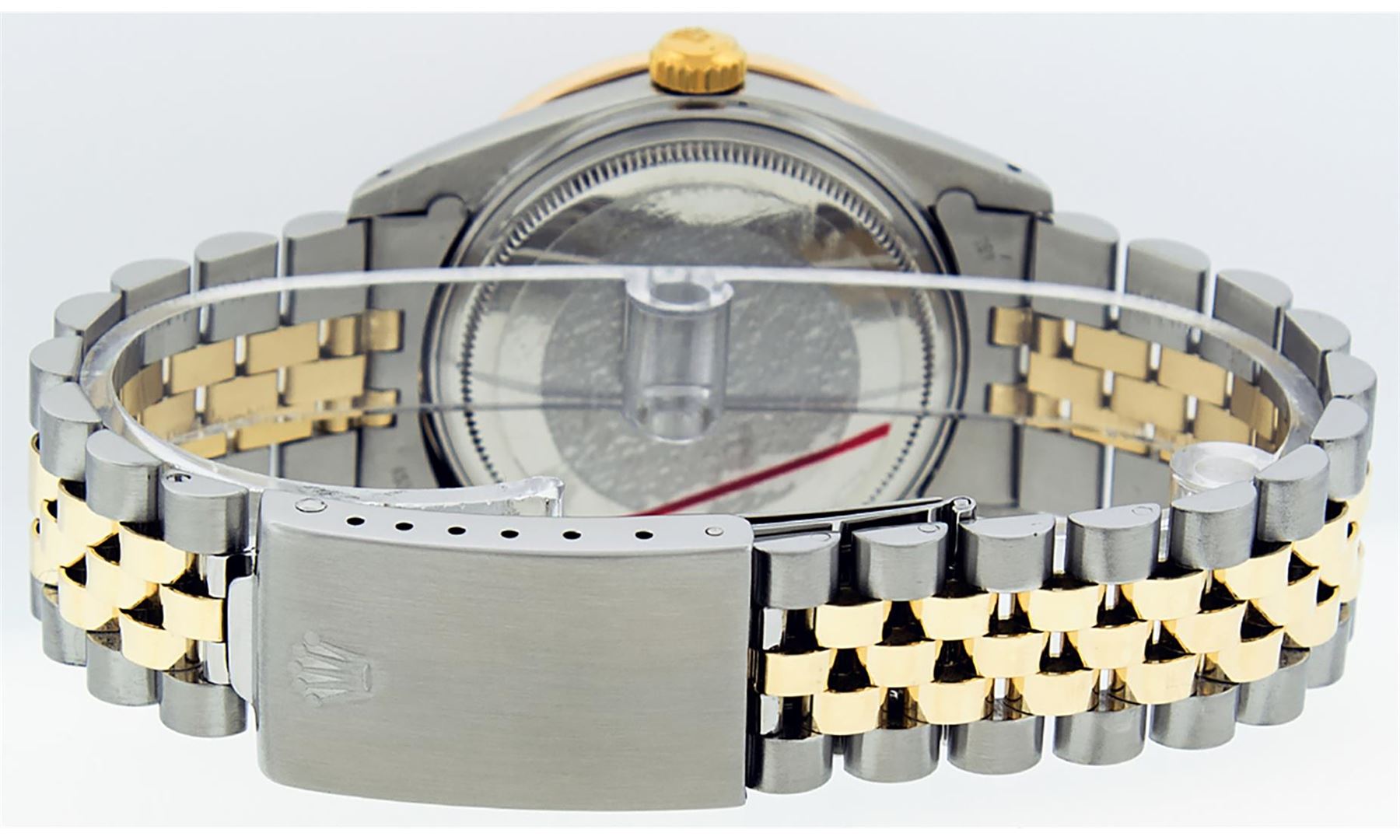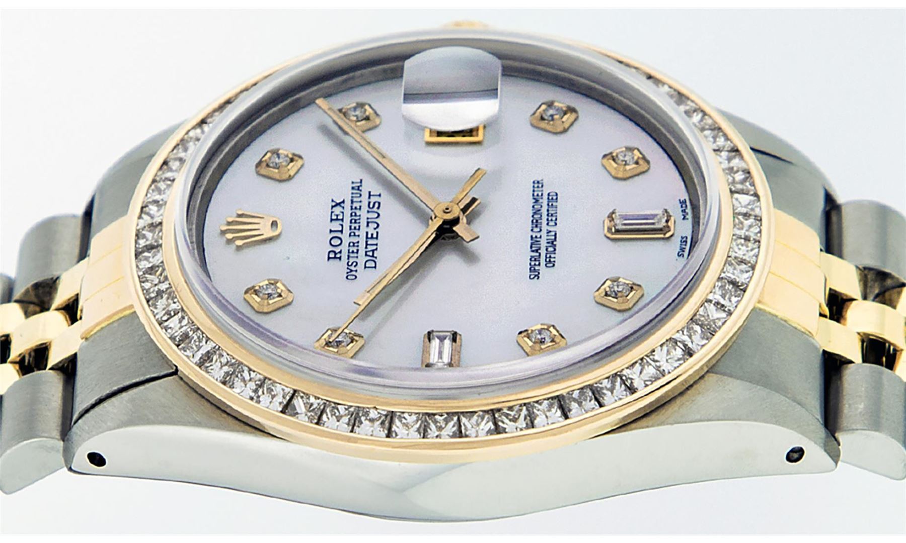 One Mens 14K Yellow Gold Two Tone Rolex Datejust Polished Bright with Satin Finish, Serviced & Electronically Tested, 14K Yellow Gold And Stainless Steel Case: 36mm, 14K Yellow Gold Crown, Custom Bezel: New 14K Yellow Gold Princess Cut Diamond Bezel, Diamond Count: 53 Diamonds In Bezel, Total Weight 2.75 Carat, Clarity: SI-VS, Color: G to H. Custom Crystal: New Scratch Resistant Synthetic Sapphire Cyclops Lens. Custom Hands: New Luminecent Hands. Movement: Automatic Winding Movement Caliber 3035. Custom Dial: Mother Of Pearl 8 + 2 Diamond Dial, Diamond Count: 8 + 2 Baguette Diamonds in Dial, Dial Color: G To H In Color, Clarity: VS2. Date Window: 3 O'Clock Position Date Display, Quickset, Model: 16013 Datejust. Condition: G-6 Extra Fine. Bracelet: 14K Yellow Gold And Stainless Steel Jubilee Band. Bright Polish & Satin Finish. 7.0 Inch Length, Adjustable. Standard Clasp, With Rolex Logo. This Watch Has Been Serviced and Polished And It Is Free Of All Dents And Scratches And Has Been Time Tested.