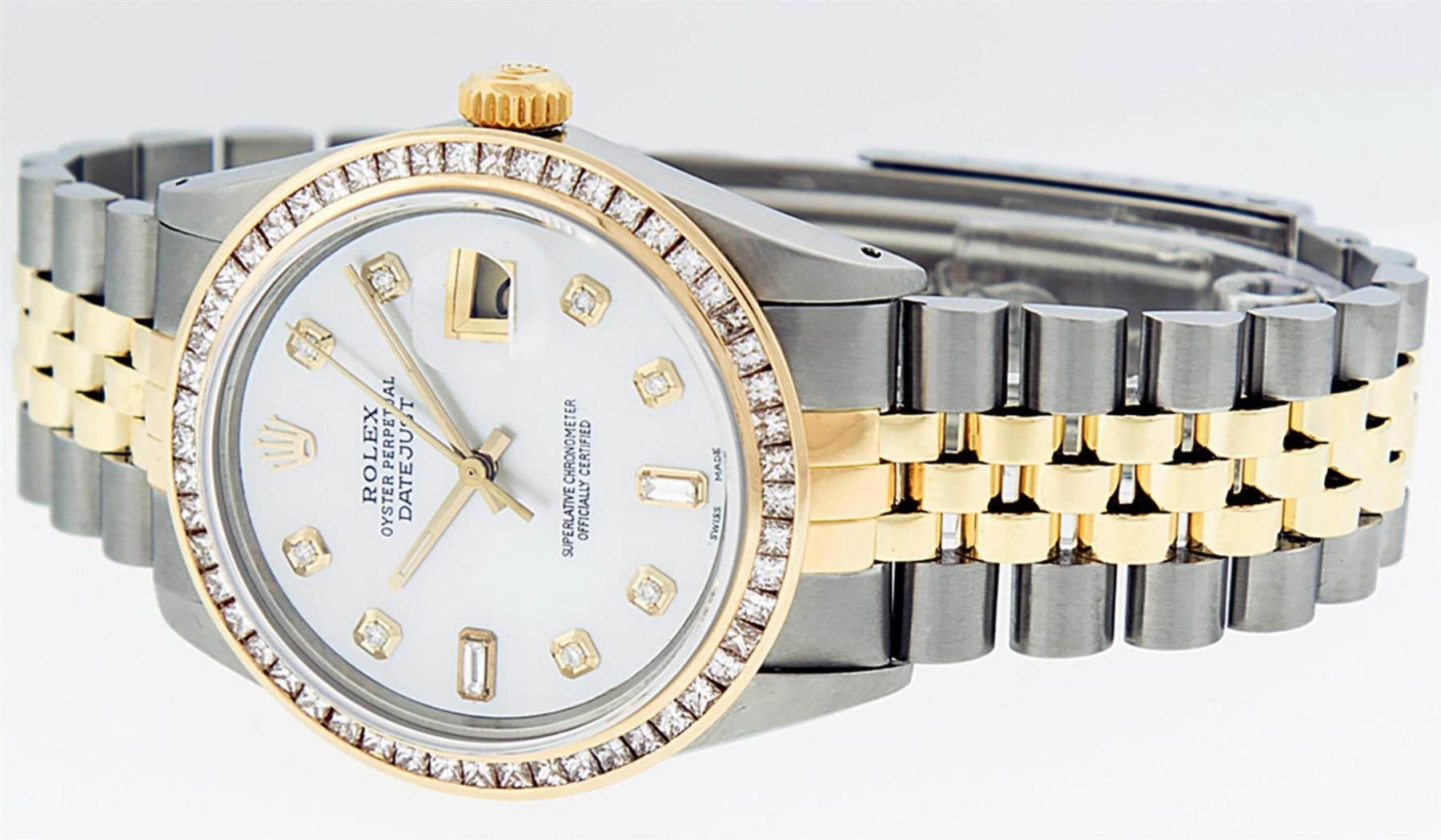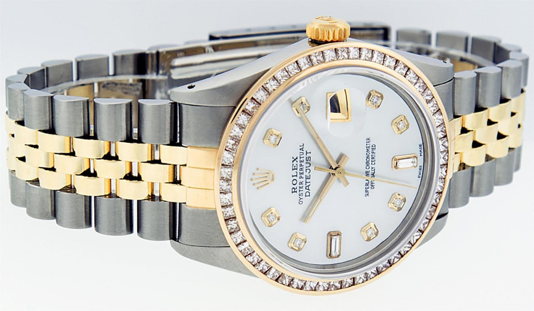 One Mens 14K Yellow Gold Two Tone Rolex Datejust Polished Bright with Satin Finish, Serviced & Electronically Tested, 14K Yellow Gold And Stainless Steel Case: 36mm, 14K Yellow Gold Crown, Custom Bezel: New 14K Yellow Gold Princess Cut Diamond Bezel, Diamond Count: 53 Diamonds In Bezel, Total Weight 2.75 Carat, Clarity: SI-VS, Color: G to H. Custom Crystal: New Scratch Resistant Synthetic Sapphire Cyclops Lens. Custom Hands: New Luminecent Hands. Movement: Automatic Winding Movement Caliber 3035. Custom Dial: Mother Of Pearl 8 + 2 Diamond Dial, Diamond Count: 8 + 2 Baguette Diamonds in Dial, Dial Color: G To H In Color, Clarity: VS2. Date Window: 3 O'Clock Position Date Display, Quickset, Model: 16013 Datejust. Condition: G-6 Extra Fine. Bracelet: 14K Yellow Gold And Stainless Steel Jubilee Band. Bright Polish & Satin Finish. 7.0 Inch Length, Adjustable. Standard Clasp, With Rolex Logo. This Watch Has Been Serviced and Polished And It Is Free Of All Dents And Scratches And Has Been Time Tested.