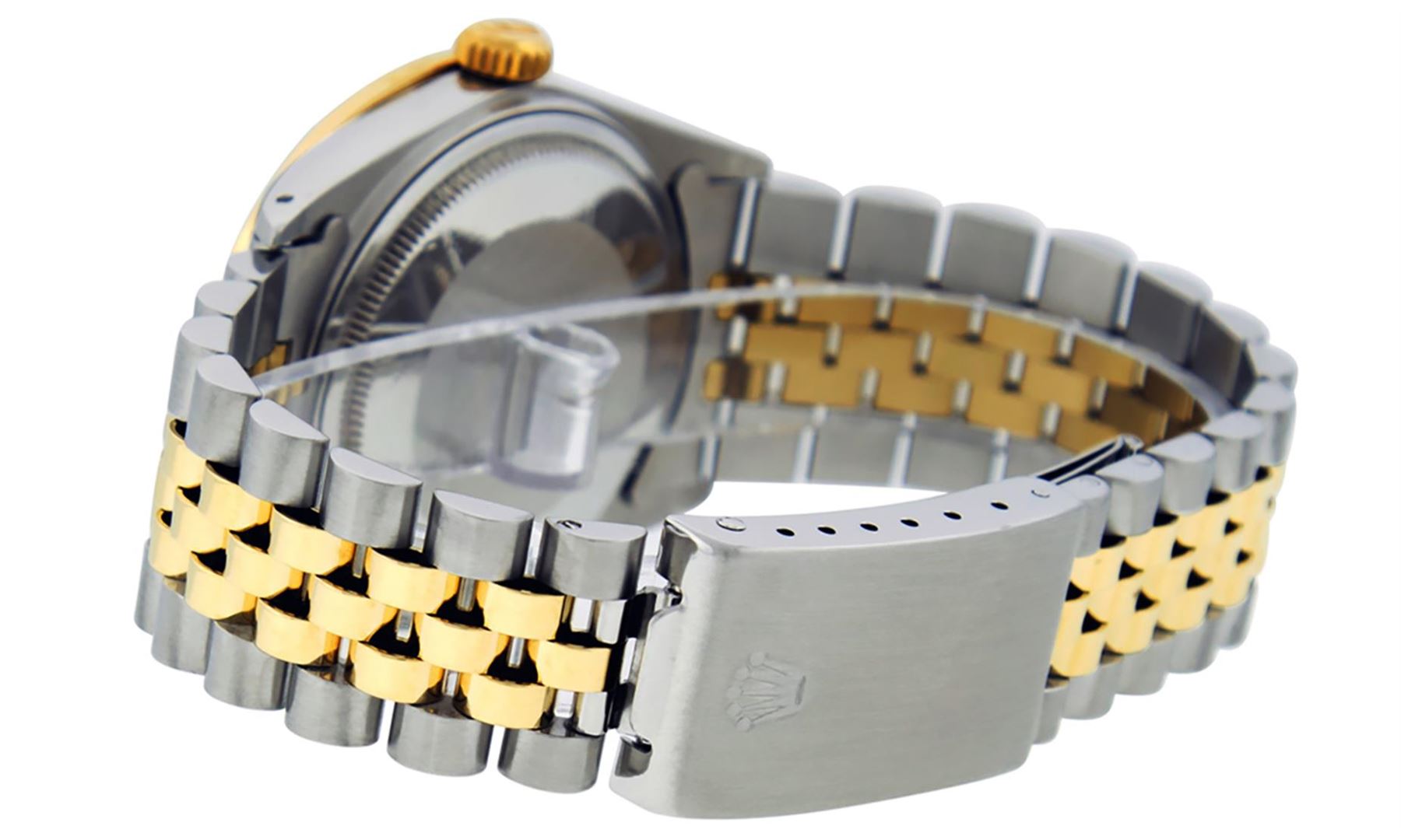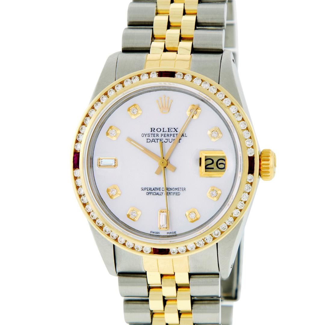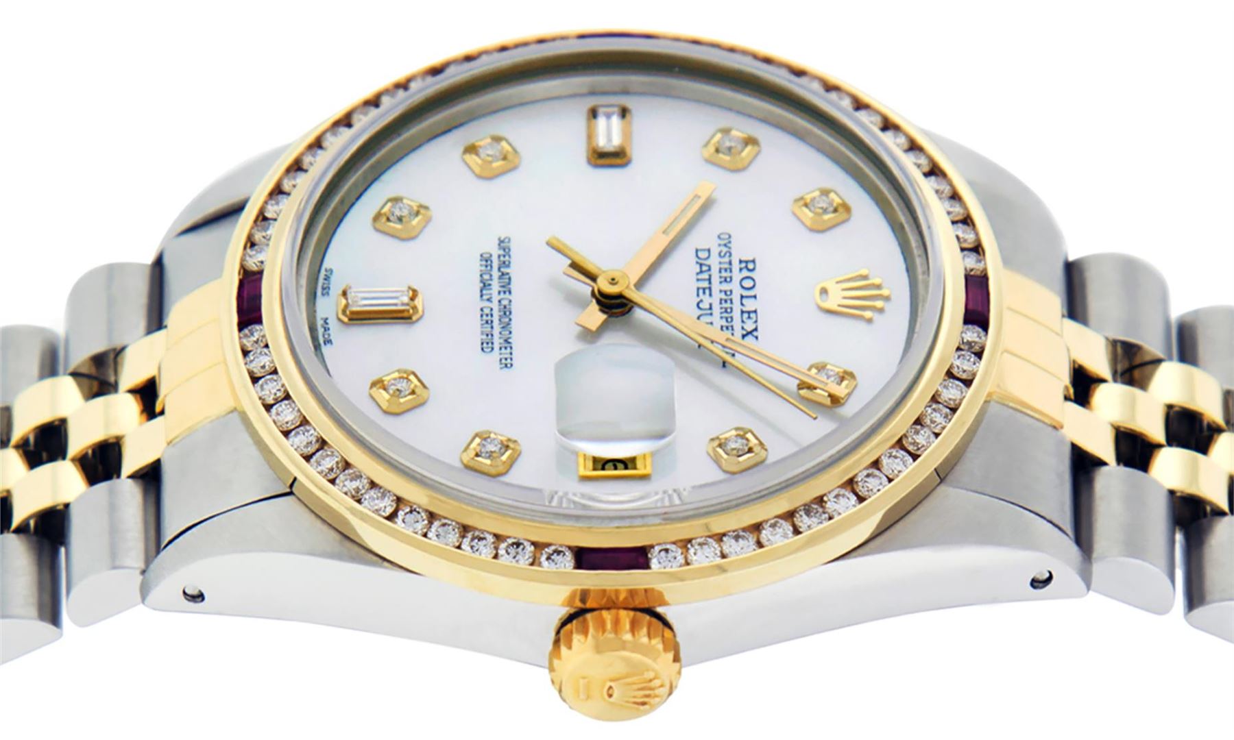 One Mens 14K Yellow Gold Two Tone Rolex Datejust Polished, Serviced & Electronically Tested, 14K Yellow Gold & Stainless Steel Case: 36mm, 14K Yellow Gold Crown, Custom Bezel: 18K Yellow Gold Ruby Channel Set Diamond Bezel, Diamond Count: 52 Diamonds + 4 Rubies, Total Weight 1.30 Carat, Clarity: SI-VS, Color: G to H. Custom Crystal: New Scratch Resistant Synthetic Sapphire Cyclops Lens. Custom Hands: New Luminecent Hands. Movement: Automatic Winding Movement Caliber 3035. Custom Dial: Mother Of Pearl Diamond Dial, Stone Count: 8 Diamonds + 2 Baguette Diamonds In Dial. Date Window: 3 O'Clock Position Date Display, Quickset, Model: 16013 Condition: G-6 Extra Fine. Bracelet: Two Tone 14K Yellow Gold & Stainless Steel Jubilee. Bright Polish. 7.0 Inch Length, Adjustable. Standard Clasp, With Rolex Logo. This Watch Has Been Serviced Time Tested And Is In Excellent Condition It Is Free Of All Scratches And Dents.