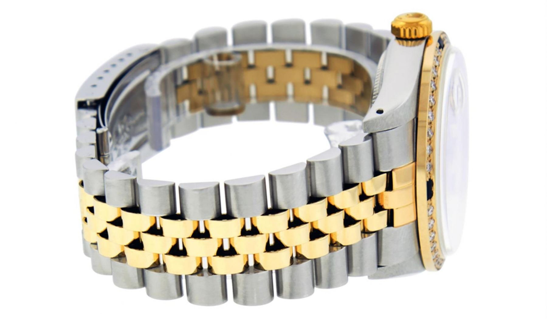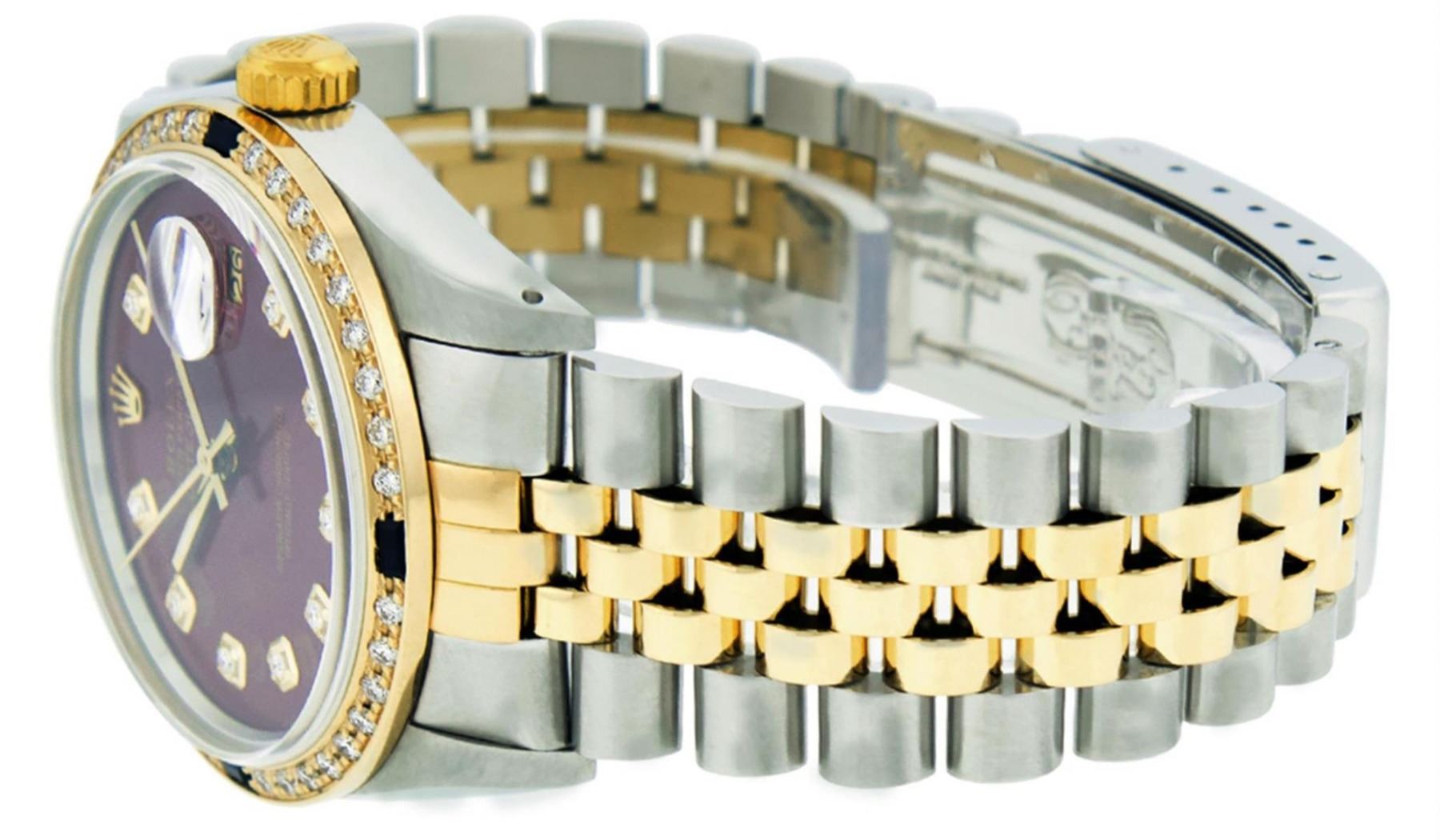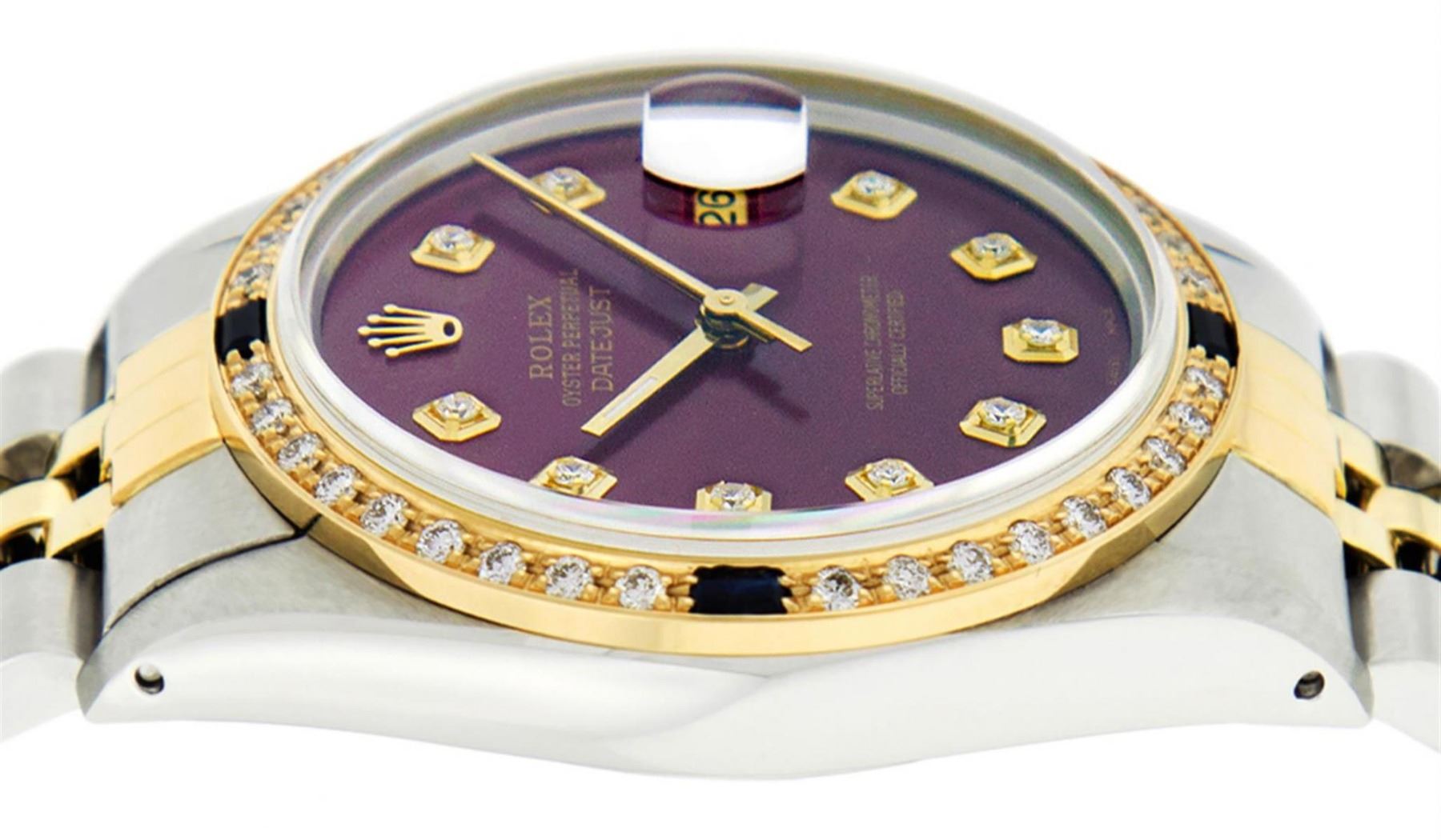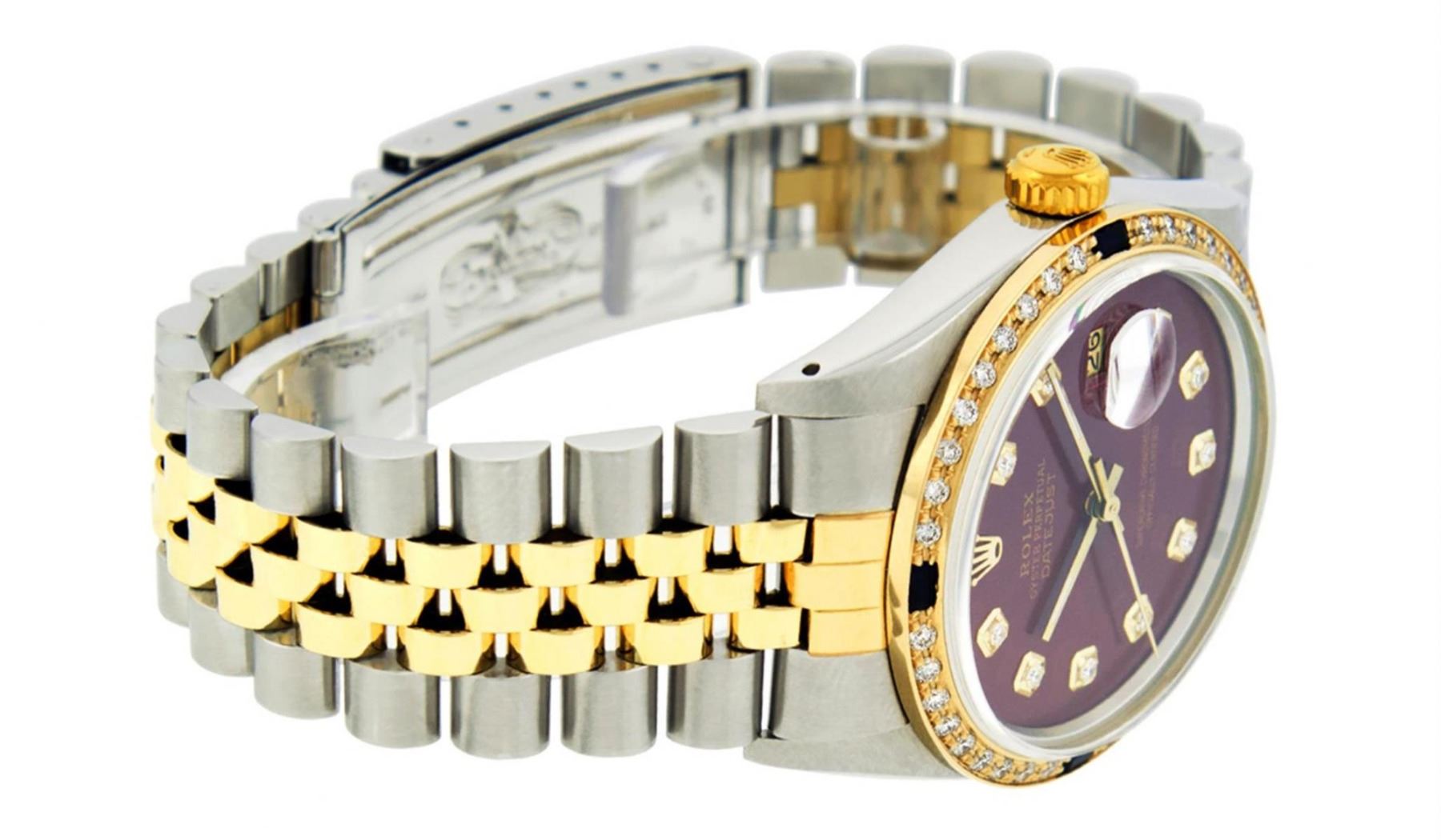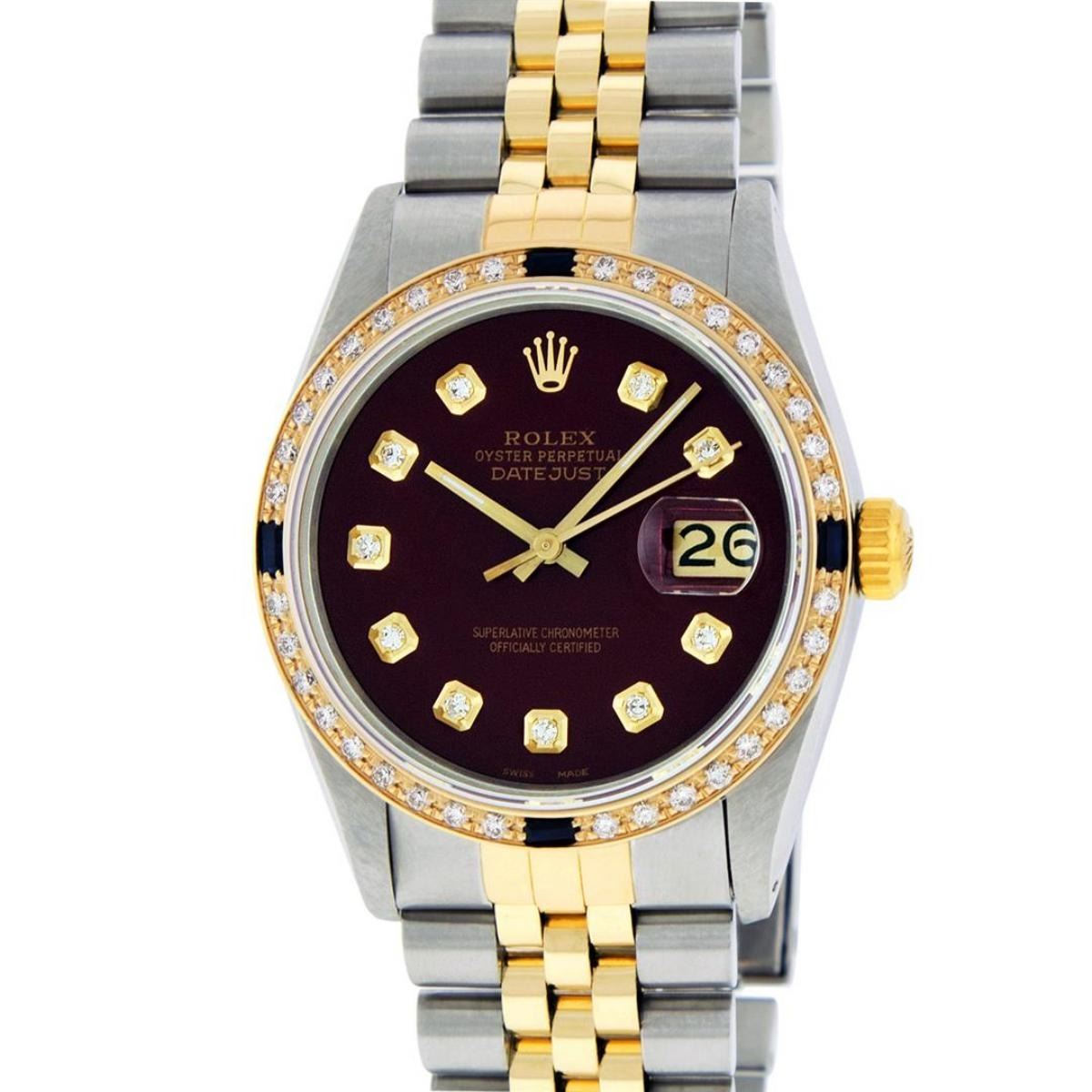 One Mens 14K Yellow Gold Two Tone Rolex Datejust Polished, Serviced & Electronically Tested, 14K Yellow Gold & Stainless Steel Case: 36mm, 14K Yellow Gold Crown, Custom Bezel: New 18K Yellow Gold Sapphire Beadset Diamond Bezel, Stone Count: 36 Diamonds + 4 Sapphires, Total Weight 1.00 Carat, Clarity: SI-VS, Color: G to H. Custom Crystal: New Synthetic Sapphire Cyclops Lens. Custom Hands: New Luminecent Hands. Movement: Automatic Winding Movement Caliber 3035. Custom Dial: Maroon Diamond Dial, Diamond Count: 10 Diamonds, Clarity: VS, Color: G to H. Date Window: 3 O'Clock Position Date Display, Quickset, Model: 16013 Datejust. Condition: G-6 Extra Fine. Bracelet: Two Tone 14K Yellow Gold & Stainless Steel Jubilee. Bright Polish. 7.0 Inch Length, Adjustable. Standard Clasp, With Rolex Logo. This Watch Has Been Serviced Time Tested And Is In Excellent Condition It Is Free Of All Scratches And Dents.
