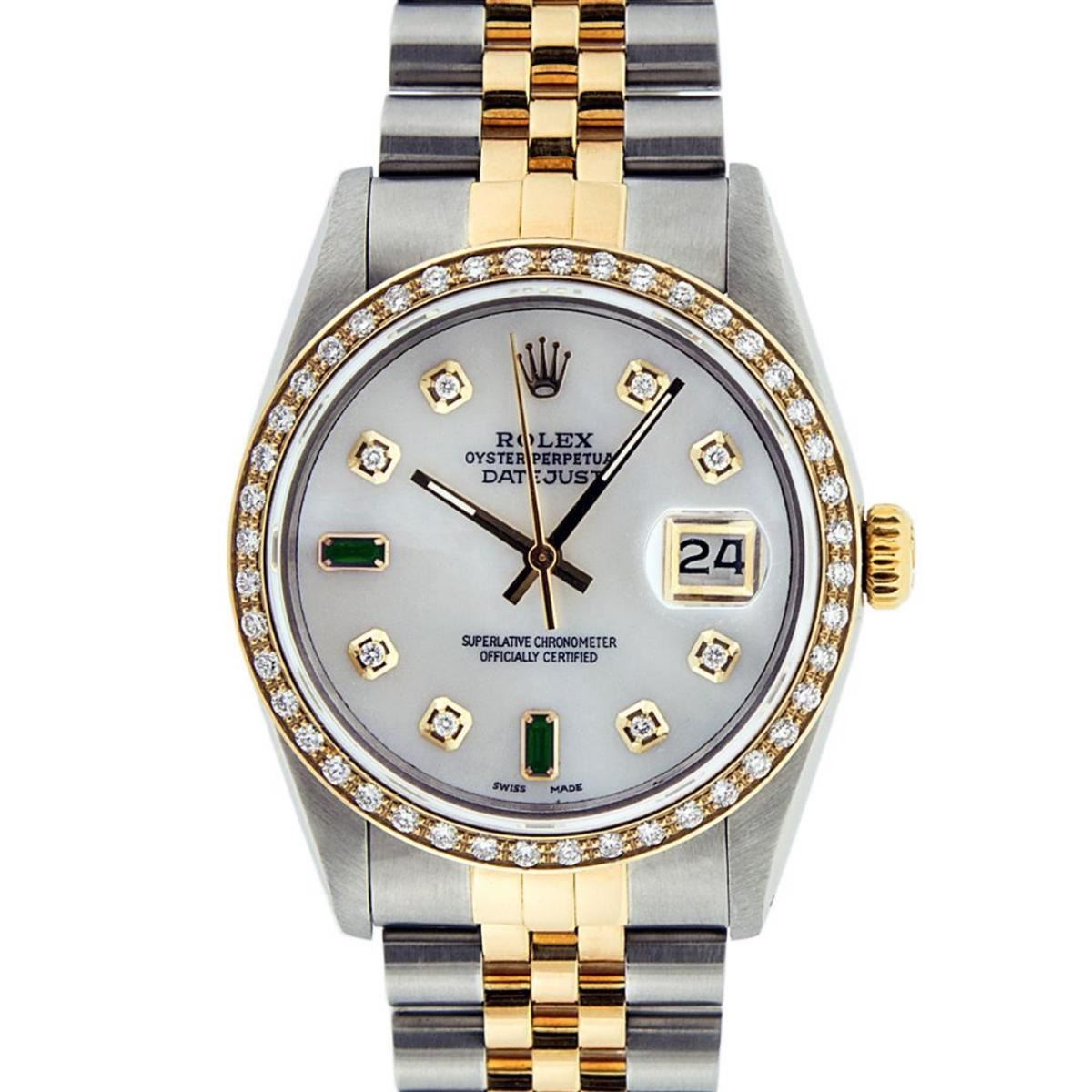One Mens 14K Yellow Gold Two Tone Rolex Datejust Polished, Serviced & Electronically Tested, 14K Yellow Gold & Stainless Steel Case: 36mm, 14K Yellow Gold Crown, Custom Bezel: New 18K Yellow Gold Beadset Diamond Bezel, Diamond Count: 44 Diamonds, Total Weight 1.00 Carat, Clarity: SI-VS, Color: G to H. Custom Crystal: New Scratch Resisitant Synthetic Sapphire Cyclops Lens. Movement: Automatic Winding Movement Caliber 3035. Custom Dial: Mother Of Pearl Dial Set With Diamond Hour Markers and Synthetic Emerald Baguette Markers On 6 and 9, Stone Count: 8 + 2 Synthetic Emerald Bagguettes, Color: G To H In Color, Clarity: SI-VS, Date Window: 3 O'Clock Position Date Display, Quickset, Model: 16013 Datejust. Condition: G-6 Extra Fine. Bracelet: Two Tone 14K Yellow Gold & Stainless Steel Jubilee. Bright Polish. 7.0 Inch Length, Adjustable. Standard Clasp, With Rolex Logo. This Watch Has Been Serviced Time Tested And Is In Excellent Condition It Is Free Of All Scratches And Dents.
