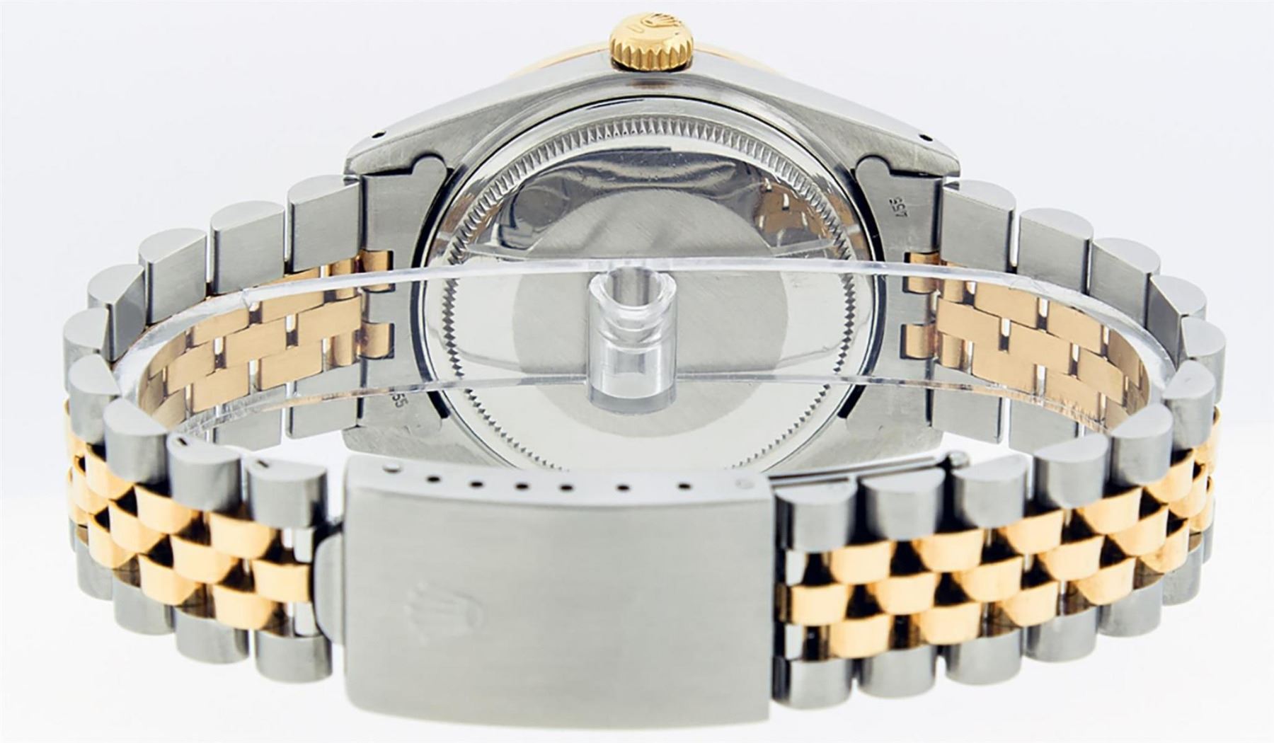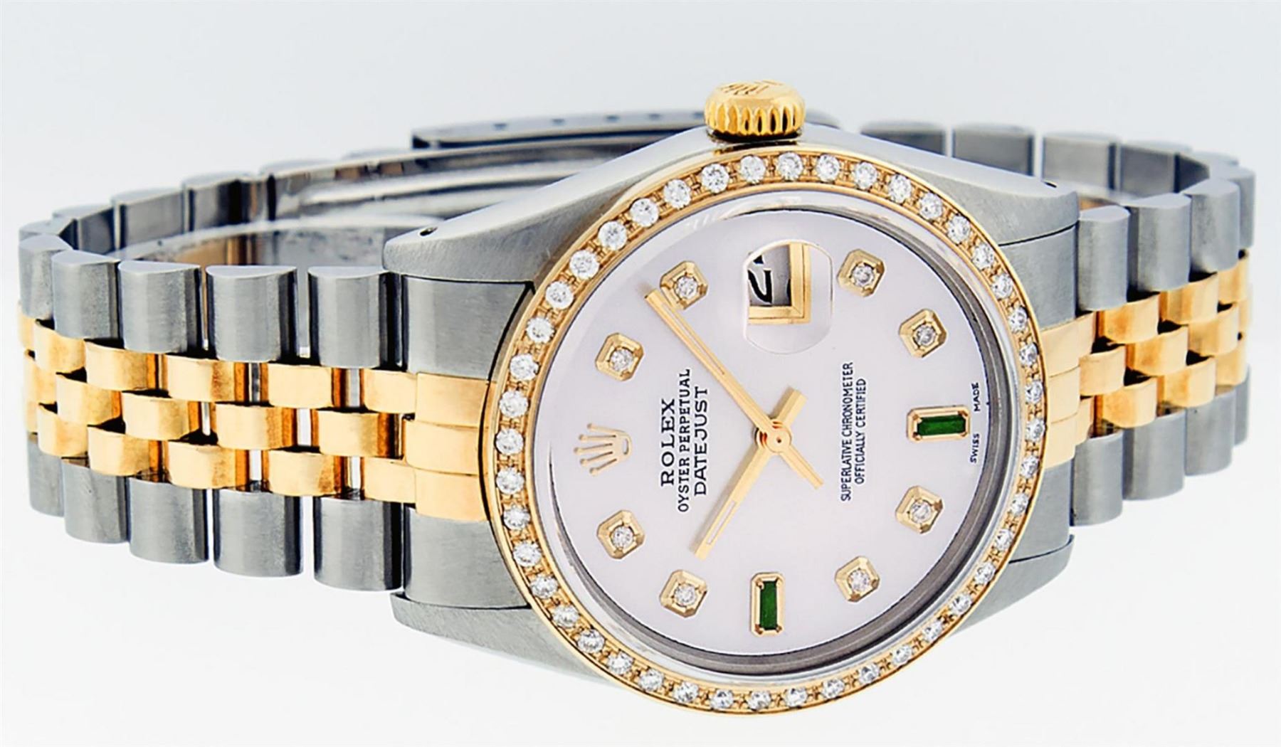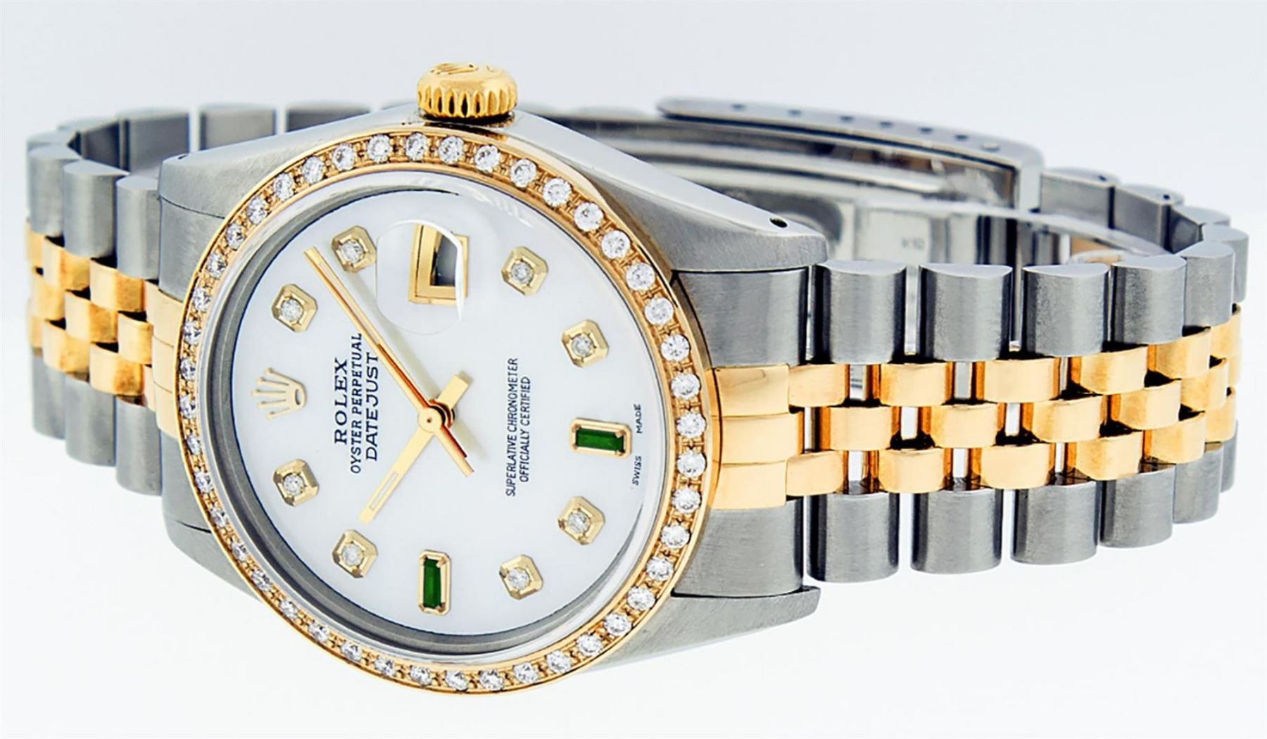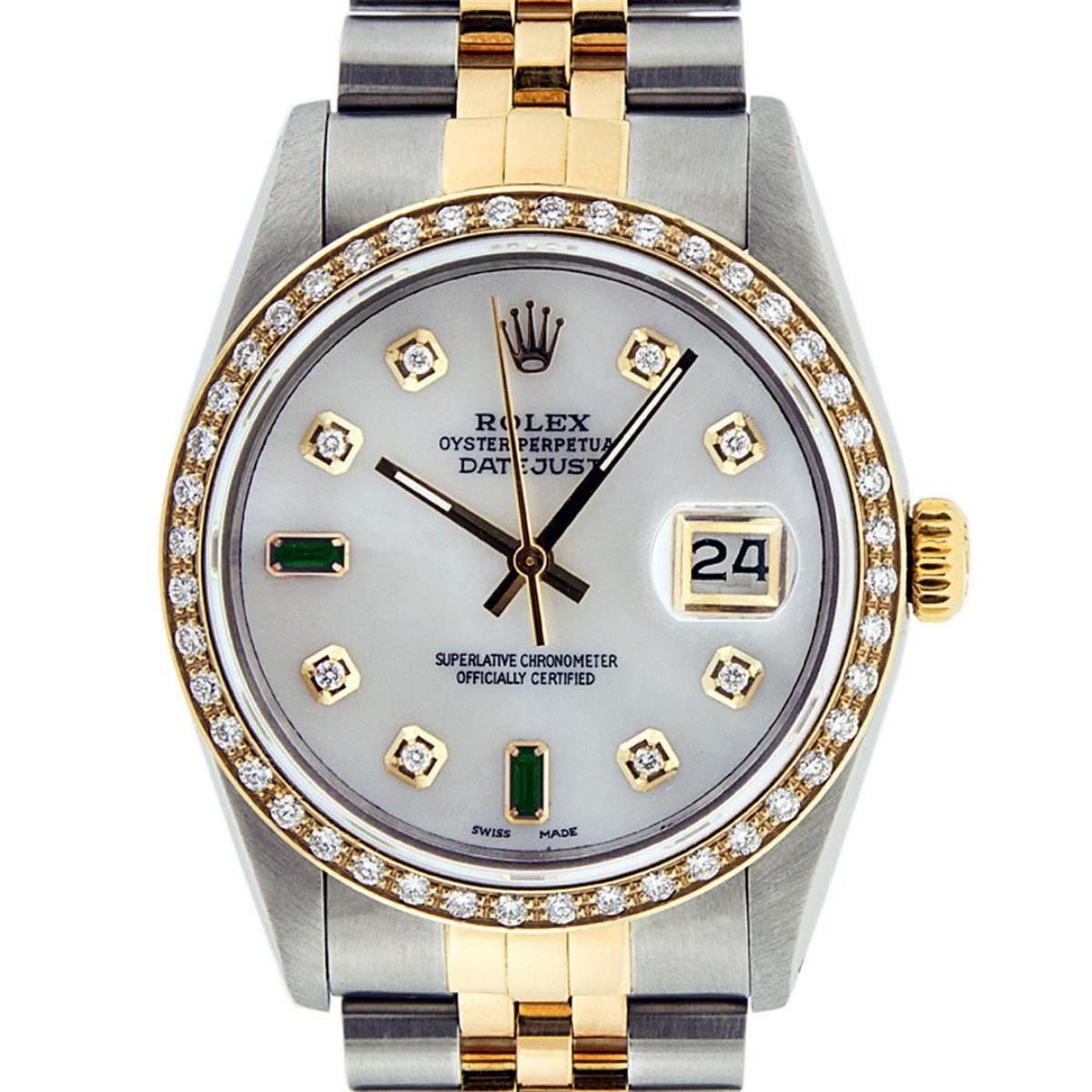 One Mens 14K Yellow Gold Two Tone Rolex Datejust Polished, Serviced & Electronically Tested, 14K Yellow Gold & Stainless Steel Case: 36mm, 14K Yellow Gold Crown, Custom Bezel: New 18K Yellow Gold Beadset Diamond Bezel, Diamond Count: 44 Diamonds, Total Weight 1.00 Carat, Clarity: SI-VS, Color: G to H. Custom Crystal: New Scratch Resisitant Synthetic Sapphire Cyclops Lens. Movement: Automatic Winding Movement Caliber 3035. Custom Dial: Mother Of Pearl Dial Set With Diamond Hour Markers and Synthetic Emerald Baguette Markers On 6 and 9, Stone Count: 8 + 2 Synthetic Emerald Bagguettes, Color: G To H In Color, Clarity: SI-VS, Date Window: 3 O'Clock Position Date Display, Quickset, Model: 16013 Datejust. Condition: G-6 Extra Fine. Bracelet: Two Tone 14K Yellow Gold & Stainless Steel Jubilee. Bright Polish. 7.0 Inch Length, Adjustable. Standard Clasp, With Rolex Logo. This Watch Has Been Serviced Time Tested And Is In Excellent Condition It Is Free Of All Scratches And Dents.