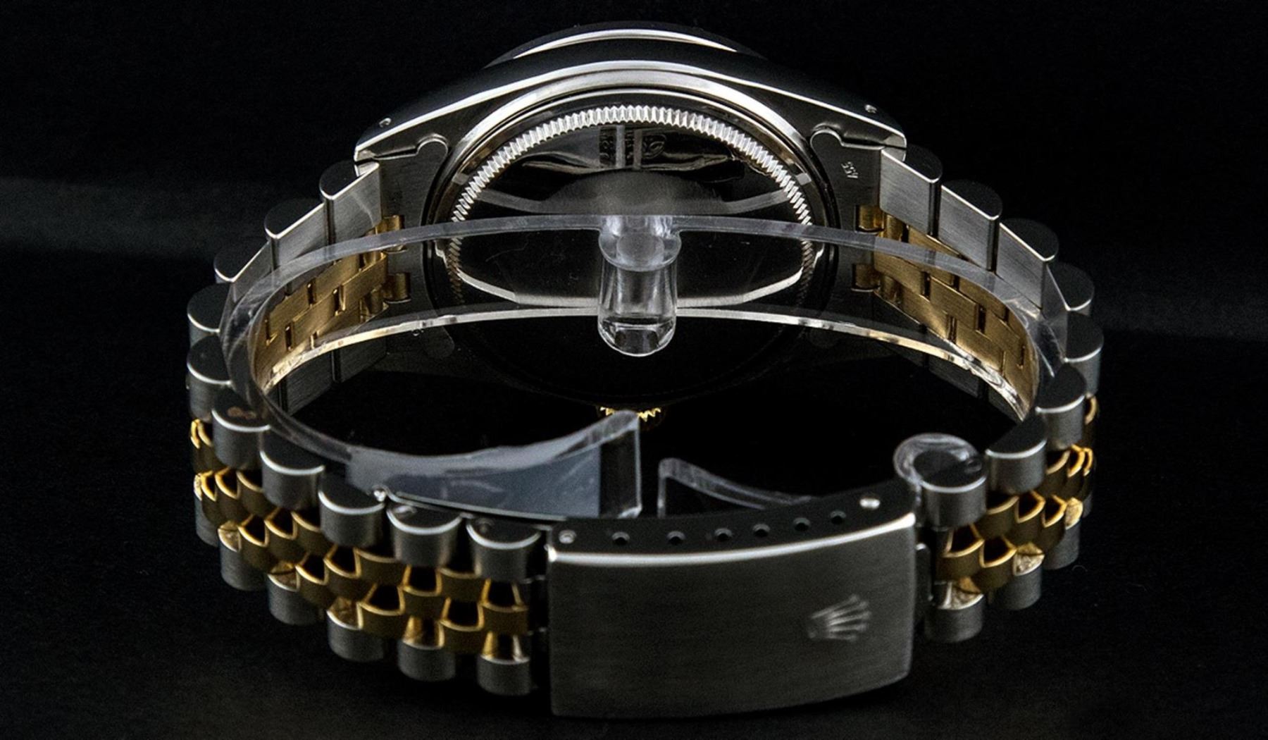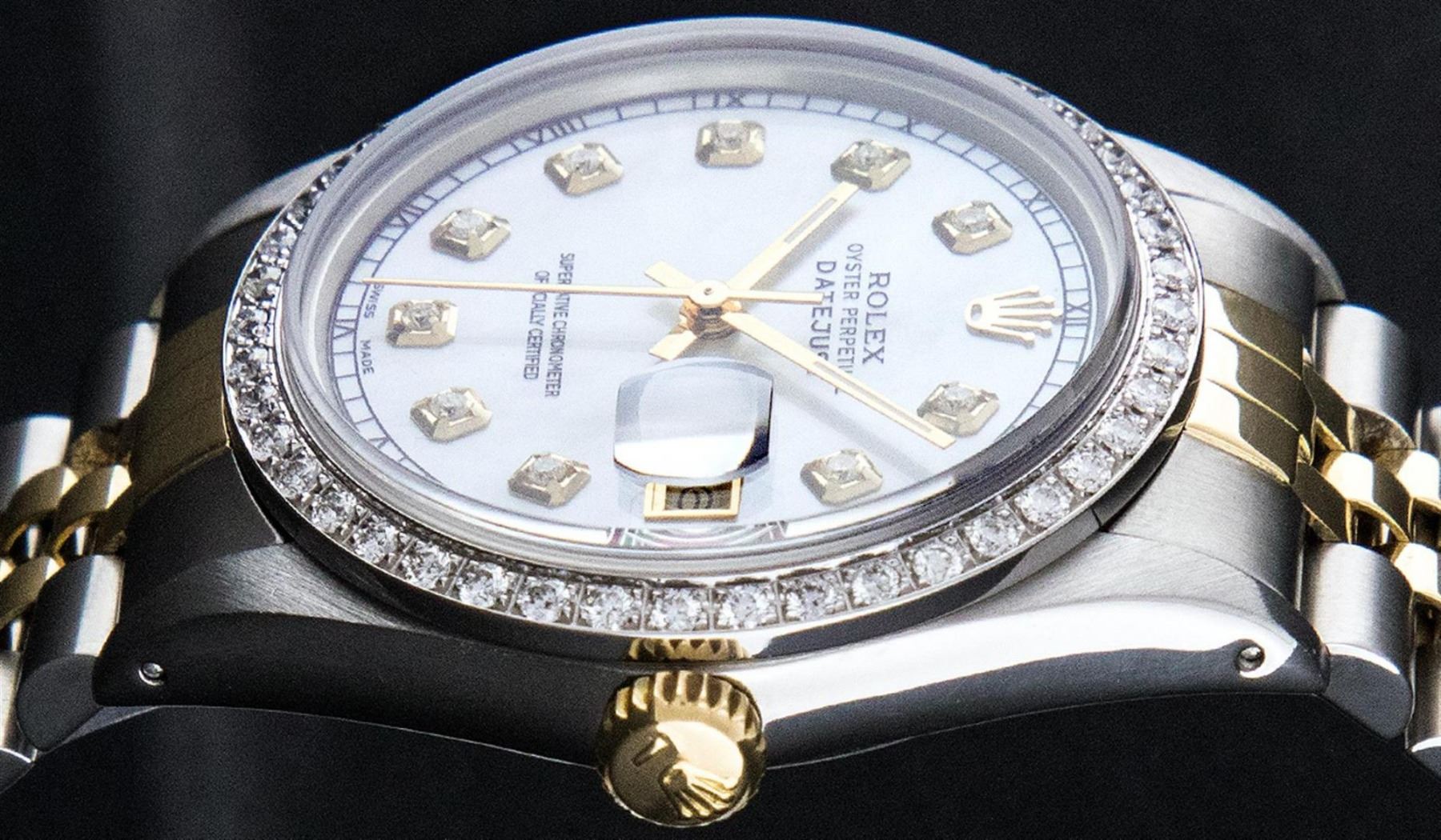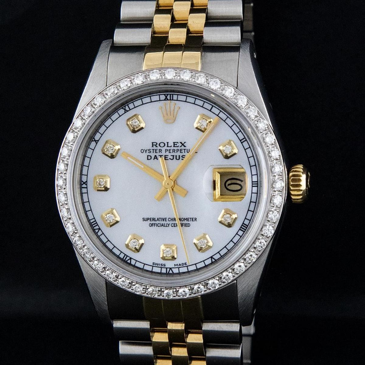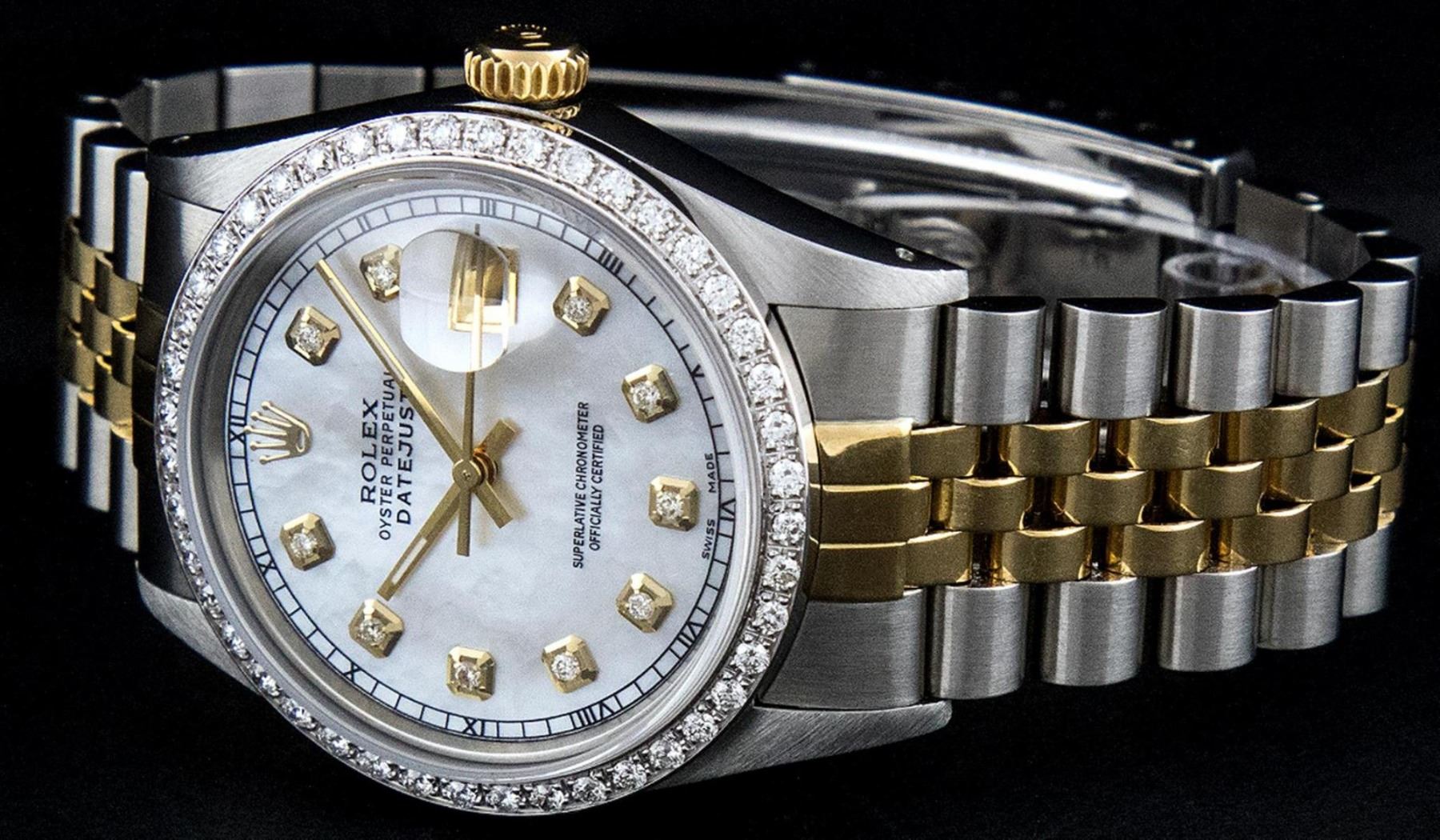 One Mens 14K Yellow Gold Two Tone Rolex Datejust Polished, Serviced & Electronically Tested, 14K Yellow Gold & Stainless Steel Case: 36mm, 14K Yellow Gold Crown, Custom Bezel: 18K White Gold Beadset Diamond Bezel, Diamond Count: 44 Diamonds, Total Weight 1.00 Carat, Clarity: SI-VS, Color: G to H. Custom Crystal: New Synthetic Sapphire Cyclops Lens. Custom Hands: New Luminecent Hands. Movement: Automatic Winding Movement Caliber 3035. Custom Dial: Mother Of Pearl Diamond Dial, 10 Diamonds in Dial G To H In Color, SI-VS Clarity, Date Window: 3 O'Clock Position Date Display, Quickset, Model: Datejust. Condition: G-6 Extra Fine. Bracelet:Two Tone 14K Yellow Gold & Stainless Steel Jubilee. Bright Polish. 7.0 Inch Length, Adjustable. Standard Clasp, With Rolex Logo. This Watch Has Been Serviced Time Tested And Is In Excellent Condition It Is Free Of All Scratches And Dents.