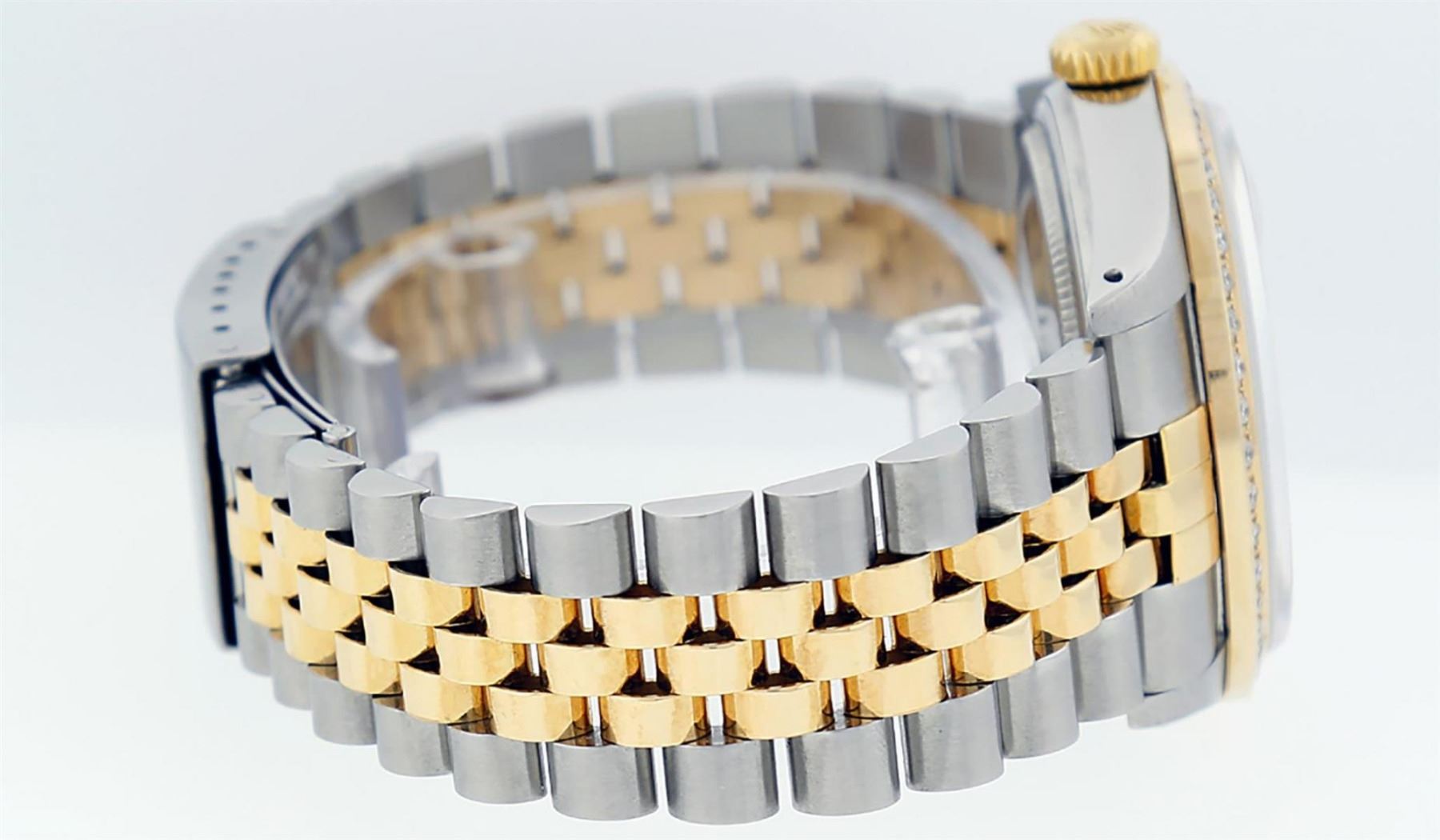 One Mens 14K Yellow Gold Two Tone Rolex Datejust Polished, Serviced & Electronically Tested, 14K Yellow Gold & Stainless Steel Case: 36mm, 14K Yellow Gold Crown, Custom Bezel: New 18K Yellow Gold Beadset Diamond Bezel, Diamond Count: 44 Diamonds, Total Weight 1.00 Carat, Clarity: SI-VS, Color: G to H. Custom Crystal: New Scratch Resistant Synthetic Sapphire Cyclops Lens. Movement: Automatic Winding Movement Caliber 3035. Custom Dial: Mother Of Pearl Dial Set With Diamond Hour Markers and Synthetic Ruby Baguette Markers On 6 and 9, Stone Count: 8 + 2 Synthetic Ruby Bagguettes, Color: G To H In Color, Clarity: SI-VS, Date Window: 3 O'Clock Position Date Display, Quickset, Model: 16013 Datejust. Condition: G-6 Extra Fine. Bracelet: Two Tone 14K Yellow Gold & Stainless Steel Jubilee. Bright Polish. 7.0 Inch Length, Adjustable. Standard Clasp, With Rolex Logo. This Watch Has Been Serviced Time Tested And Is In Excellent Condition It Is Free Of All Scratches And Dents.