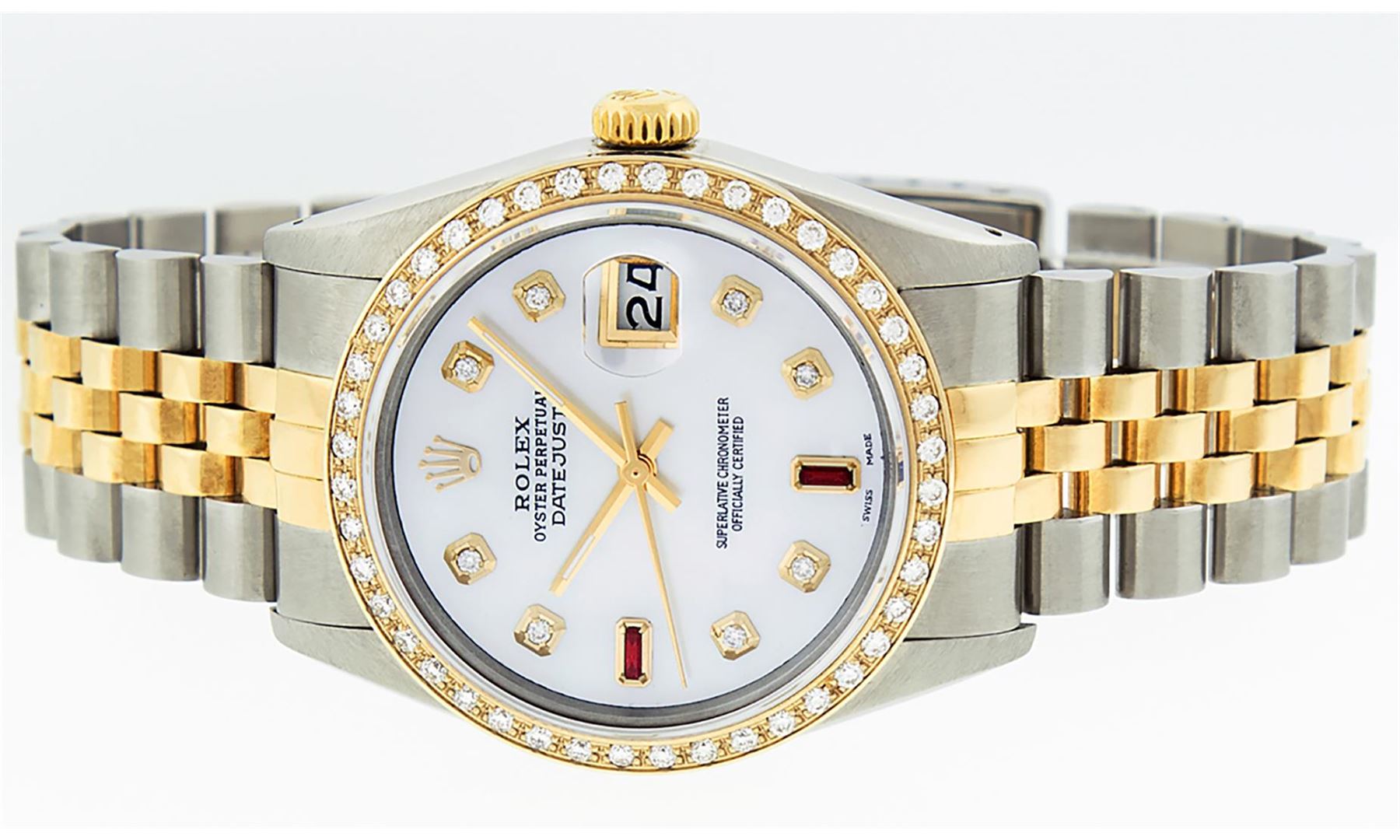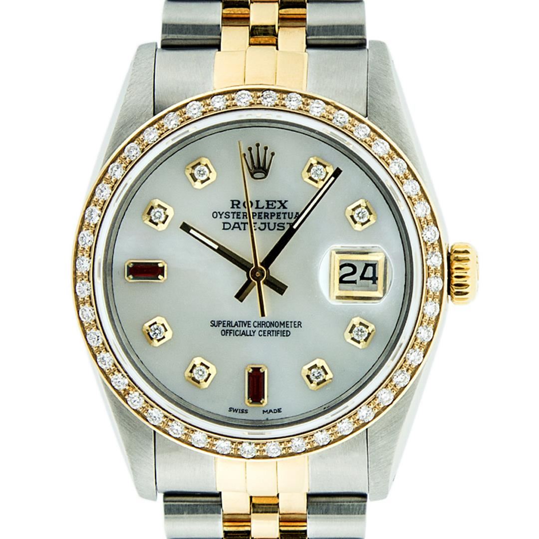 One Mens 14K Yellow Gold Two Tone Rolex Datejust Polished, Serviced & Electronically Tested, 14K Yellow Gold & Stainless Steel Case: 36mm, 14K Yellow Gold Crown, Custom Bezel: New 18K Yellow Gold Beadset Diamond Bezel, Diamond Count: 44 Diamonds, Total Weight 1.00 Carat, Clarity: SI-VS, Color: G to H. Custom Crystal: New Scratch Resistant Synthetic Sapphire Cyclops Lens. Movement: Automatic Winding Movement Caliber 3035. Custom Dial: Mother Of Pearl Dial Set With Diamond Hour Markers and Synthetic Ruby Baguette Markers On 6 and 9, Stone Count: 8 + 2 Synthetic Ruby Bagguettes, Color: G To H In Color, Clarity: SI-VS, Date Window: 3 O'Clock Position Date Display, Quickset, Model: 16013 Datejust. Condition: G-6 Extra Fine. Bracelet: Two Tone 14K Yellow Gold & Stainless Steel Jubilee. Bright Polish. 7.0 Inch Length, Adjustable. Standard Clasp, With Rolex Logo. This Watch Has Been Serviced Time Tested And Is In Excellent Condition It Is Free Of All Scratches And Dents.