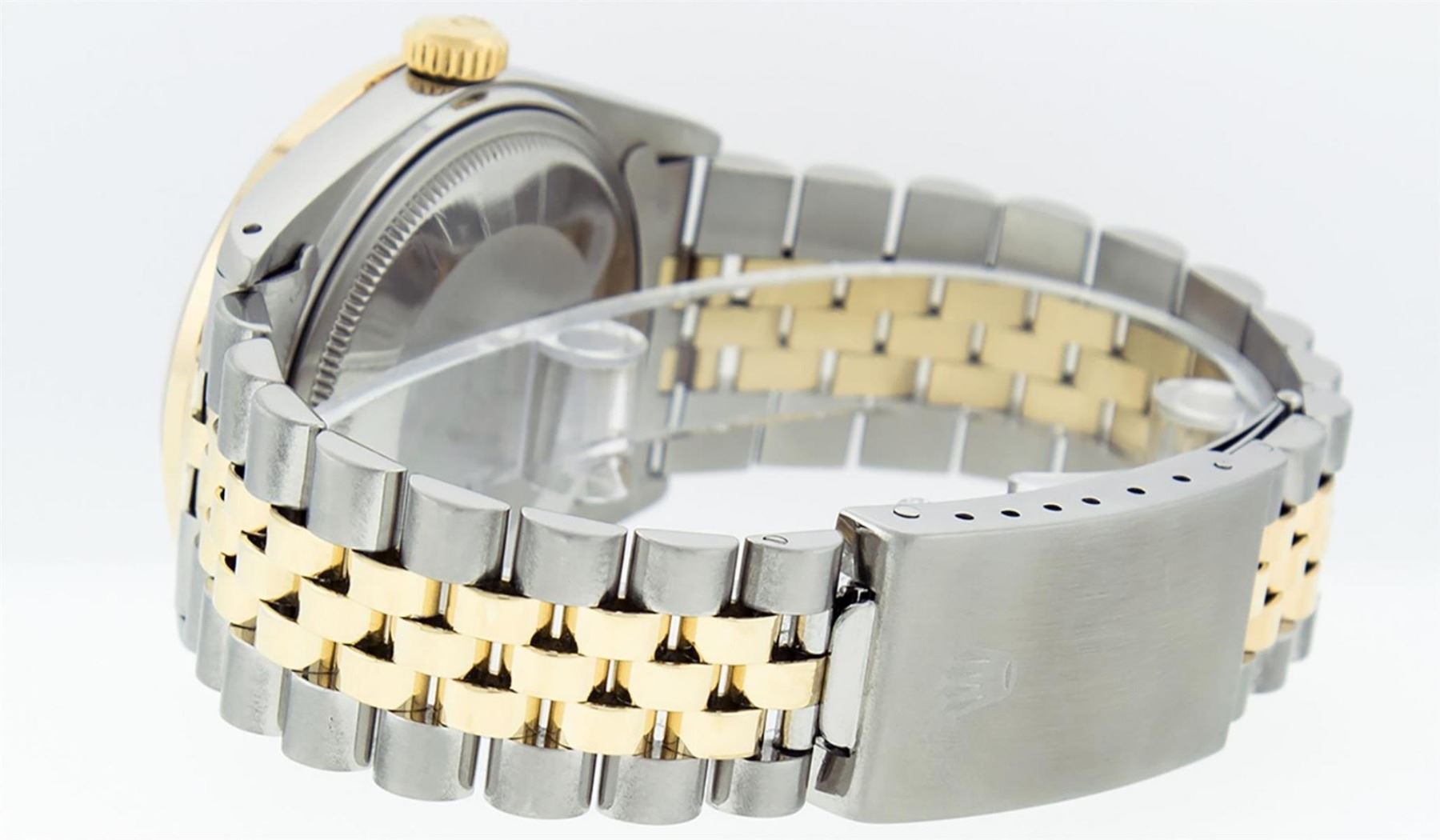 One Mens 14K Yellow Gold Two Tone Rolex Datejust Polished, Serviced & Electronically Tested, 14K Yellow Gold & Stainless Steel Case: 36mm, 14K Yellow Gold Crown, Custom Bezel: New 18K Yellow Gold Beadset & Ruby Diamond Bezel, Stone Count: 36 Diamonds + 4 Rubies, Total Weight 1.00 Carat, Clarity: SI-VS, Color: G to H. Custom Crystal: New Synthetic Sapphire Cyclops Lens. Custom Hands: New Luminecent Hands. Movement: Automatic Winding Movement Caliber 3035. Custom Dial: Mother Of Pearl Roman Dial With Square Track. Date Window: 3 O'Clock Position Date Display, Quickset, Model: 16013 Datejust. Condition: G-6 Extra Fine. Bracelet: Two Tone 14K Yellow Gold & Stainless Steel Jubilee. Bright Polish. 7.0 Inch Length, Adjustable. Standard Clasp, With Rolex Logo. This Watch Has Been Serviced Time Tested And Is In Excellent Condition It Is Free Of All Scratches And Dents.