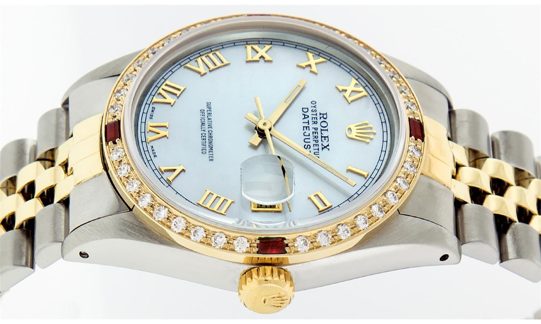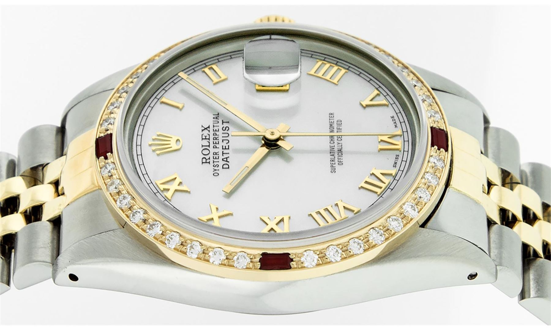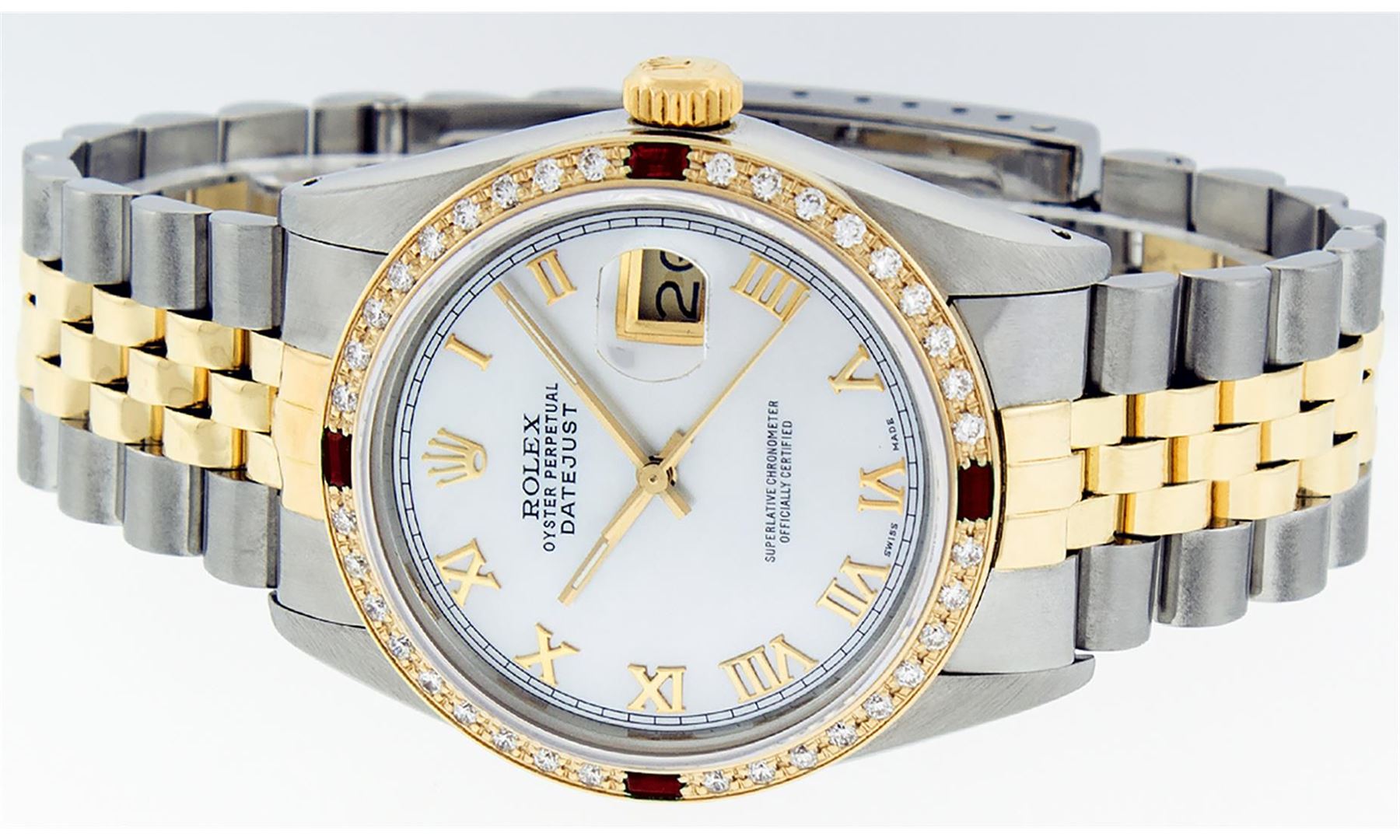 One Mens 14K Yellow Gold Two Tone Rolex Datejust Polished, Serviced & Electronically Tested, 14K Yellow Gold & Stainless Steel Case: 36mm, 14K Yellow Gold Crown, Custom Bezel: New 18K Yellow Gold Beadset & Ruby Diamond Bezel, Stone Count: 36 Diamonds + 4 Rubies, Total Weight 1.00 Carat, Clarity: SI-VS, Color: G to H. Custom Crystal: New Synthetic Sapphire Cyclops Lens. Custom Hands: New Luminecent Hands. Movement: Automatic Winding Movement Caliber 3035. Custom Dial: Mother Of Pearl Roman Dial With Square Track. Date Window: 3 O'Clock Position Date Display, Quickset, Model: 16013 Datejust. Condition: G-6 Extra Fine. Bracelet: Two Tone 14K Yellow Gold & Stainless Steel Jubilee. Bright Polish. 7.0 Inch Length, Adjustable. Standard Clasp, With Rolex Logo. This Watch Has Been Serviced Time Tested And Is In Excellent Condition It Is Free Of All Scratches And Dents.