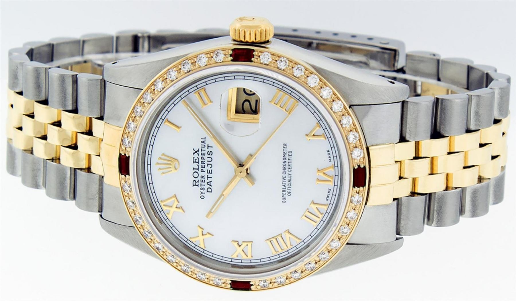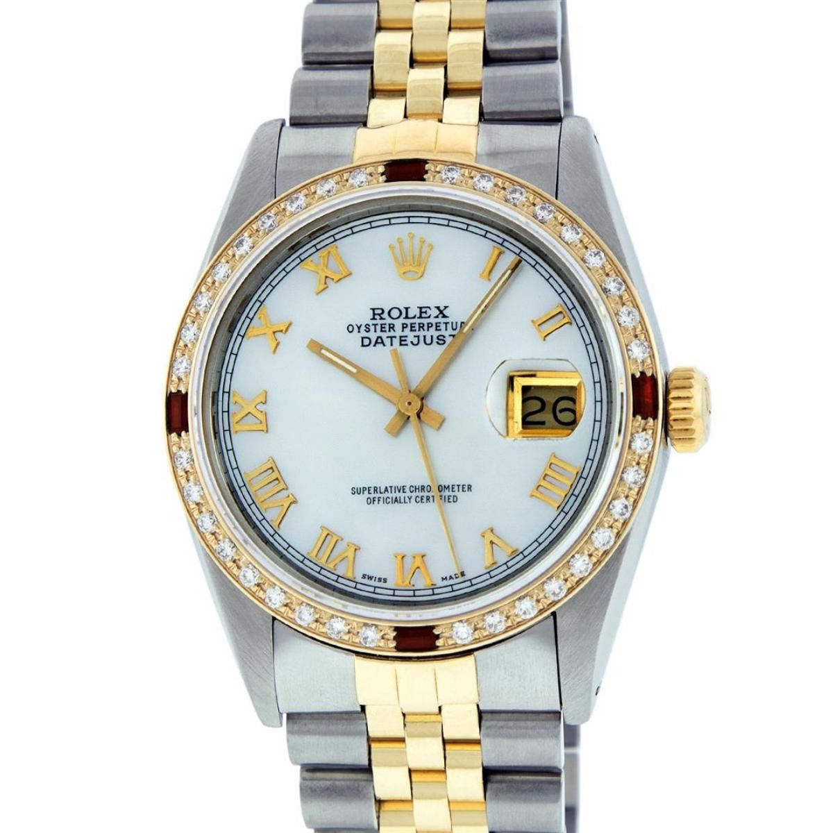 One Mens 14K Yellow Gold Two Tone Rolex Datejust Polished, Serviced & Electronically Tested, 14K Yellow Gold & Stainless Steel Case: 36mm, 14K Yellow Gold Crown, Custom Bezel: New 18K Yellow Gold Beadset & Ruby Diamond Bezel, Stone Count: 36 Diamonds + 4 Rubies, Total Weight 1.00 Carat, Clarity: SI-VS, Color: G to H. Custom Crystal: New Synthetic Sapphire Cyclops Lens. Custom Hands: New Luminecent Hands. Movement: Automatic Winding Movement Caliber 3035. Custom Dial: Mother Of Pearl Roman Dial With Square Track. Date Window: 3 O'Clock Position Date Display, Quickset, Model: 16013 Datejust. Condition: G-6 Extra Fine. Bracelet: Two Tone 14K Yellow Gold & Stainless Steel Jubilee. Bright Polish. 7.0 Inch Length, Adjustable. Standard Clasp, With Rolex Logo. This Watch Has Been Serviced Time Tested And Is In Excellent Condition It Is Free Of All Scratches And Dents.