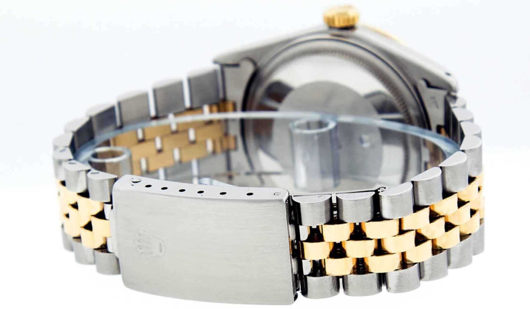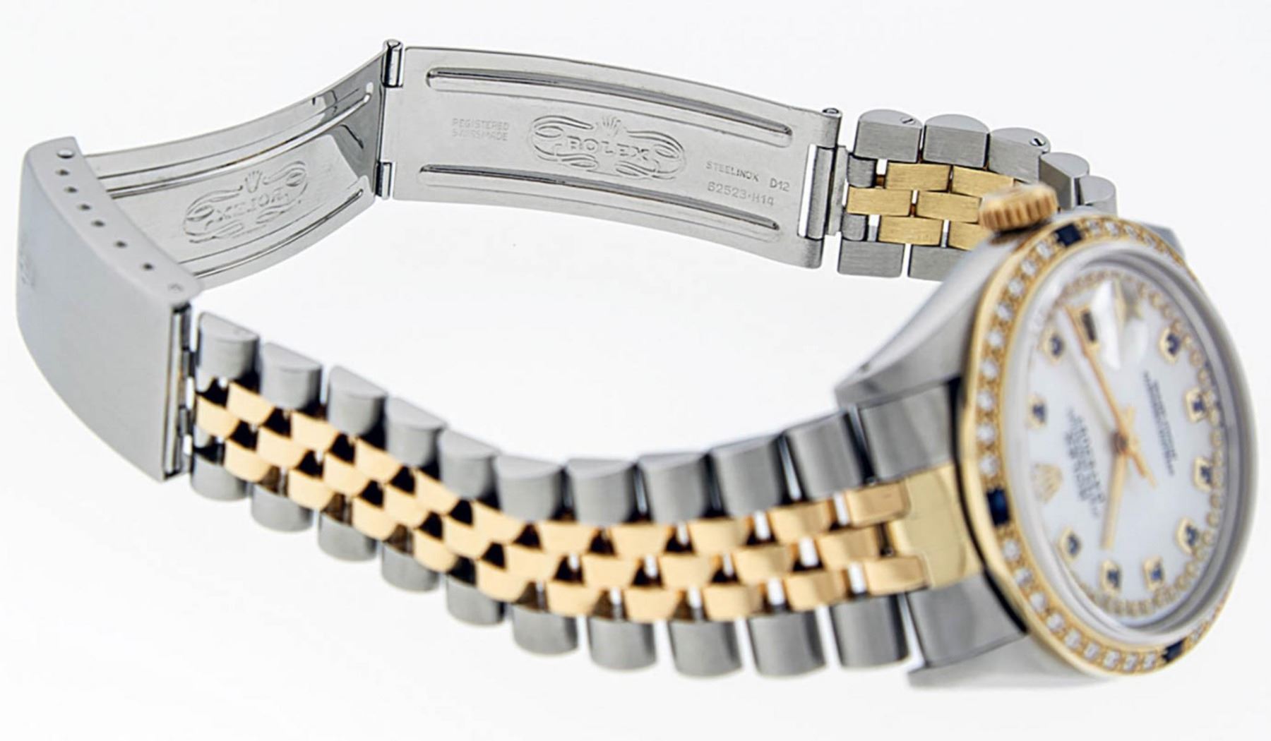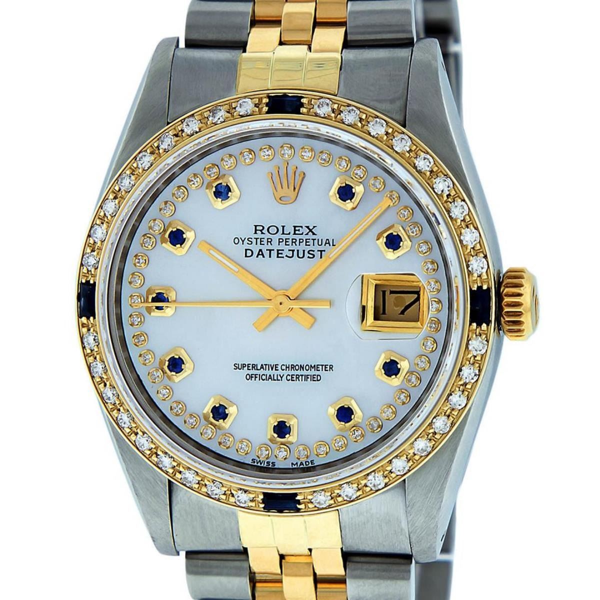 One Mens 14K Yellow Gold Two Tone Rolex Datejust Polished, Serviced & Electronically Tested, 14K Yellow Gold & Stainless Steel Case:36mm, 14K Yellow Gold Crown, Custom Bezel: New 18K Yellow Gold Sapphire Beadset Diamond Bezel, Diamond Count: 36 Diamonds + 4 Sapphires Total Weight 1.00 Carat, Clarity: SI-VS, Color: G to H. Custom Crystal: New Synthetic Sapphire Cyclops Lens. Custom Hands: New Luminecent Hands. Movement: Automatic Winding Movement Caliber 3035. Custom Dial: Mother Of Pearl Sapphire String Diamond Dial, Diamond + Gem Count: 10 Sapphires + 48 Diamonds in Dial G To H In Color, SI-VS Clarity. Date Window: 3 O'Clock Position Date Display, Quickset, Model: 16013 Condition: G-6 Extra Fine. Bracelet: Two Tone 14K Yellow Gold & Stainless Steel Jubilee. Bright Polish. 7.0 Inch Length, Adjustable. Standard Clasp, With Rolex Logo. This Watch Has Been Serviced Time Tested And Is In Excellent Condition It Is Free Of All Scratches And Dents.