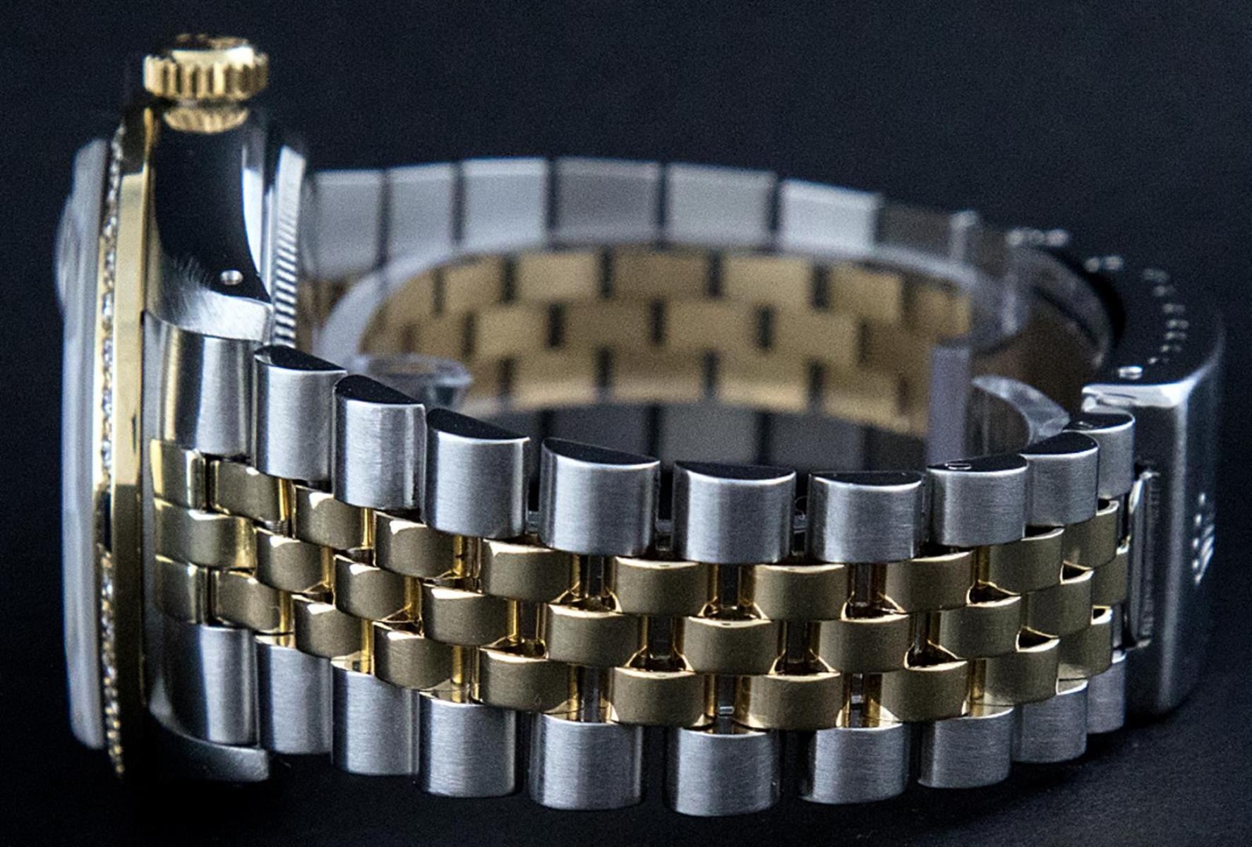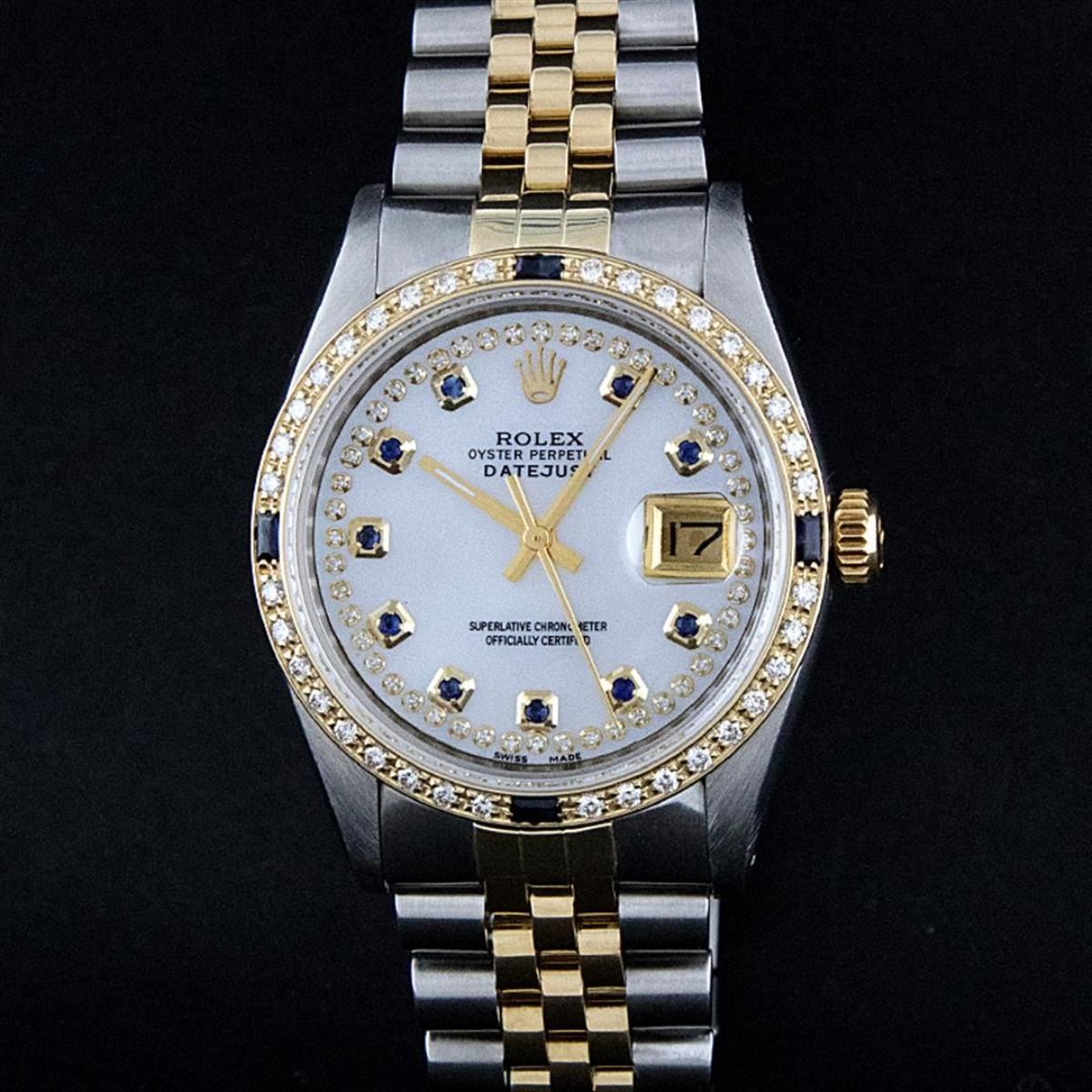 One Mens 14K Yellow Gold Two Tone Rolex Datejust Polished, Serviced & Electronically Tested, 14K Yellow Gold & Stainless Steel Case: 36mm, 14K Yellow Gold Crown, Custom Bezel: New 18K Yellow Gold Sapphire Beadset Diamond Bezel, Diamond Count: 36 Diamonds + 4 Sapphires, Total Weight 1.00 Carat, Clarity: SI-VS, Color: G to H. Custom Crystal: New Synthetic Sapphire Cyclops Lens. Custom Hands: New Luminecent Hands. Movement: Automatic Winding Movement Caliber 3035. Custom Dial: Mother Of Pearl Sapphire String Diamond Dial, Diamond + Gem Count: 10 Sapphires + 48 Diamonds in Dial, G To H In Color, SI-VS Clarity. Date Window: 3 O'Clock Position Date Display, Quickset, Model: Datejust, Condition: G-6 Extra Fine. Bracelet: Two Tone 14K Yellow Gold & Stainless Steel Jubilee. Bright Polish. 7.0 Inch Length, Adjustable. Standard Clasp, With Rolex Logo. This Watch Has Been Serviced Time Tested And Is In Excellent Condition It Is Free Of All Scratches And Dents.