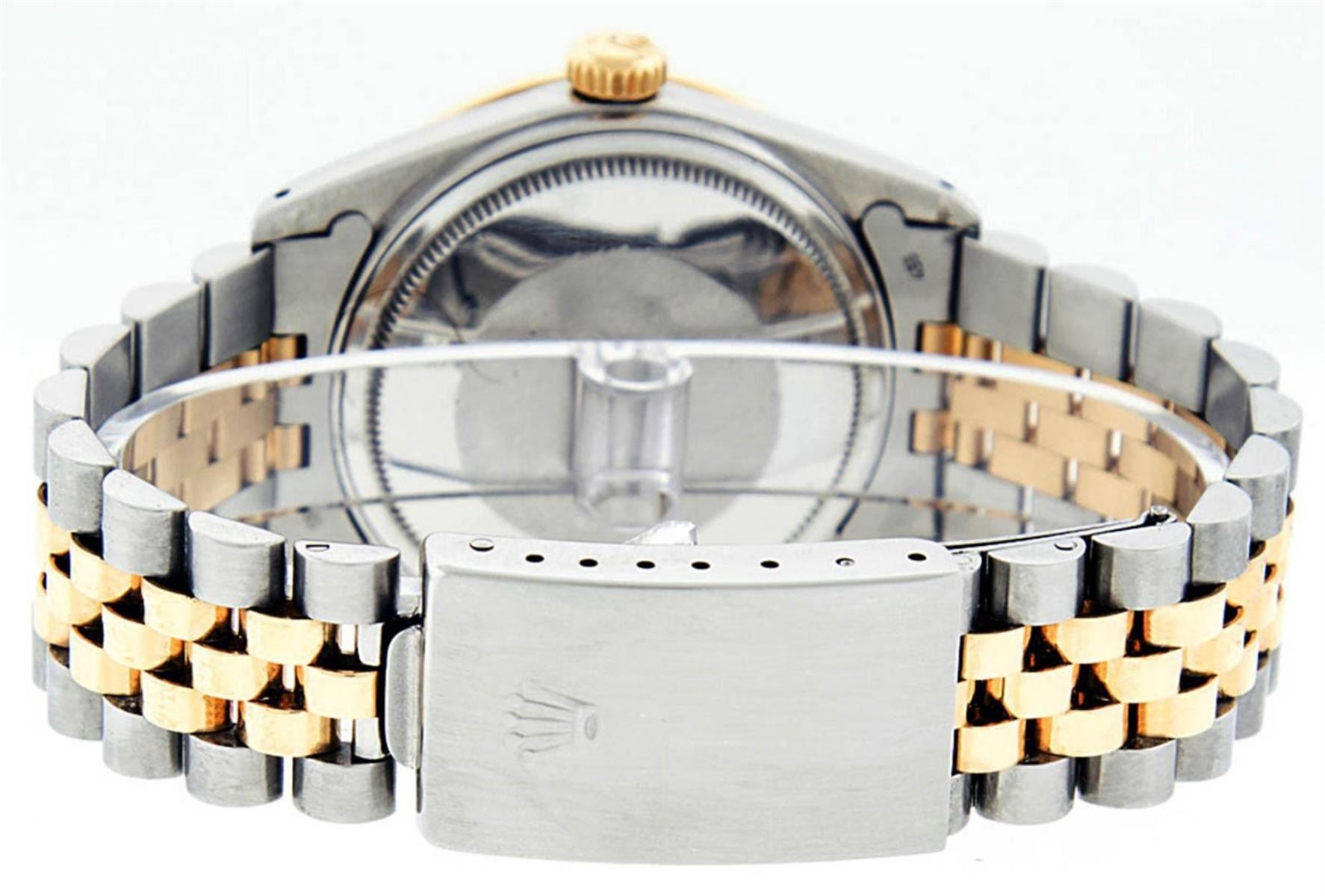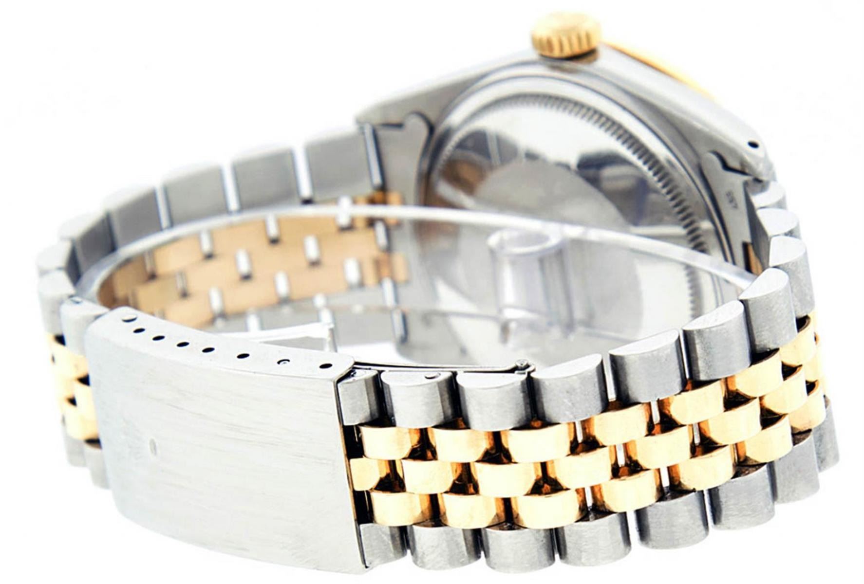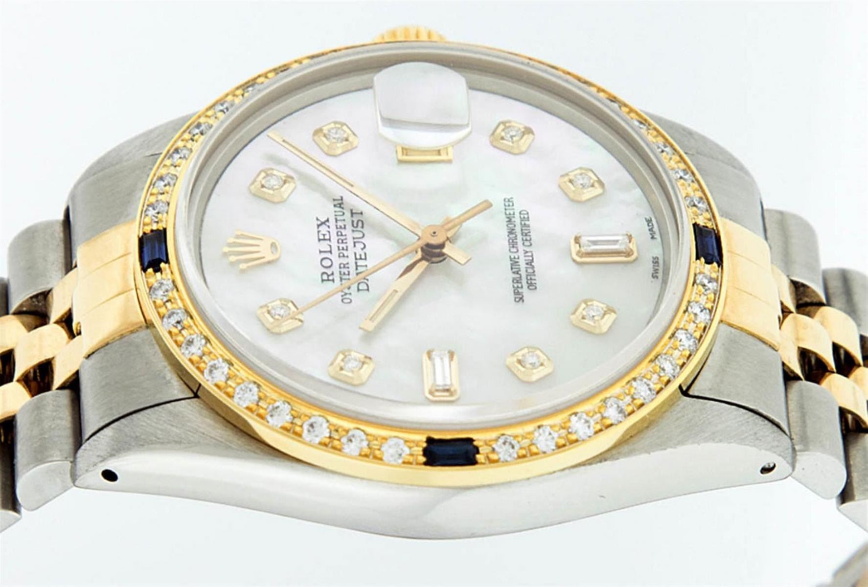 One Mens 14K Yellow Gold Two Tone Rolex Datejust Polished, Serviced & Electronically Tested, 14K Yellow Gold & Stainless Steel Case:36mm, 14K Yellow Gold Crown, Custom Bezel: New 18K Yellow Gold Sapphire Beadset Diamond Bezel, Diamond Count: 36 Diamonds + 4 Sapphires Total Weight 1.00 Carat, Clarity: SI-VS, Color: G to H. Custom Crystal: New Synthetic Sapphire Cyclops Lens. Movement: Automatic Winding Movement Caliber 3035. Custom Dial: Mother Of Pearl Dial Set With Diamond Hour Markers and Baguette Markers On 6 and 9, Diamond Count: 8 + 2 Bagguette Diamonds in Dial G To H In Color , Date Window: 3 O'Clock Position Date Display, Quickset, Model: 16013 Condition: G-6 Extra Fine. Bracelet: Two Tone 14K Yellow Gold & Stainless Steel Jubilee. Bright Polish. 7.0 Inch Length, Adjustable. Standard Clasp, With Rolex Logo. This Watch Has Been Serviced Time Tested And Is In Excellent Condition It Is Free Of All Scratches And Dents.