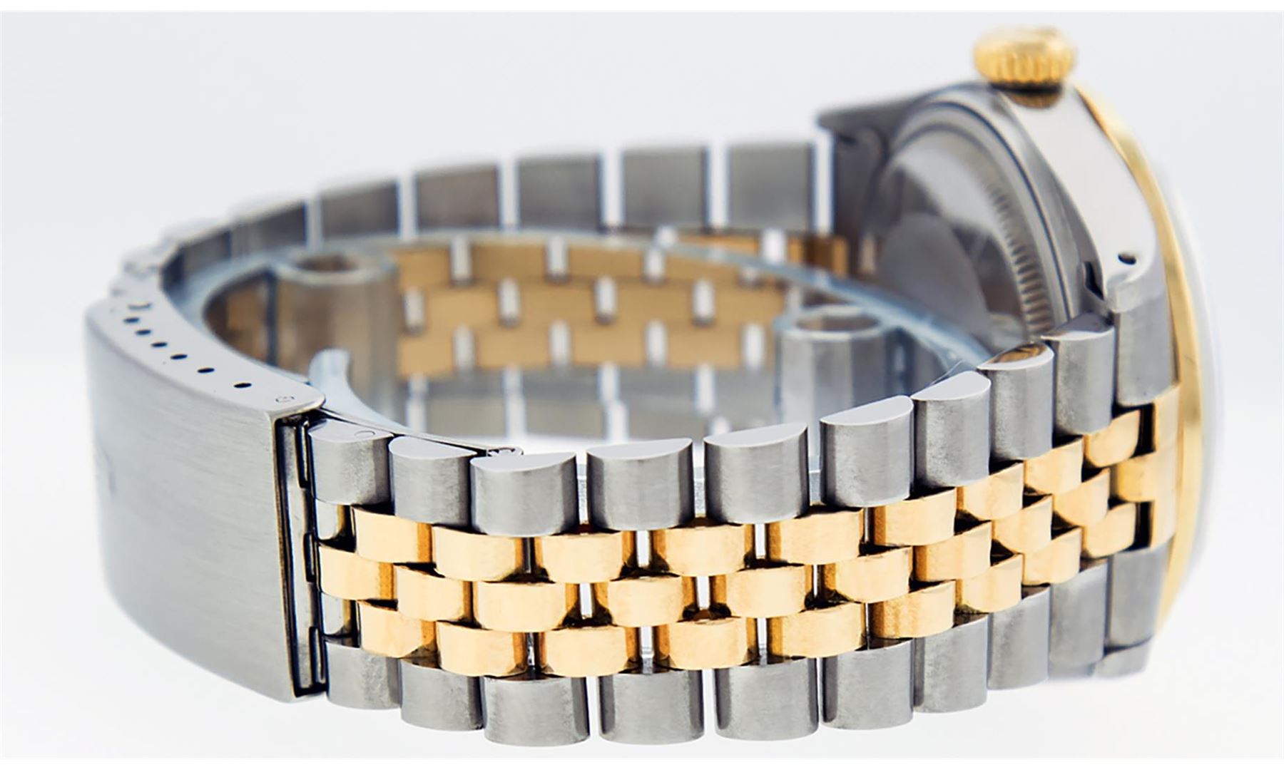 One Mens 14K Yellow Gold Two Tone Rolex Datejust Polished, Serviced & Electronically Tested, 14K Yellow Gold & Stainless Steel Case: 36mm, 14K Yellow Gold Crown, Custom Bezel: New 18K Yellow Gold Ruby Beadset Diamond Bezel, Diamond Count: 36 Diamonds + 4 Rubies, Total Weight 1.00 Carat, Clarity: SI-VS, Color: G to H. Custom Crystal: New Scratch Resistant Synthetic Sapphire Cyclops Lens. Custom Hands: New Luminecent Hands. Movement: Automatic Winding Movement Caliber 3035. Custom Dial: Mother Of Pearl Ruby String Diamond Dial, Diamond + Gem Count: 10 Rubies + 48 Diamonds in Dial, G To H In Color, SI-VS Clarity. Date Window: 3 O'Clock Position Date Display, Quickset, Model: 16013 Datejust. Condition: G-6 Extra Fine. Bracelet: Two Tone 14K Yellow Gold & Stainless Steel Jubilee. Bright Polish. 7.0 Inch Length, Adjustable. Standard Clasp, With Rolex Logo. This Watch Has Been Serviced Time Tested And Is In Excellent Condition It Is Free Of All Scratches And Dents.