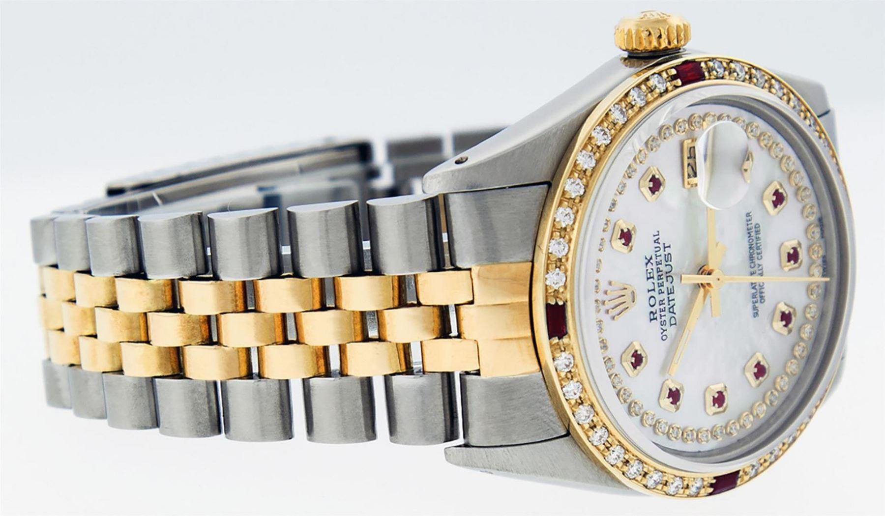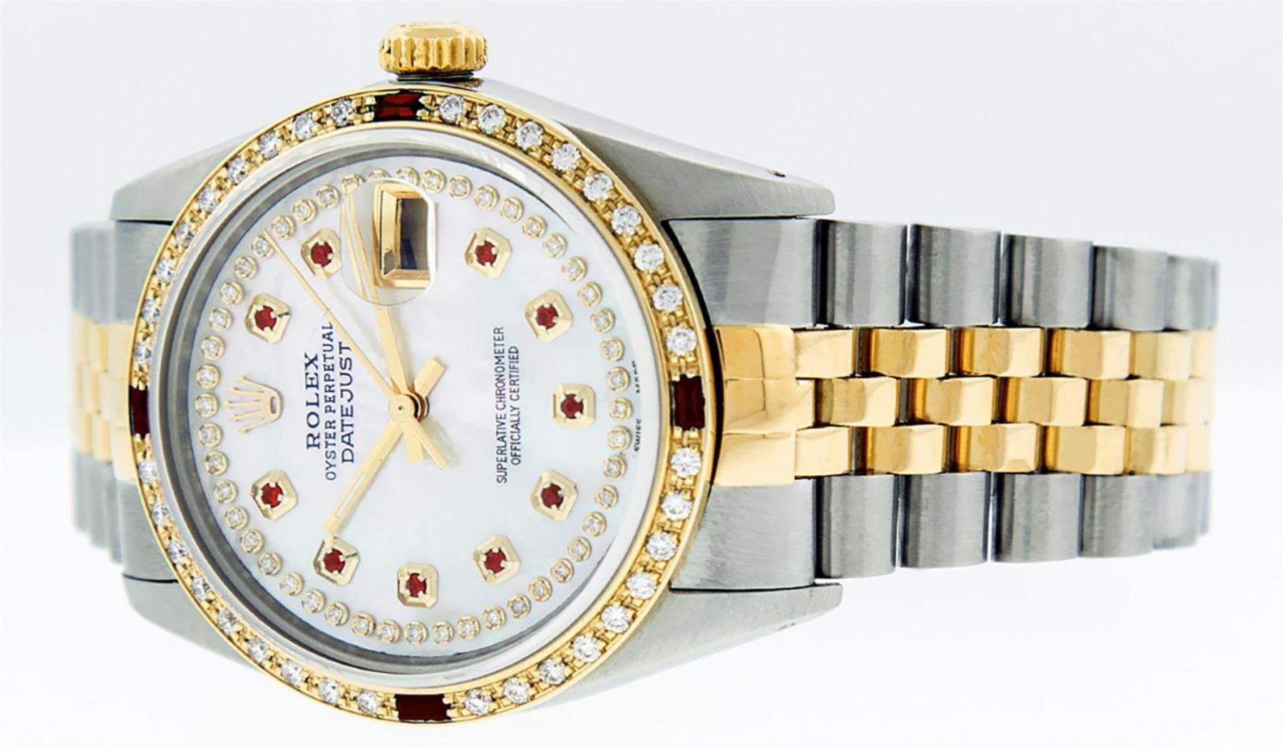 One Mens 14K Yellow Gold Two Tone Rolex Datejust Polished, Serviced & Electronically Tested, 14K Yellow Gold & Stainless Steel Case: 36mm, 14K Yellow Gold Crown, Custom Bezel: New 18K Yellow Gold Ruby Beadset Diamond Bezel, Diamond Count: 36 Diamonds + 4 Rubies, Total Weight 1.00 Carat, Clarity: SI-VS, Color: G to H. Custom Crystal: New Scratch Resistant Synthetic Sapphire Cyclops Lens. Custom Hands: New Luminecent Hands. Movement: Automatic Winding Movement Caliber 3035. Custom Dial: Mother Of Pearl Ruby String Diamond Dial, Diamond + Gem Count: 10 Rubies + 48 Diamonds in Dial, G To H In Color, SI-VS Clarity. Date Window: 3 O'Clock Position Date Display, Quickset, Model: 16013 Datejust. Condition: G-6 Extra Fine. Bracelet: Two Tone 14K Yellow Gold & Stainless Steel Jubilee. Bright Polish. 7.0 Inch Length, Adjustable. Standard Clasp, With Rolex Logo. This Watch Has Been Serviced Time Tested And Is In Excellent Condition It Is Free Of All Scratches And Dents.