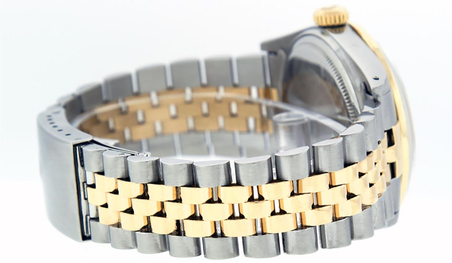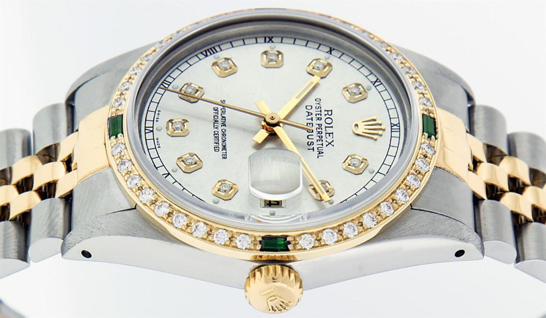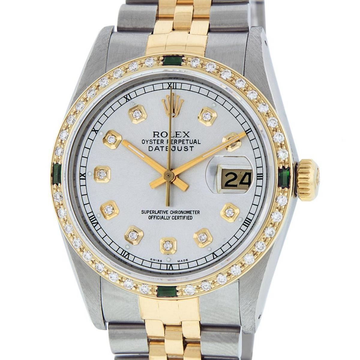 One Mens 14K Yellow Gold Two Tone Rolex Datejust Polished, Serviced & Electronically Tested, 14K Yellow Gold & Stainless Steel Case: 36mm, 14K Yellow Gold Crown, Custom Bezel: New 18K Yellow Gold Emerald Beadset Diamond Bezel, Diamond Count: 36 Diamonds + 4 Emeralds, Total Weight 1.00 Carat, Clarity: SI-VS, Color: G to H. Custom Crystal: New Scratch Resistant Synthetic Sapphire Cyclops Lens. Custom Hands: New Luminecent Hands. Movement: Automatic Winding Movement Caliber 3035. Custom Dial: Silver Diamond With Square Roman Track & Lumi Dots. Diamond Count: 10 Diamonds In Dial, Clarity: SI-VS, Color: Color G to H Date Window: 3 O'Clock Position Date Display, Quickset, Model: 16013 Datejust, Condition: G-6 Extra Fine. Bracelet:Two Tone 14K Yellow Gold & Stainless Steel Jubilee. Bright Polish. 7.0 Inch Length, Adjustable. Standard Clasp, With Rolex Logo. This Watch Has Been Serviced Time Tested And Is In Excellent Condition It Is Free Of All Scratches And Dents.