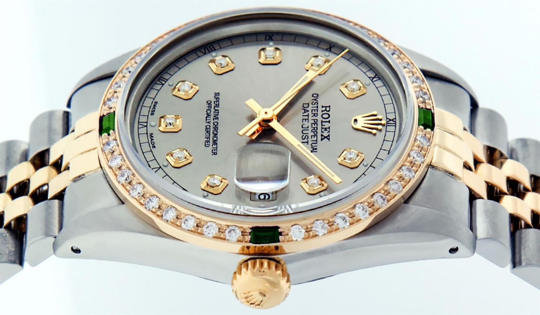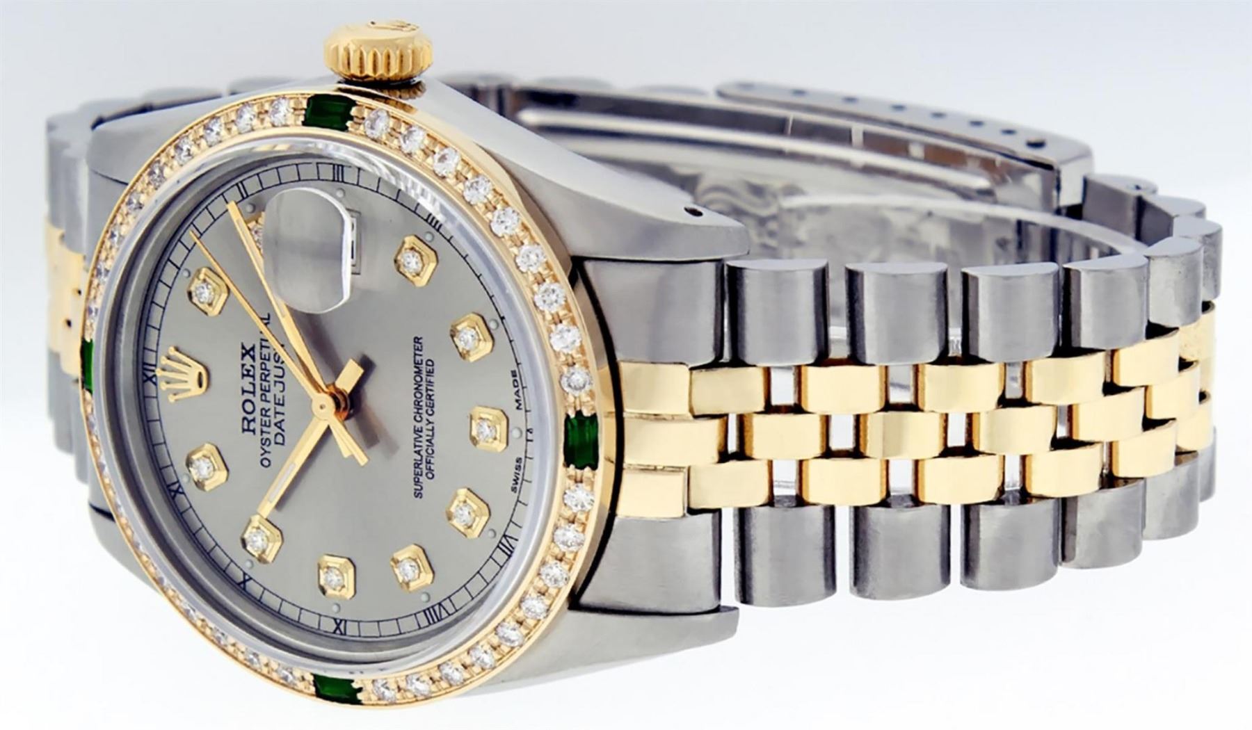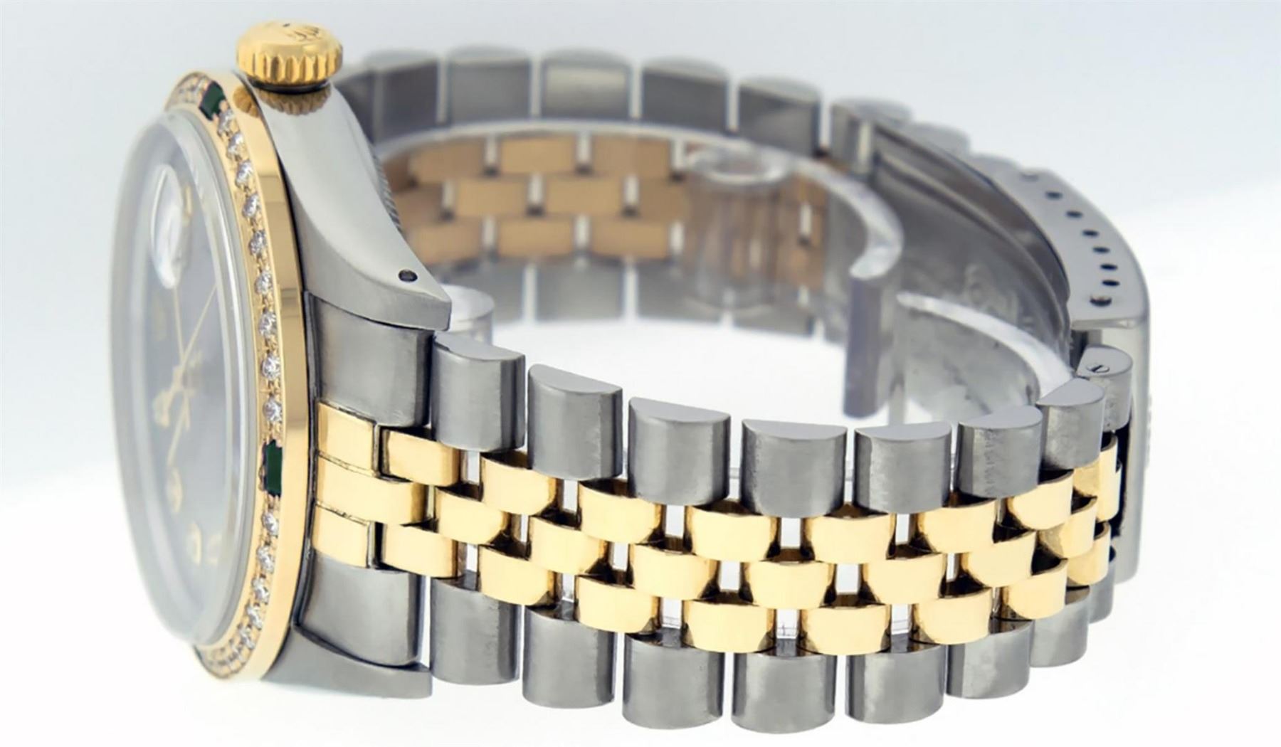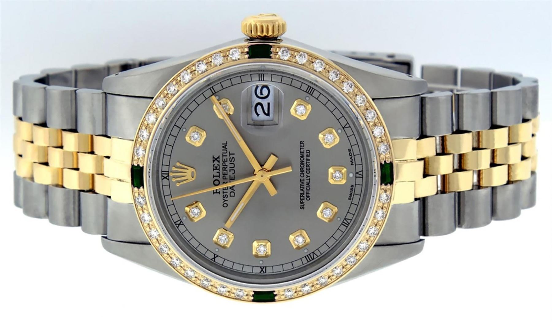 One Mens 14K Yellow Gold Two Tone Rolex Datejust Polished, Serviced & Electronically Tested, 14K Yellow Gold & Stainless Steel Case: 36mm, 14K Yellow Gold Crown, Custom Bezel: New 18K Yellow Gold Emerald Beadset Diamond Bezel, Diamond Count: 36 Diamonds + 4 Emeralds, Total Weight 1.00 Carat, Clarity: SI-VS, Color: G to H. Custom Crystal: New Scratch Resistant Synthetic Sapphire Cyclops Lens. Custom Hands: New Luminecent Hands. Movement: Automatic Winding Movement Caliber 3035. Custom Dial: Slate Grey Diamond With Square Roman Track & Lumi Dots. Diamond Count: 10 Diamonds In Dial, Clarity: SI-VS, Color: Color G to H Date Window: 3 O'Clock Position Date Display, Quickset, Model: 16013 Datejust. Condition: G-6 Extra Fine. Bracelet:Two Tone 14K Yellow Gold & Stainless Steel Jubilee. Bright Polish. 7.0 Inch Length, Adjustable. Standard Clasp, With Rolex Logo. This Watch Has Been Serviced Time Tested And Is In Excellent Condition It Is Free Of All Scratches And Dents.