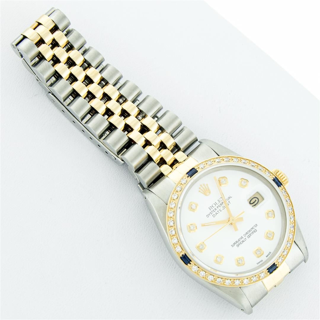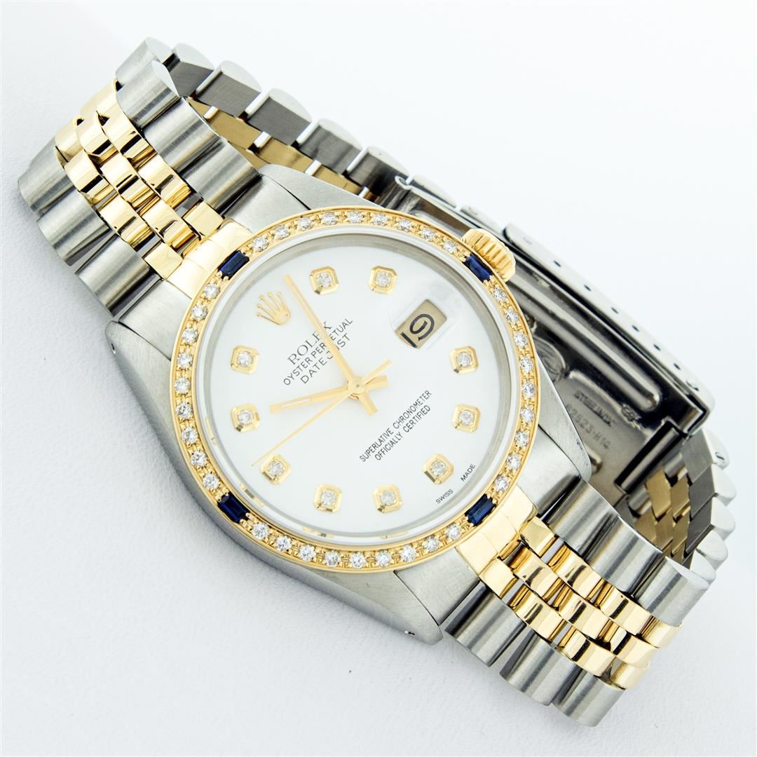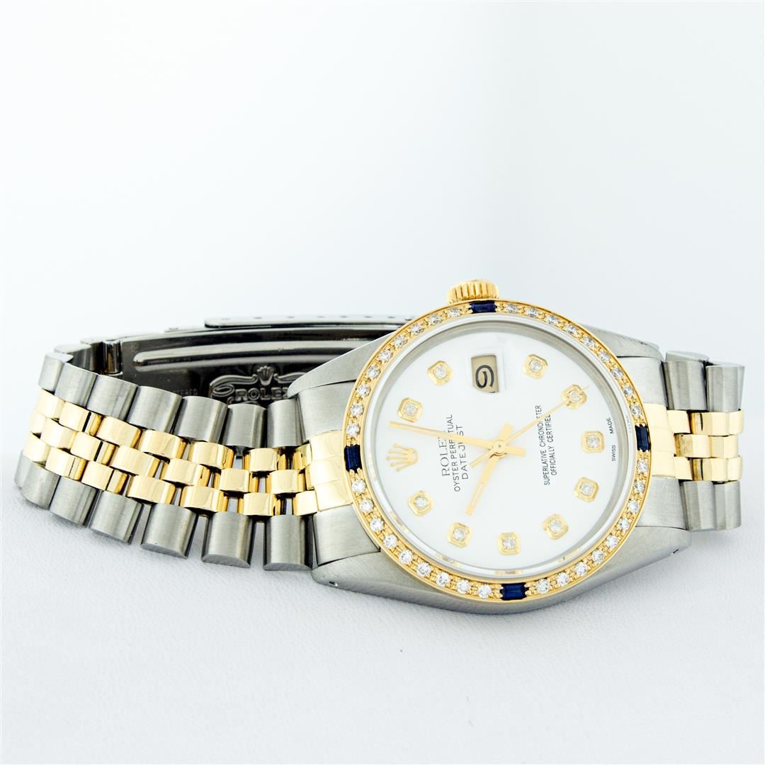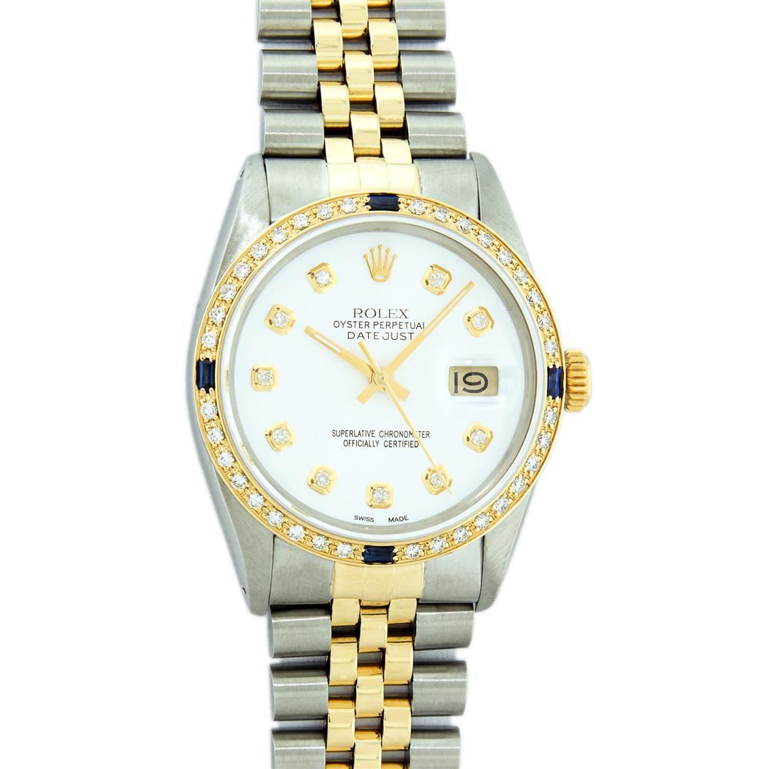 One Mens 14K Yellow Gold Two Tone Rolex Datejust Polished, Serviced & Electronically Tested, 14K Yellow Gold & Stainless Steel Case: 36mm, 14K Yellow Gold Crown, Custom Bezel: New 18K Yellow Gold Sapphire Beadset Diamond Bezel, Stone Count: 36 Diamonds + 4 Sapphires, Total Weight 1.00 Carat, Clarity: SI-VS, Color: G to H. Custom Crystal: New Scratch Resistant Synthetic Sapphire Cyclops Lens. Custom Hands: New Luminecent Hands. Movement: Automatic Winding Movement Caliber 3035. Custom Dial: White Dial With Diamond Hour Markers, Diamond Count: 10 Diamonds, Clarity: VS2-SI1, Color: G to H. Date Window: 3 O'Clock Position Date Display, Quickset, Model: 16013 Datejust. Condition: G-6 Extra Fine. Bracelet: Two Tone 14K Yellow Gold & Stainless Steel Jubilee. Bright Polish. 7.0 Inch Length, Adjustable. Standard Clasp, With Rolex Logo. This Watch Has Been Serviced Time Tested And Is In Excellent Condition It Is Free Of All Scratches And Dents. This Watch Comes With A Appraisal And Rolex Box.