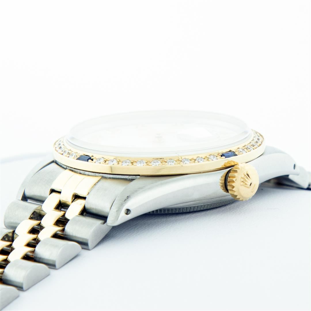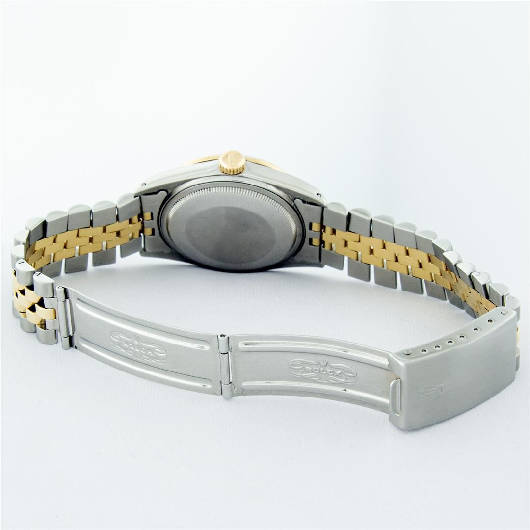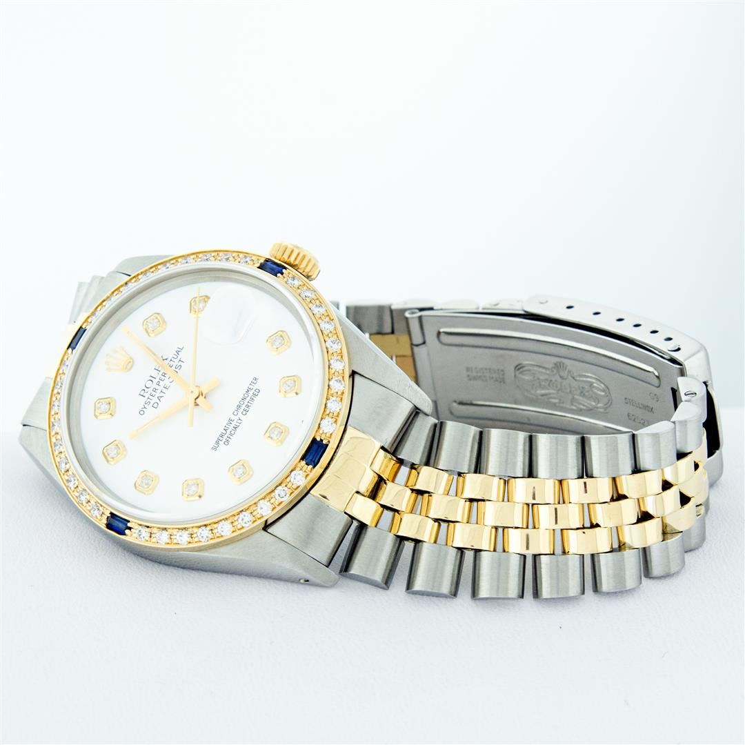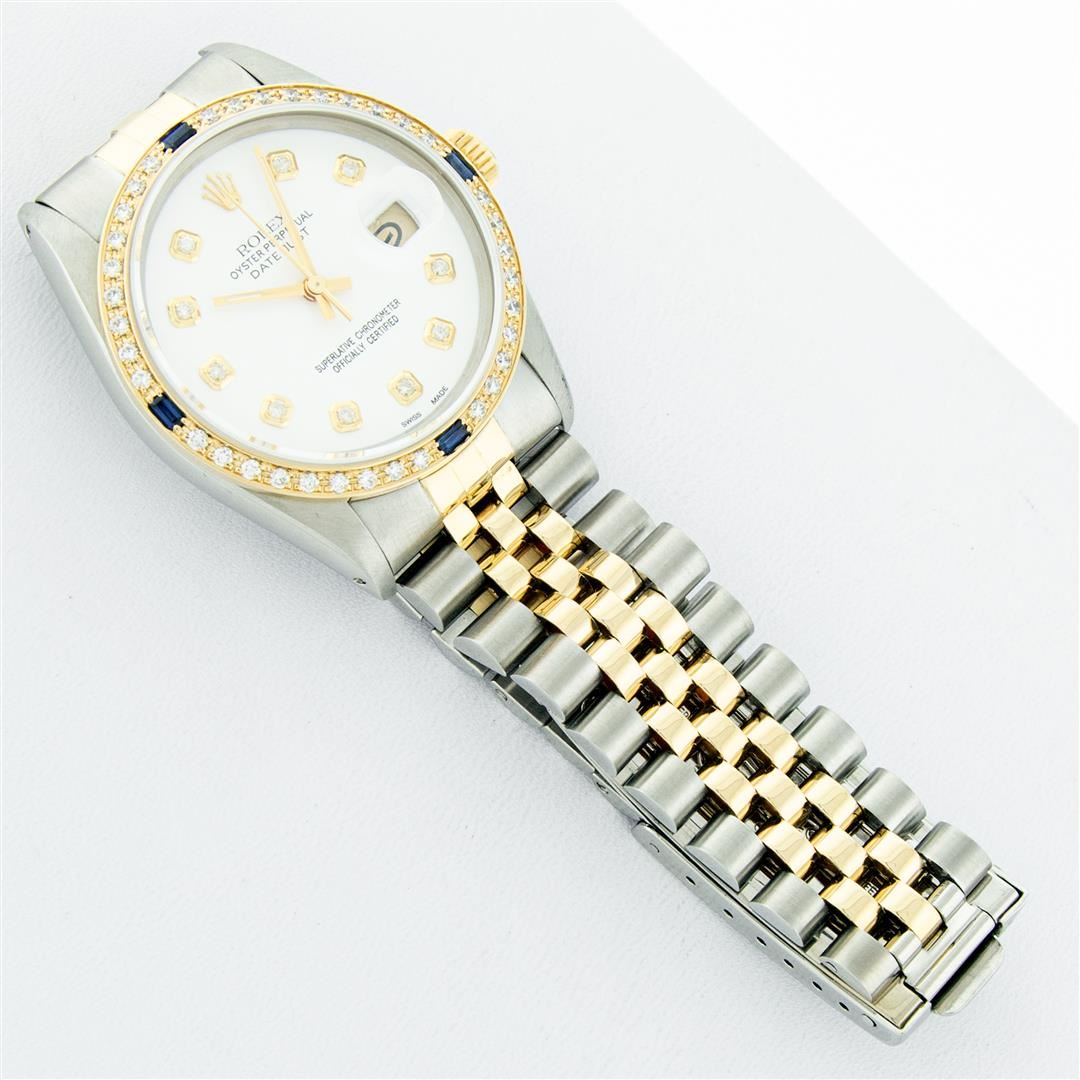 One Mens 14K Yellow Gold Two Tone Rolex Datejust Polished, Serviced & Electronically Tested, 14K Yellow Gold & Stainless Steel Case: 36mm, 14K Yellow Gold Crown, Custom Bezel: New 18K Yellow Gold Sapphire Beadset Diamond Bezel, Stone Count: 36 Diamonds + 4 Sapphires, Total Weight 1.00 Carat, Clarity: SI-VS, Color: G to H. Custom Crystal: New Scratch Resistant Synthetic Sapphire Cyclops Lens. Custom Hands: New Luminecent Hands. Movement: Automatic Winding Movement Caliber 3035. Custom Dial: White Dial With Diamond Hour Markers, Diamond Count: 10 Diamonds, Clarity: VS2-SI1, Color: G to H. Date Window: 3 O'Clock Position Date Display, Quickset, Model: 16013 Datejust. Condition: G-6 Extra Fine. Bracelet: Two Tone 14K Yellow Gold & Stainless Steel Jubilee. Bright Polish. 7.0 Inch Length, Adjustable. Standard Clasp, With Rolex Logo. This Watch Has Been Serviced Time Tested And Is In Excellent Condition It Is Free Of All Scratches And Dents. This Watch Comes With A Appraisal And Rolex Box.