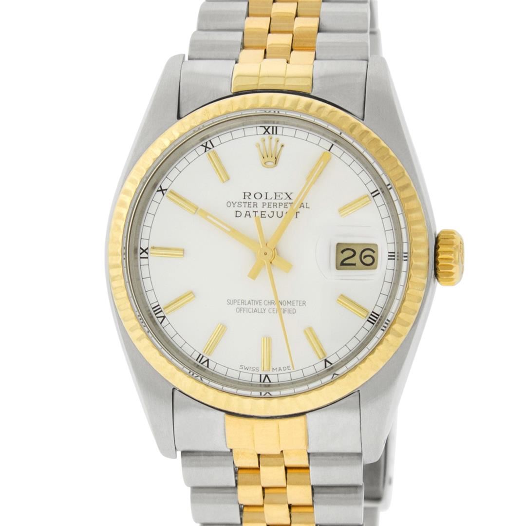 One Mens 14K Yellow Gold Two Tone Rolex Datejust Polished, Serviced & Electronically Tested, 14K Yellow Gold & Stainless Steel Case: 36mm,14K Yellow Gold Crown, Bezel: 14K Yellow Gold Fluted Bezel. Custom Crystal: New Acrylic Cyclops Lens. Custom Hands: New Luminecent Hands. Movement: Automatic Winding Movement Caliber 3035. Custom Dial: White Index With Square Roman Track. Date Window: 3 O'Clock Position Date Display, Quickset, Model: 16013 Datejust. Condition: G-6 Extra Fine. Bracelet:Two Tone 14K Yellow Gold & Stainless Steel Jubilee Band. Bright Polish. 7.0 Inch Length, Adjustable. Standard Clasp, With Rolex Logo. This Watch Has Been Serviced Time Tested And Is In Excellent Condition It Is Free Of All Scratches And Dents.