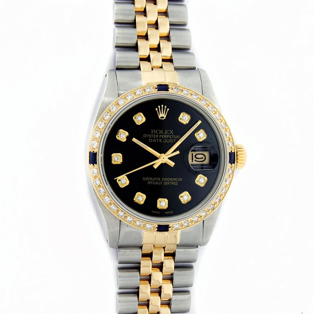 One Mens Yellow Gold Two Tone Rolex Datejust Polished, Serviced & Electronically Tested, Yellow Gold & Stainless Steel Case: 36mm, Yellow Gold Crown, Custom Bezel: New 18K Yellow Gold Beadset + Sapphire Diamond Bezel, Stone Count: 36 Diamonds + 4 Sapphires On The Bezel, Total Weight 1.00 Carat, Clarity: SI-VS, Color: G to H. Custom Crystal: New Scratch Resistant Synthetic Sapphire Cyclops Lens. Custom Hands: New Luminecent Hands. Movement: Automatic Winding Movement. Custom Dial: Black With Single Cut Diamond Hour Markers. Diamond Count: 10 Diamonds In Dial, Clarity: VS, Color: Color G to H Date Window: 3 O'Clock Position Date Display, Quickset, Model: Datejust. Condition: G-6 Extra Fine. Bracelet: Two Tone Yellow Gold & Stainless Steel Jubilee Band. Bright Polish. 7.0 Inch Length, Adjustable. Standard Clasp, With Rolex Logo. This Watch Has Been Serviced Time Tested And Is In Excellent Condition It Is Free Of All Scratches And Dents.