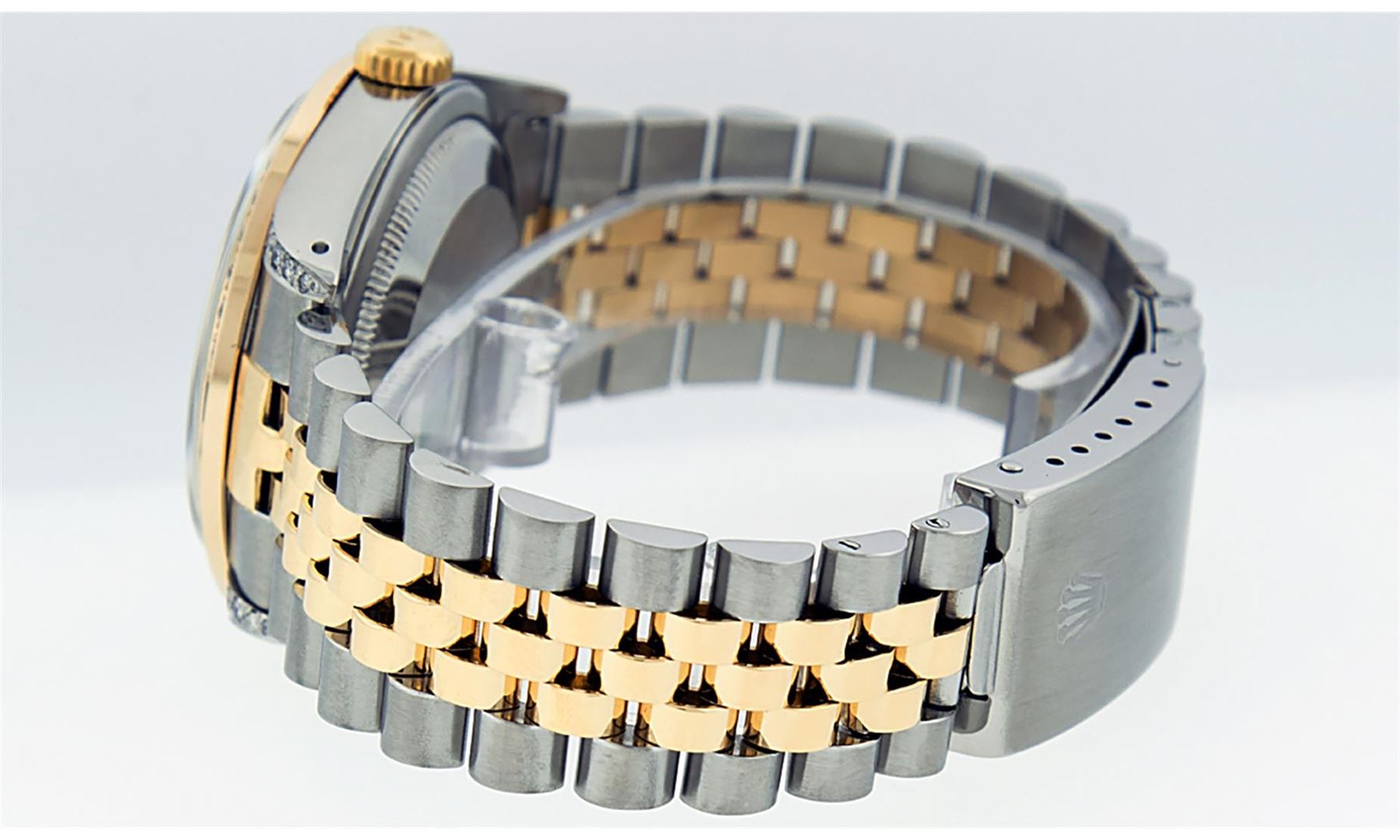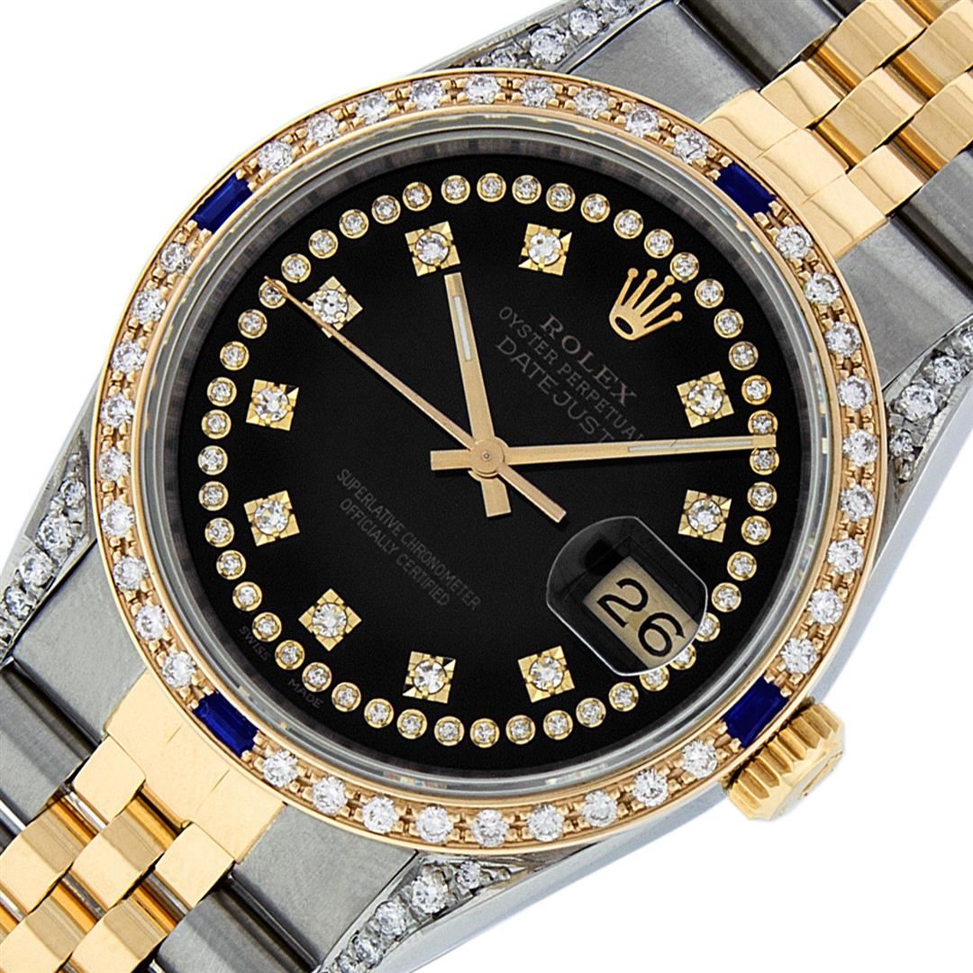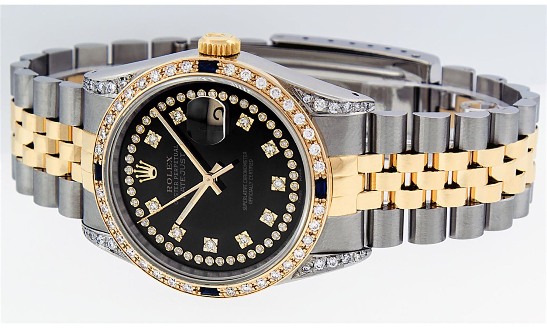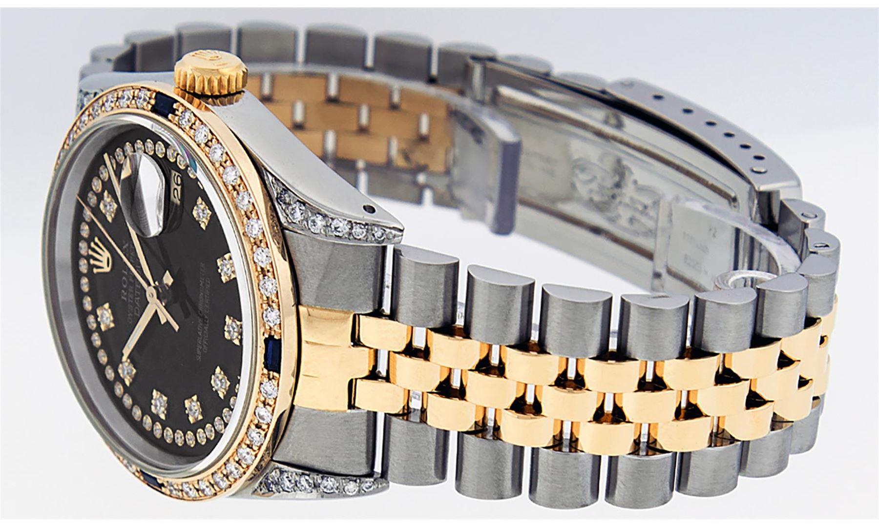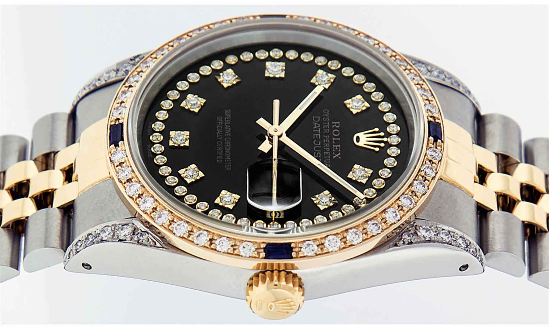 One Mens Yellow Gold & Stainless Steel Datejust Polished Bright with Satin Finish, Serviced & Electronically Tested, Stainless Steel Case: 36mm, Custom Diamond Lugs: 28 Diamonds On Lugs, Color: G to H, Clarity: SI-VS. Yellow Gold Crown, Custom Bezel: New 18K Yellow Gold Beadset Diamond + Sapphire Bezel, Diamond + Stone Count: 36 Diamonds + 4 Sapphires, Total Weight 1.00 Carat, Clarity: SI-VS, Color: G to H. Custom Crystal: New Scratch Resistant Synthetic Sapphire Cyclops Lens. Custom Hands: New Luminecent Hands. Movement: Automatic Winding Movement. Custom Dial: Black Single Cut String Diamond Dial, Stone Count: 58 Diamonds In Dial, Color: G to H, Clarity: VS2. Date Window: 3 O'Clock Position Date Display, Quickset, Model: 16013 Datejust. Condition: G-6 Extra Fine. Bracelet: Yellow Gold And Stainless Steel Jubilee Band. Bright Polish & Satin Finish. 7.0 Inch Length, Adjustable. Standard Clasp, With Rolex Logo. This Watch Has Been Serviced And Polished It Is Free Of All Scratches And Dents.