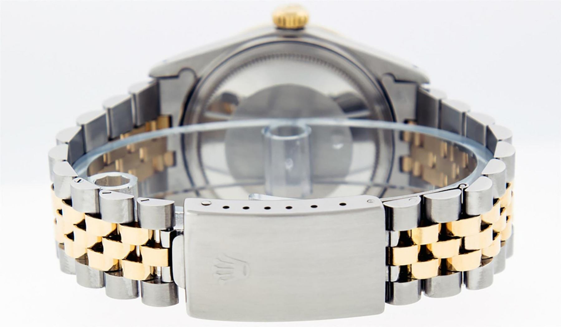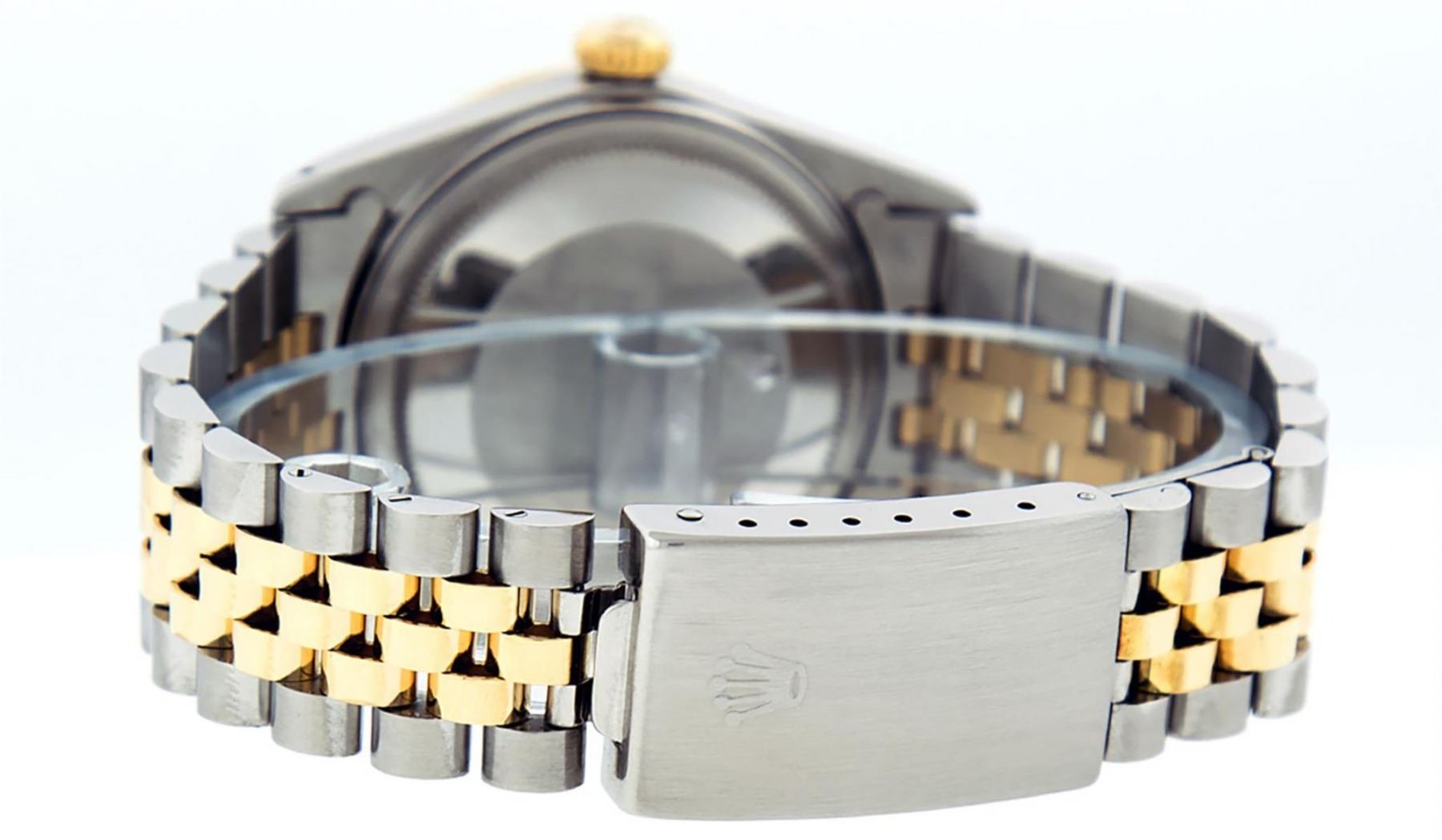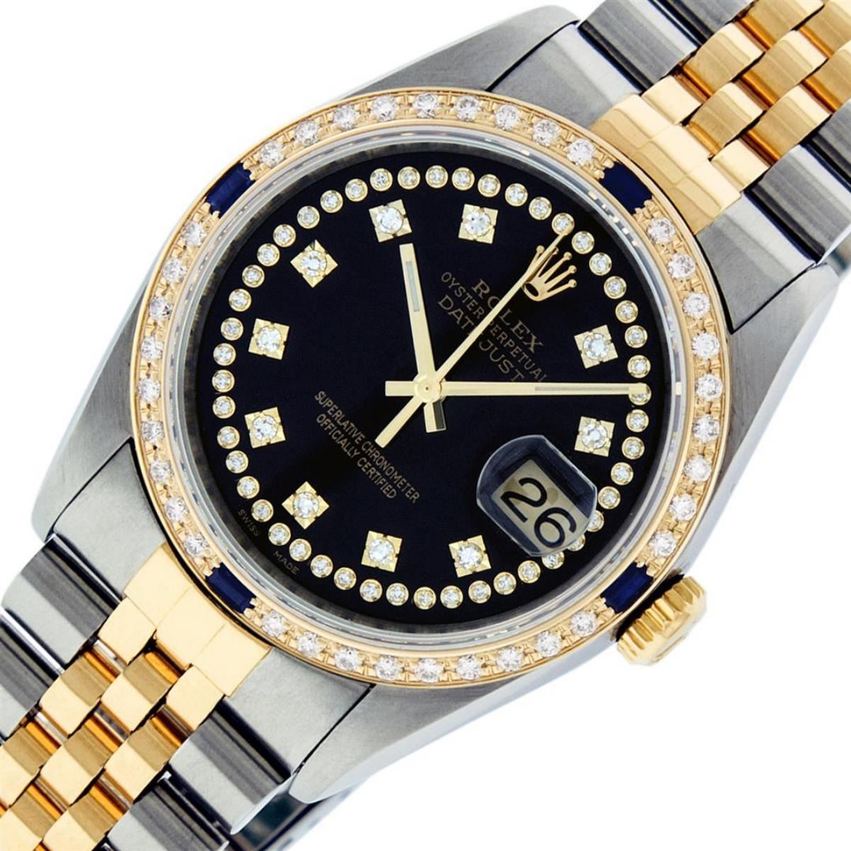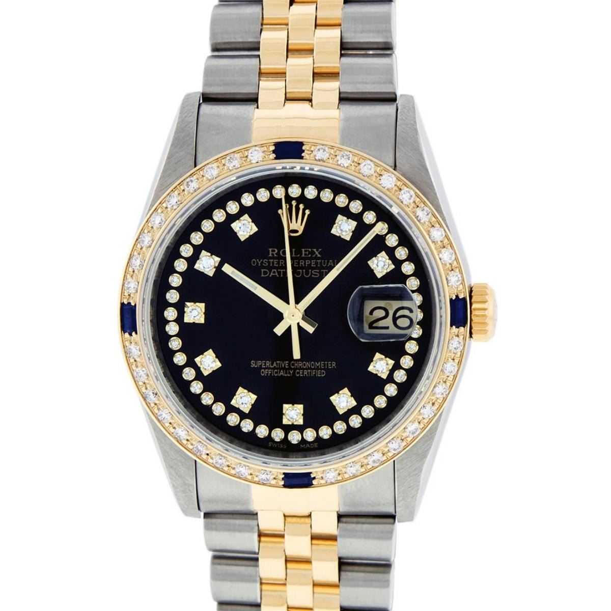One Mens Yellow Gold Two Tone Rolex Datejust Polished, Serviced & Electronically Tested, Yellow Gold & Stainless Steel Case: 36mm, Yellow Gold Crown, Custom Bezel: 18K Yellow Gold Sapphire Beadset Diamond Bezel, Diamond Count: 36 Diamonds + 4 Sapphires, Total Weight 1.0 Carat, Clarity: SI-VS, Color: G to H. Custom Crystal: New Scratch Resistant Synthetic Sapphire Cyclops Lens. Custom Hands: New Luminecent Hands. Movement: Automatic Winding Movement. Custom Dial: Black String Single Cut Diamond Dial, Diamond Count: 58 Diamonds In Dial, Color: G to H, Clairty: SI-VS Date Window: 3 O'Clock Position Date Display, Quickset, Model: Datejust, Condition: G-6 Extra Fine. Bracelet: Two Tone Yellow Gold & Stainless Steel Jubilee Band. Bright Polish. 7.0 Inch Length, Adjustable. Standard Clasp, With Rolex Logo. This Watch Has Been Serviced Time Tested And Is In Excellent Condition It Is Free Of All Scratches And Dents.