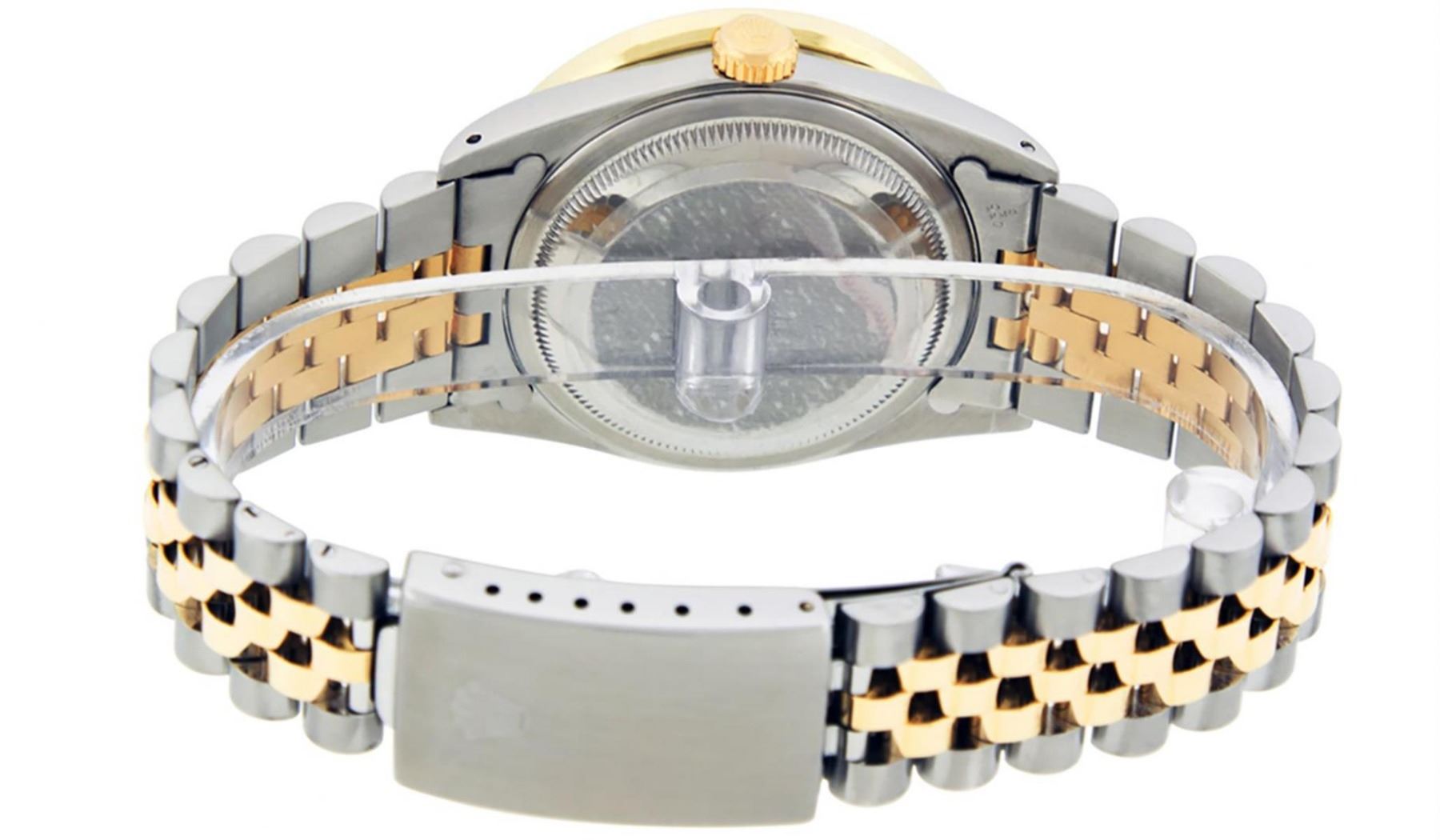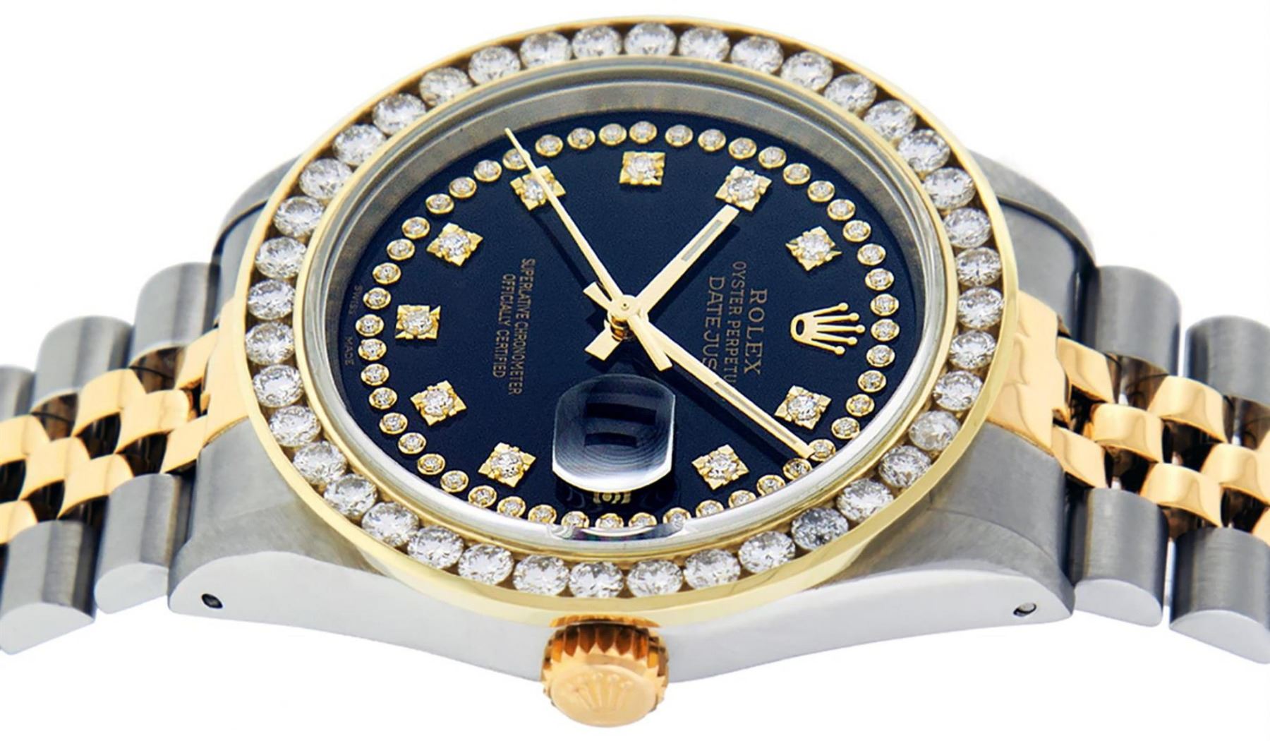 One Mens Yellow Gold Rolex Datejust Polished Bright with Satin Finish, Serviced & Electronically Tested, Stainless Steel Case: 36mm, Yellow Gold Crown, Custom Bezel: New 18K Yellow Gold 3ct Channel Set Diamond Bezel, Diamond Count: 40 Diamonds, Total Weight 3.00 Carat, Clarity: SI-VS, Color: G to H. Custom Crystal: New Scratch Resistant Synthetic Sapphire Cyclops Lens. Custom Hands: New Luminecent Hands. Movement: Automatic Winding Movement. Custom Dial: Black String Diamond Dial, Diamond Count: 58 Diamonds In Dial, Color: G to H, Clarity: VS. Date Window: 3 O'Clock Position Date Display, Quickset, Model: Datejust. Condition: G-6 Extra Fine. Bracelet: Yellow Gold And Stainless Steel Jubilee Band. Bright Polish & Satin Finish. 7.0 Inch Length, Adjustable. Standard Clasp, With Rolex Logo. This Watch Has Been Serviced And Polished It Is Free Of All Scratches And Dents.