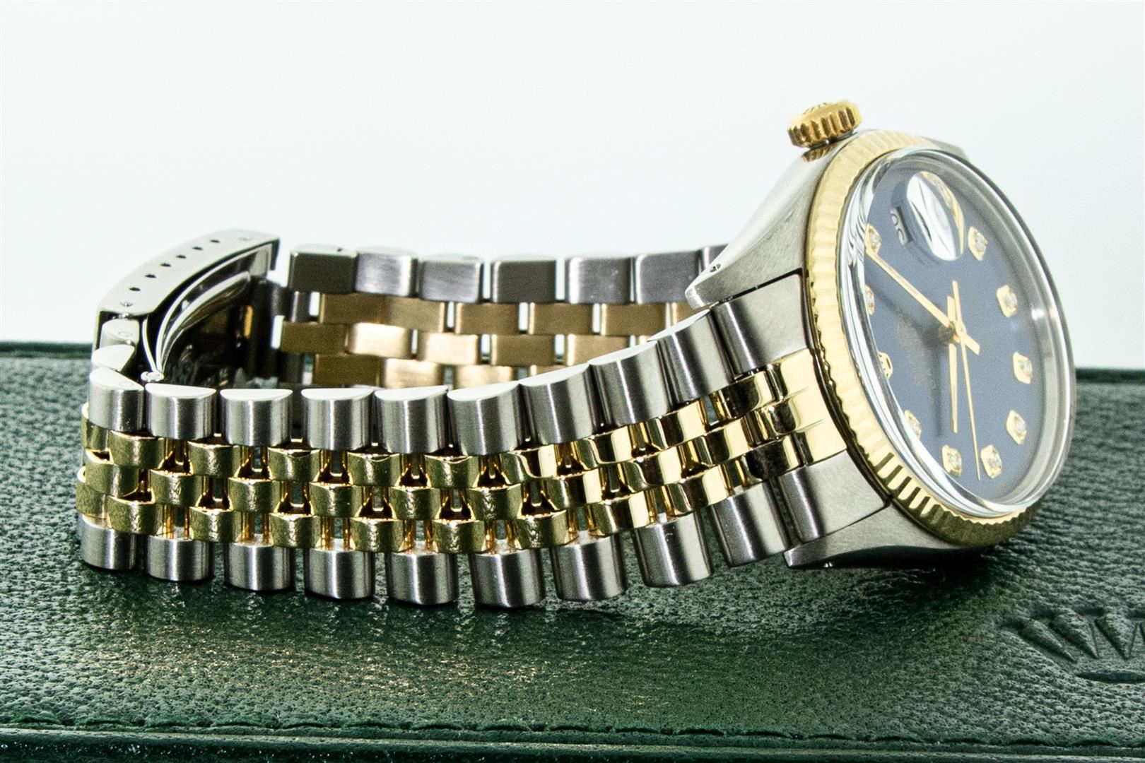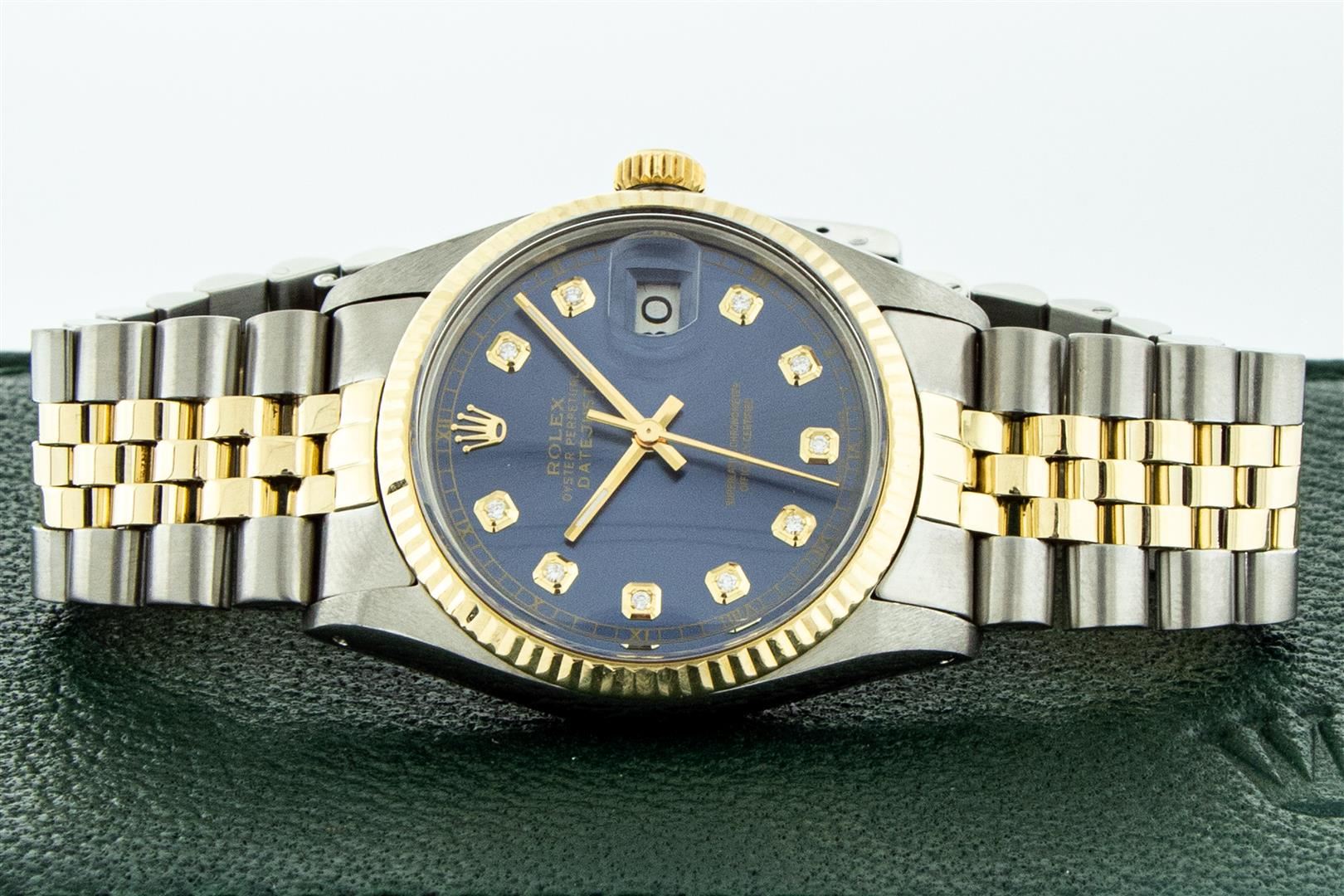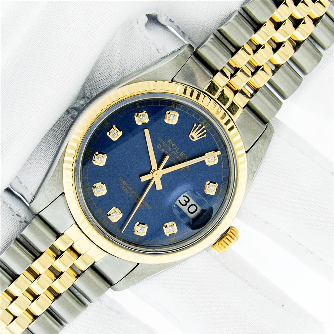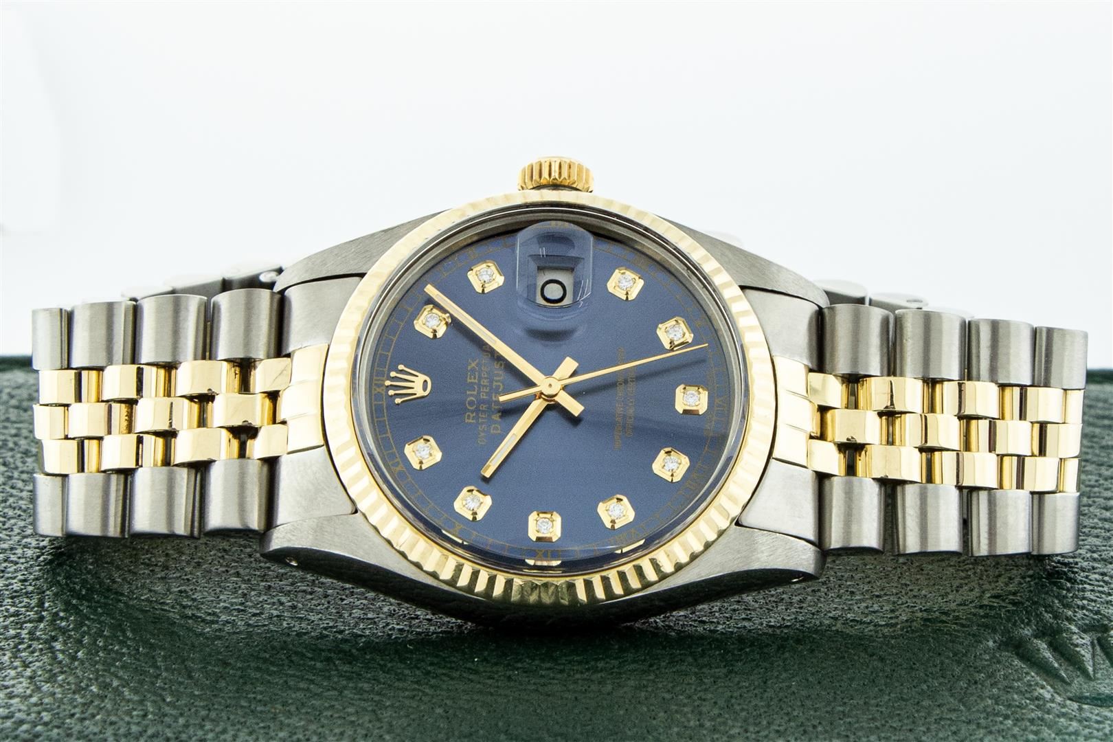 One Mens Pre Owned Yellow Gold Two Tone Rolex Datejust Polished, Serviced & Electronically Tested, Rolex Yellow Gold & Stainless Steel Case: 36mm, Rolex Yellow Gold Crown, Rolex Bezel: Yellow Gold Fluted Bezel. Custom Crystal: New Acrylic Cyclops Lens. Custom Hands: New Luminecent Hands. Rolex Movement: Automatic Winding Movement. Custom Dial: Dial Refinished To Blue With Custom Added Genuine Diamond Hour Markers And Square Roman Track, Diamond Count: 10 Diamonds in Dial, G To H In Color, SI-VS Clarity. Date Window: 3 O'Clock Position Date Display, Quickset, Model: Datejust, Condition: G-6 Extra Fine. Rolex Bracelet: Two Tone Yellow Gold & Stainless Steel Jubilee. Bright Polish. 7.0 Inch Length, Adjustable. Standard Clasp, With Rolex Logo. This Watch Has Been Serviced And Polished It Is Free Of All Scratches And Dents. This Watch Comes With A Rolex Box.