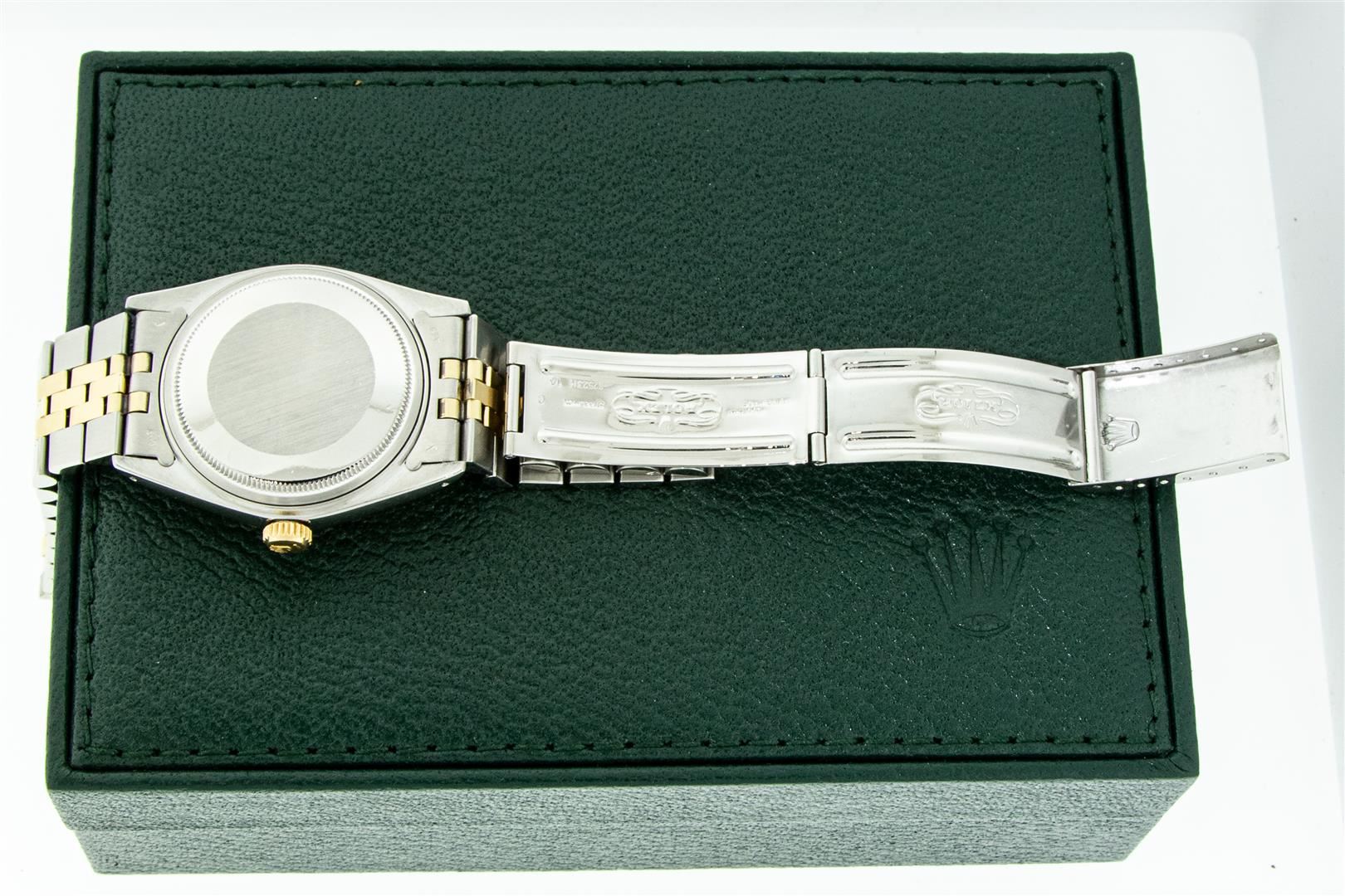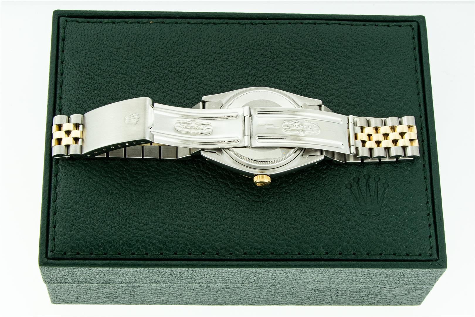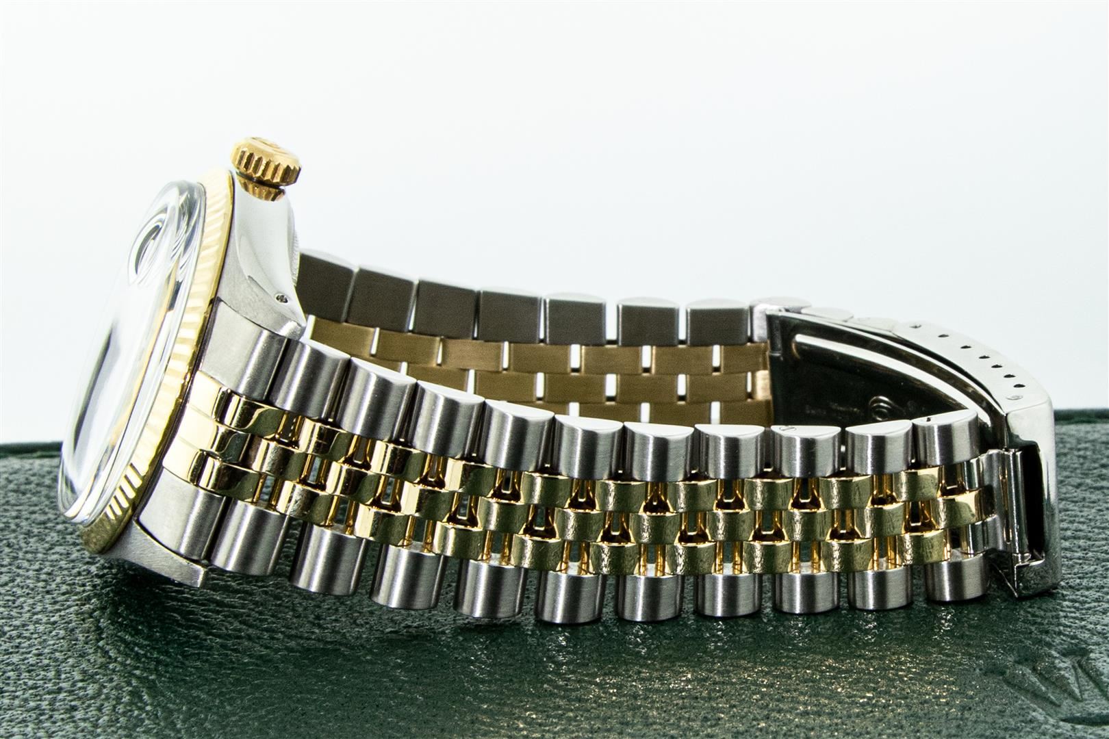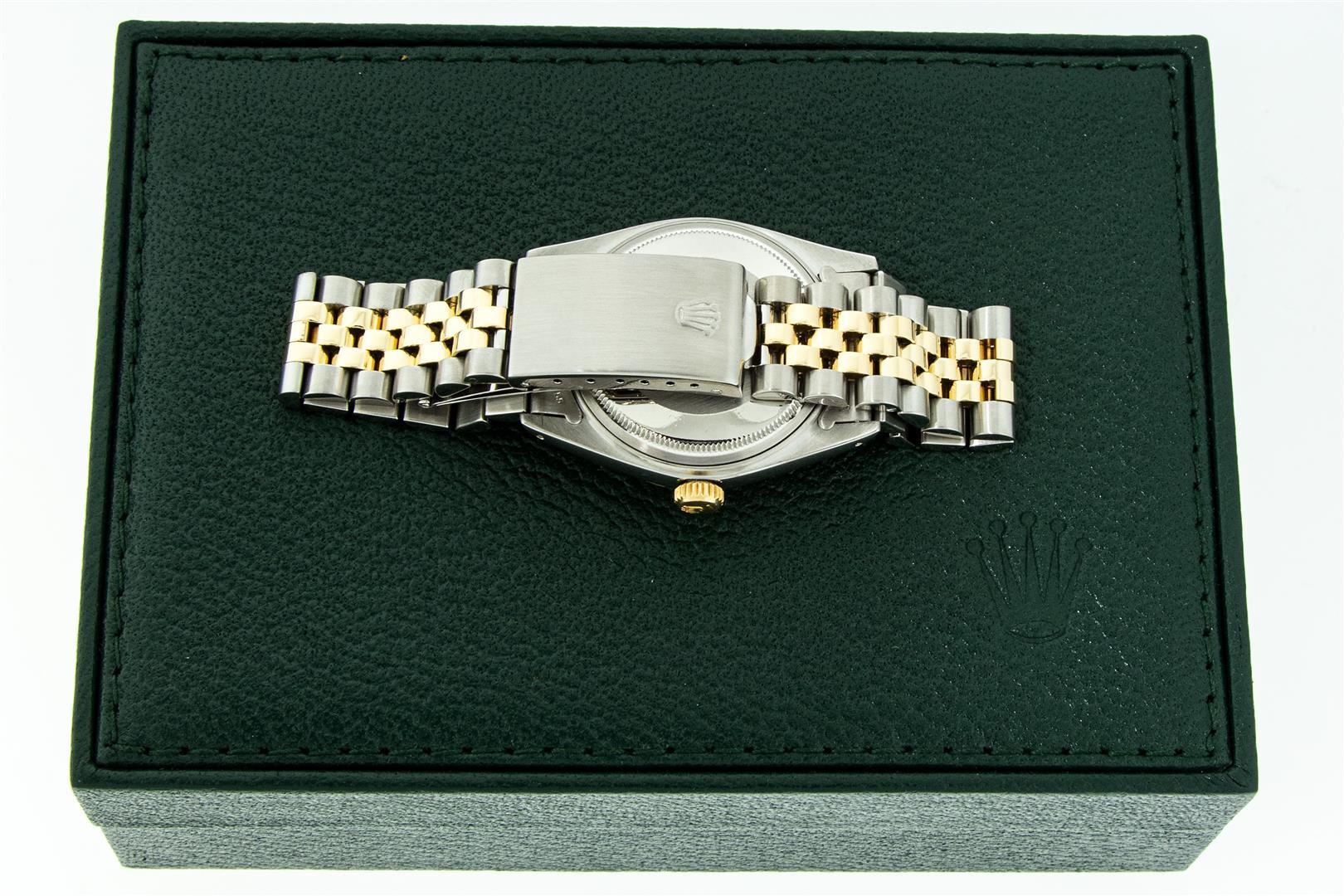 One Mens Pre Owned Yellow Gold Two Tone Rolex Datejust Polished, Serviced & Electronically Tested, Rolex Yellow Gold & Stainless Steel Case: 36mm, Rolex Yellow Gold Crown, Rolex Bezel: Yellow Gold Fluted Bezel. Custom Crystal: New Acrylic Cyclops Lens. Custom Hands: New Luminecent Hands. Rolex Movement: Automatic Winding Movement. Custom Dial: Dial Refinished To Blue With Custom Added Genuine Diamond Hour Markers And Square Roman Track, Diamond Count: 10 Diamonds in Dial, G To H In Color, SI-VS Clarity. Date Window: 3 O'Clock Position Date Display, Quickset, Model: Datejust, Condition: G-6 Extra Fine. Rolex Bracelet: Two Tone Yellow Gold & Stainless Steel Jubilee. Bright Polish. 7.0 Inch Length, Adjustable. Standard Clasp, With Rolex Logo. This Watch Has Been Serviced And Polished It Is Free Of All Scratches And Dents. This Watch Comes With A Rolex Box.