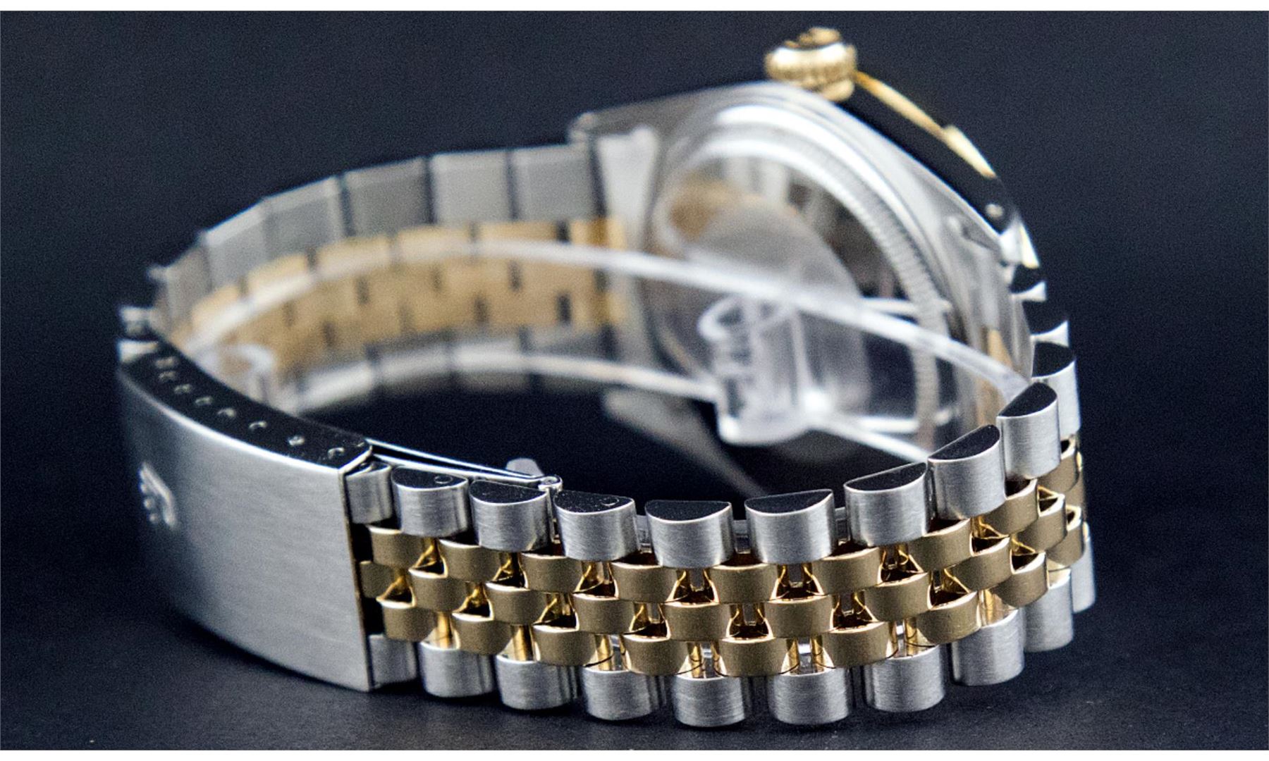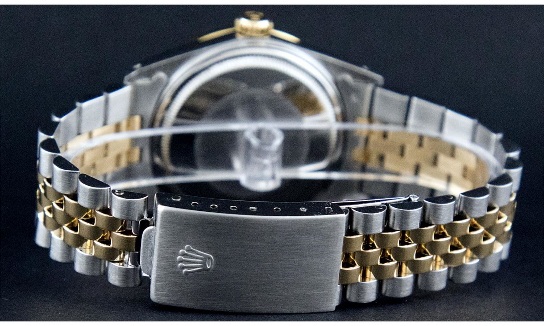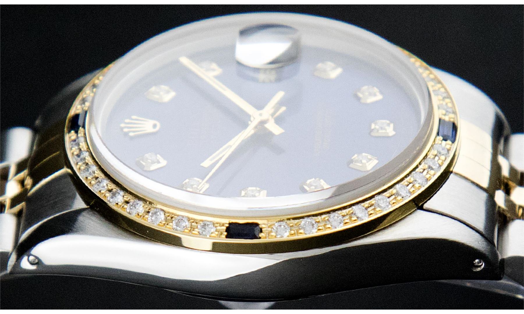 One Mens Pre Owned Rolex Yellow Gold And Stainless Steel Two Tone Rolex Datejust Polished, Serviced & Electronically Tested, Rolex Case: Yellow Gold And Stainless Steel Case: 36mm, Rolex Yellow Gold Crown, Custom Bezel: New 18K Yellow Gold Sapphire Beadset Diamond Bezel, Diamond Count: 36 Diamonds + 4 Sapphires. Custom Crystal: New Sapphire With Magnified Date Window. Custom Hands: New Luminescent Hands. Rolex Movement: Automatic Winding Movement 3035. Custom Dial: Custom Blue Dial With Added Diamond Hour Markers. Diamond Count: 10 Diamonds. Date Window: 3 O'Clock Position Date Display, Quickset, Model: Datejust Condition: G-6 Extra Fine. Rolex Bracelet: Two Tone Yellow Gold And Stainless Steel Jubilee Band. Bright Polish. 7.0 Inch Length, Adjustable. Standard Clasp, With Rolex Logo. This Watch Has Been Serviced Time Tested And Is In Excellent Condition It Is Free Of All Scratches And Dents.