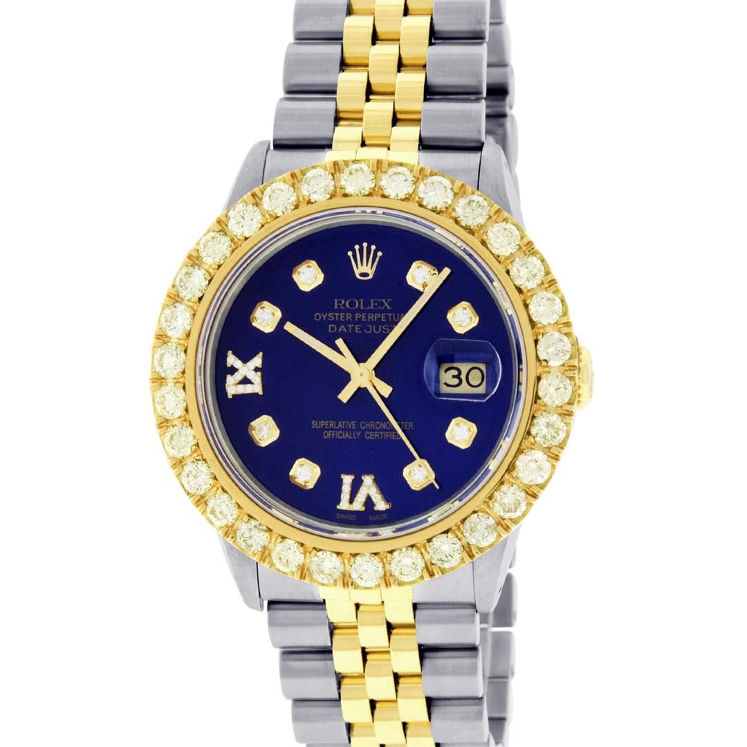 One Mens 14K Yellow Gold Rolex Datejust Polished Bright with Satin Finish, Serviced & Electronically Tested, Stainless Steel Case: 36mm, Yellow Gold Crown, Custom Bezel: New 18K Yellow Gold 4ct beadset Diamond Bezel, Diamond Count: 30 Diamonds, Total Bezel Weight 4.00 Carat, Clarity: SI-VS, Color: G to H. Custom Crystal: New Synthetic Sapphire Cyclops Lens. Custom Hands: New Luminecent Hands. Movement: Automatic Winding Movement Caliber 3035. Custom Dial: Blue Diamond Dial, Diamond Count: 8 Diamonds + 2 Roman Diamonds On Dial, Color: G to H, Clarity: VS. Date Window: 3 O'Clock Position Date Display, Quickset, Model: Datejust. Condition: G-6 Extra Fine. Bracelet: 14K Yellow Gold And Stainless Steel Jubilee Band. Bright Polish & Satin Finish. 7.0 Inch Length, Adjustable. Standard Clasp, With Rolex Logo. This Watch Has Been Serviced And Polished It Is Free Of All Scratches And Dents. This Watch Comes With A Rolex Box.