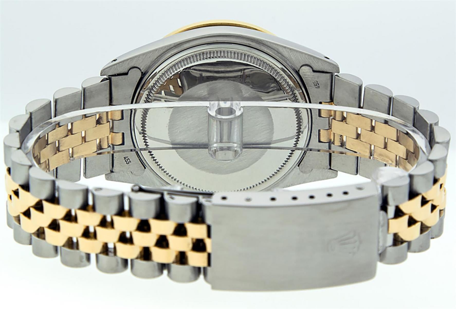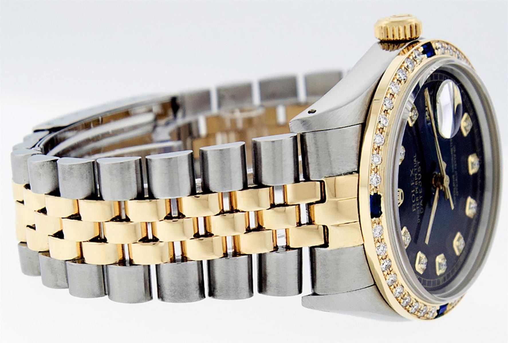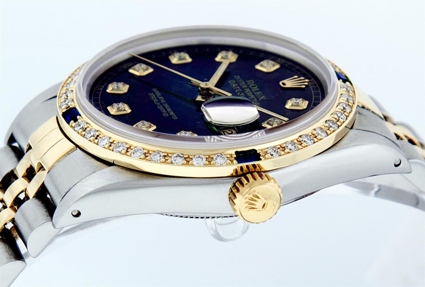 One Mens Yellow Gold Two Tone Rolex Datejust Polished, Serviced & Electronically Tested, Yellow Gold & Stainless Steel Case:36mm, Yellow Gold Crown, Custom Bezel: New 18K Yellow Gold Sapphire Beadset Diamond Bezel, Diamond Count: 36 Diamonds + 4 Sapphires, Total Weight 1.00 Carat, Clarity: SI-VS, Color: G to H. Custom Crystal: New Scratch Resistant Synthetic Sapphire Cyclops Lens. Custom Hands: New Luminecent Hands. Movement: Automatic Winding Movement. Custom Dial: Blue Vignette With Diamond Hour Markers And Roman Track. Diamond Count: 10 Diamonds On Dial, Clarity: SI-VS, Color: Color G to H Date Window: 3 O'Clock Position Date Display, Quickset, Model: Datejust, Condition: G-6 Extra Fine. Bracelet: Two Tone Yellow Gold & Stainless Steel Jubilee Band. Bright Polish. 7.0 Inch Length, Adjustable. Standard Clasp, With Rolex Logo. This Watch Has Been Serviced Time Tested And Is In Excellent Condition It Is Free Of All Scratches And Dents.