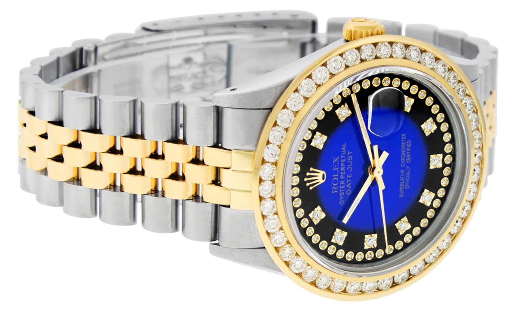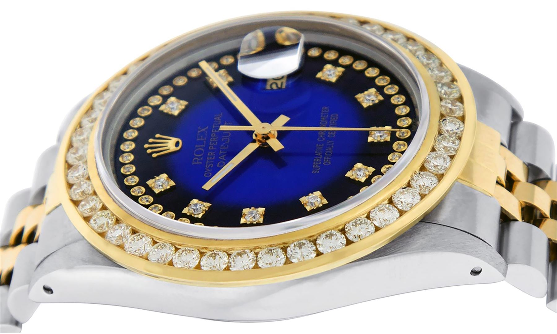 One Mens 14K Yellow Gold Rolex Datejust Polished Bright with Satin Finish, Serviced & Electronically Tested, Stainless Steel Case: 36mm, Yellow Gold Crown, Custom Bezel: New 18K Yellow Gold 3ct Channel Set Diamond Bezel, Diamond Count: 40 Diamonds In Bezel, Total Weight 3.00 Carat, Clarity: SI-VS, Color: G to H. Custom Crystal: New Scratch Resistent Synthetic Sapphire Cyclops Lens. Custom Hands: New Luminecent Hands. Movement: Automatic Winding Movement Caliber 3035. Custom Dial: Blue Vignette String Diamond Dial, Diamond Count: 58 Diamonds In Dial, Color: G to H, Clarity: VS. Date Window: 3 O'Clock Position Date Display, Quickset, Model: 16013 Datejust. Condition: G-6 Extra Fine. Bracelet: 14K Yellow Gold And Stainless Steel Jubilee Band. Bright Polish & Satin Finish. 7.0 Inch Length, Adjustable. Standard Clasp, With Rolex Logo. This Watch Has Been Serviced And Polished It Is Free Of All Scratches And Dents.
