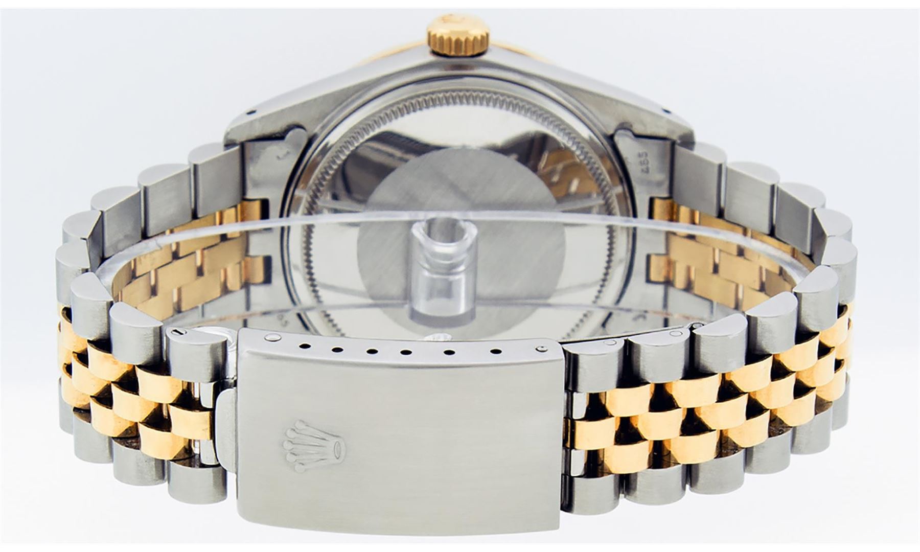 One Mens Yellow Gold Two Tone Rolex Datejust Polished, Serviced & Electronically Tested, Yellow Gold & Stainless Steel Case: 36mm, Yellow Gold Crown, Bezel: Yellow Gold Fluted Bezel. Custom Crystal: New Acrylic Cyclops Lens. Custom Hands: New Luminecent Hands. Movement: Automatic Winding Movement . Custom Dial: Blue Vignette String Dial Set With VS Diamond Hour Markers, Diamond Count: 58 Diamonds in Dial, G To H In Color, SI-VS Clarity. Date Window: 3 O'Clock Position Date Display, Quickset, Model: Datejust, Condition: G-6 Extra Fine. Bracelet: Two Tone Yellow Gold & Stainless Steel Jubilee. Bright Polish. 7.0 Inch Length, Adjustable. Standard Clasp, With Rolex Logo. This Watch Has Been Serviced And Polished It Is Free Of All Scratches And Dents.