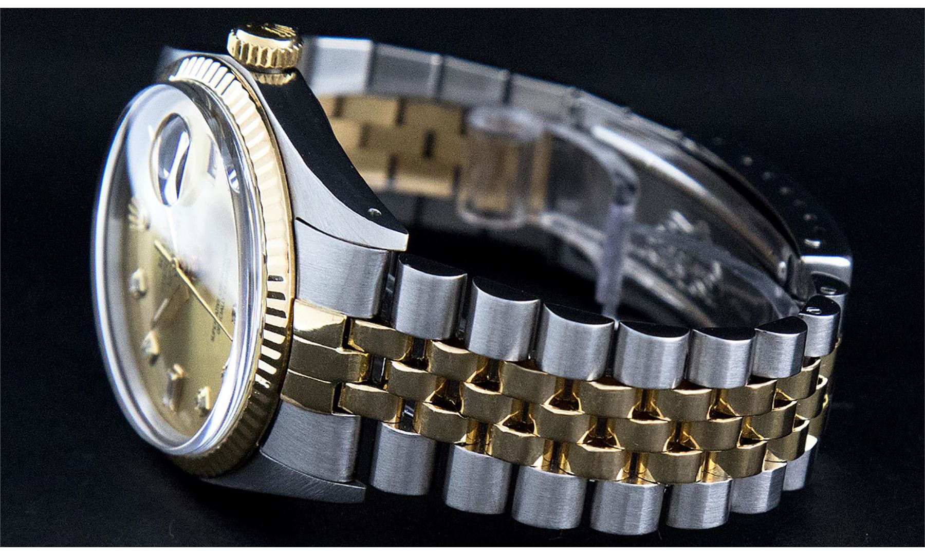 One Mens Pre Owned Rolex Yellow Gold And Stainless Steel Two Tone Rolex Datejust Polished, Serviced & Electronically Tested, Rolex Yellow Gold And Stainless Steel Case: 36mm, Rolex Yellow Gold Crown, Rolex Bezel: Yellow Gold Fluted Bezel. Custom Crystal: New Acrylic With Magnified Date Window. Custom Hands: New Luminescent Hands. Rolex Movement: Automatic Winding Movement 3035. Custom Dial: Custom Champagne Dial With Added Diamonds, Diamond Count: 8 Diamonds + 2 Baguette Diamonds in Dial. Date Window: 3 O'Clock Position Date Display, Quickset, Model: Quickset Datejust, Condition: G-6 Extra Fine. Rolex Bracelet: Two Tone Yellow Gold And Stainless Steel Jubilee Band. Bright Polish. 7.0 Inch Length, Adjustable. Standard Clasp, With Rolex Logo. This Watch Has Been Serviced And Polished It Is Free Of All Scratches And Dents.