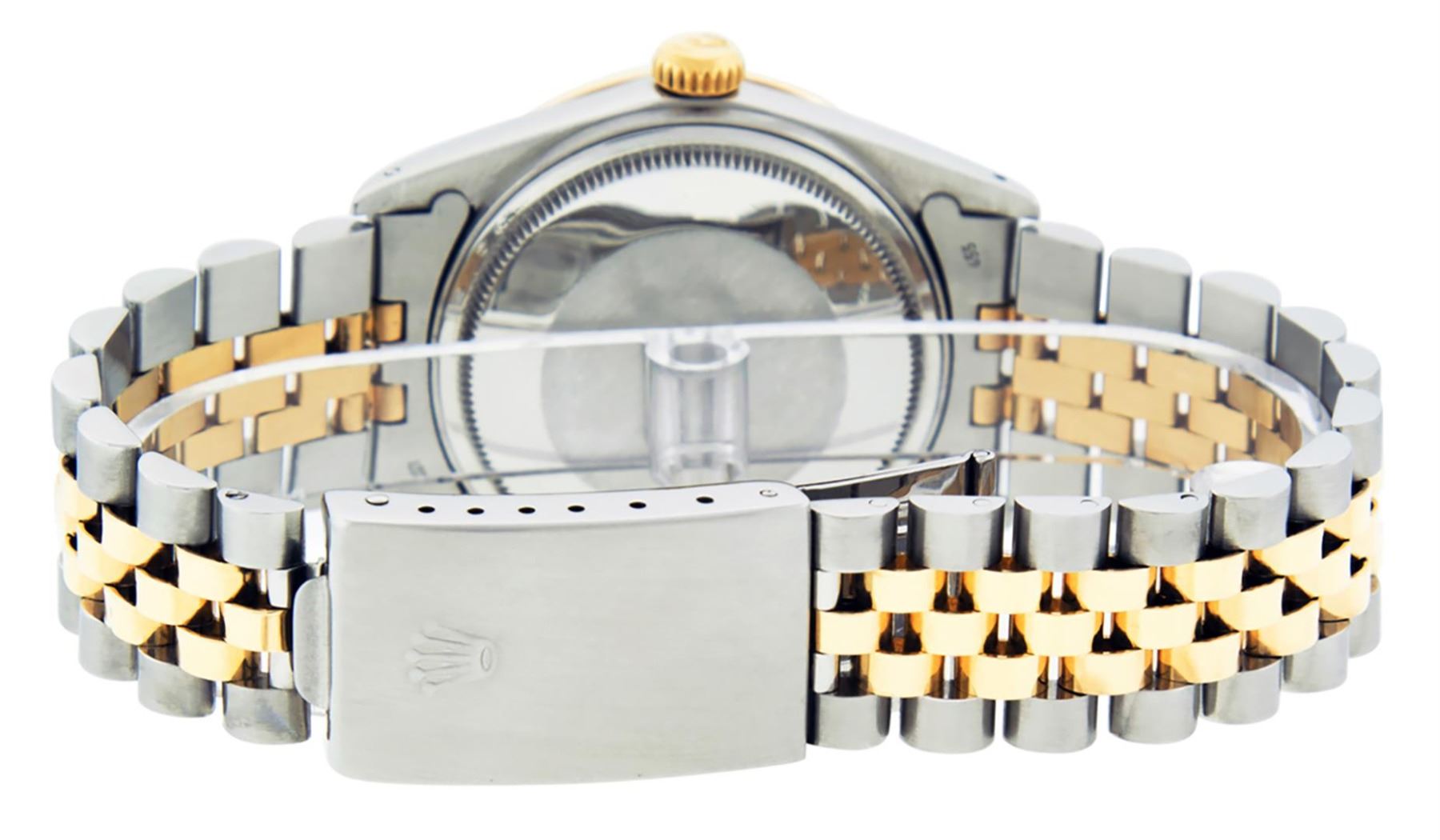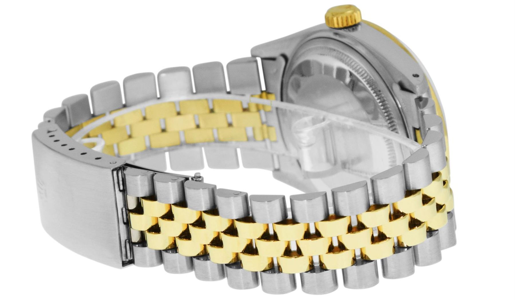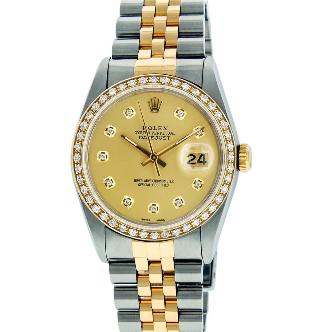 One Mens Yellow Gold Two Tone Rolex Datejust Polished, Serviced & Electronically Tested, Yellow Gold & Stainless Steel Case: 36mm, Yellow Gold Crown, Custom Bezel: New 18K Yellow Gold Beadset Diamond Bezel, Diamond Count: 44 Diamonds In Bezel, Total Weight 1.00 Carat, Clarity: SI-VS, Color: G to H. Custom Crystal: New Scratch Resistant Synthetic Sapphire Cyclops Lens. Custom Hands: New Luminecent Hands. Movement: Automatic Winding Movement. Custom Dial: Champagne With Diamond Hour Markers. Diamond Count: 10 Diamonds In Dial, Clarity: SI-VS, Color: Color G to H Date Window: 3 O'Clock Position Date Display, Quickset, Model: Datejust. Condition: G-6 Extra Fine. Bracelet:Two Tone Yellow Gold & Stainless Steel Jubilee. Bright Polish. 7.0 Inch Length, Adjustable. Standard Clasp, With Rolex Logo. This Watch Has Been Serviced Time Tested And Is In Excellent Condition It Is Free Of All Scratches And Dents.