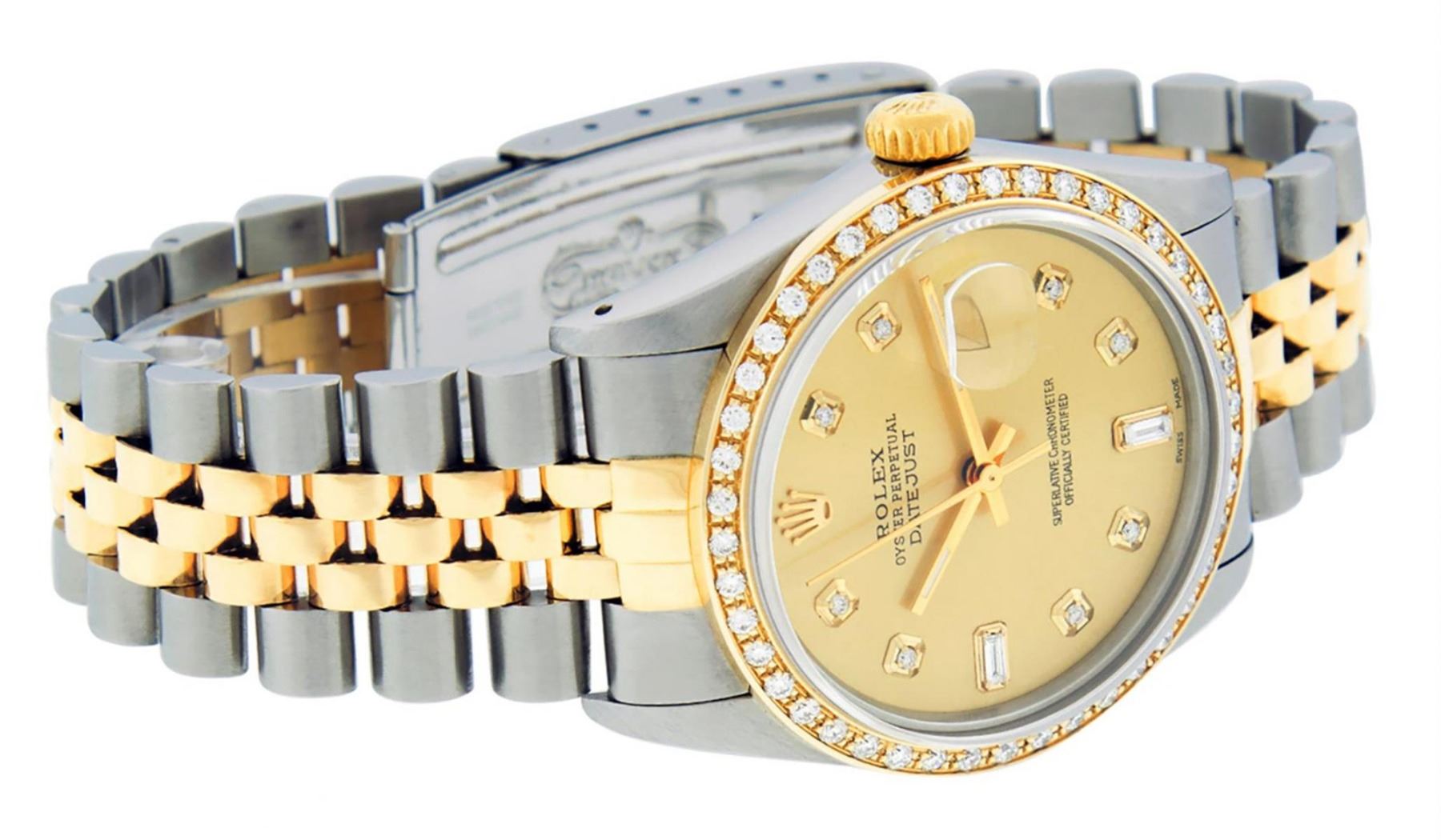 One Mens Yellow Gold Two Tone Rolex Datejust Polished, Serviced & Electronically Tested, 18K Yellow Gold & Stainless Steel Case: 36mm, 18K Yellow Gold Crown, Custom Bezel: New 18K Yellow Gold Beadset Diamond Bezel, Diamond Count: 44 Diamonds, Total Weight 1.00 Carat, Clarity: SI-VS, Color: G to H. Crystal: New Synthetic Sapphire Cyclops Lens. Custom Hands: New Luminecent Hands. Movement: Automatic Winding Movement.. Custom Dial: Champagne and Baguette Diamond Hour Markers On 6 and 9, Diamond Count: 8 + 2 Bagguette Diamonds in Dial G To H In Color, Clarity: VS2-SI1, Date Window: 3 O'Clock Position Date Display, Quickset, Model: 16013 Condition: G-6 Extra Fine. Bracelet: Two Tone Yellow Gold & Stainless Steel Jubilee. Bright Polish. 7.0 Inch Length, Adjustable. Standard Clasp, With Rolex Logo. This Watch Has Been Serviced Time Tested And Is In Excellent Condition It Is Free Of All Scratches And Dents.