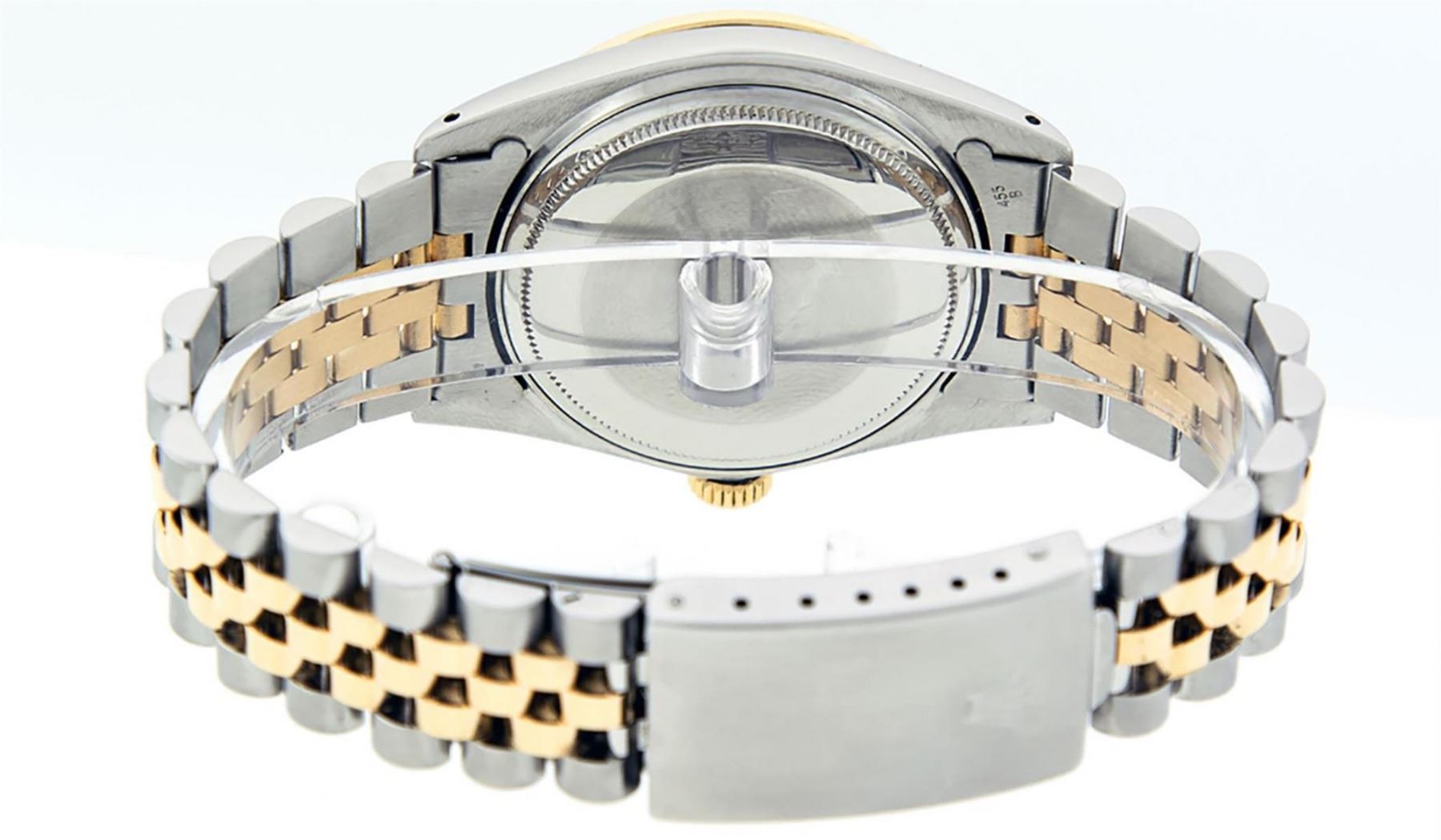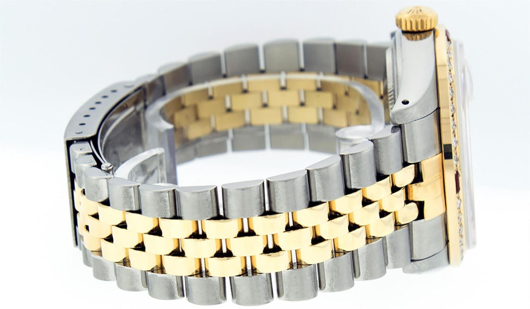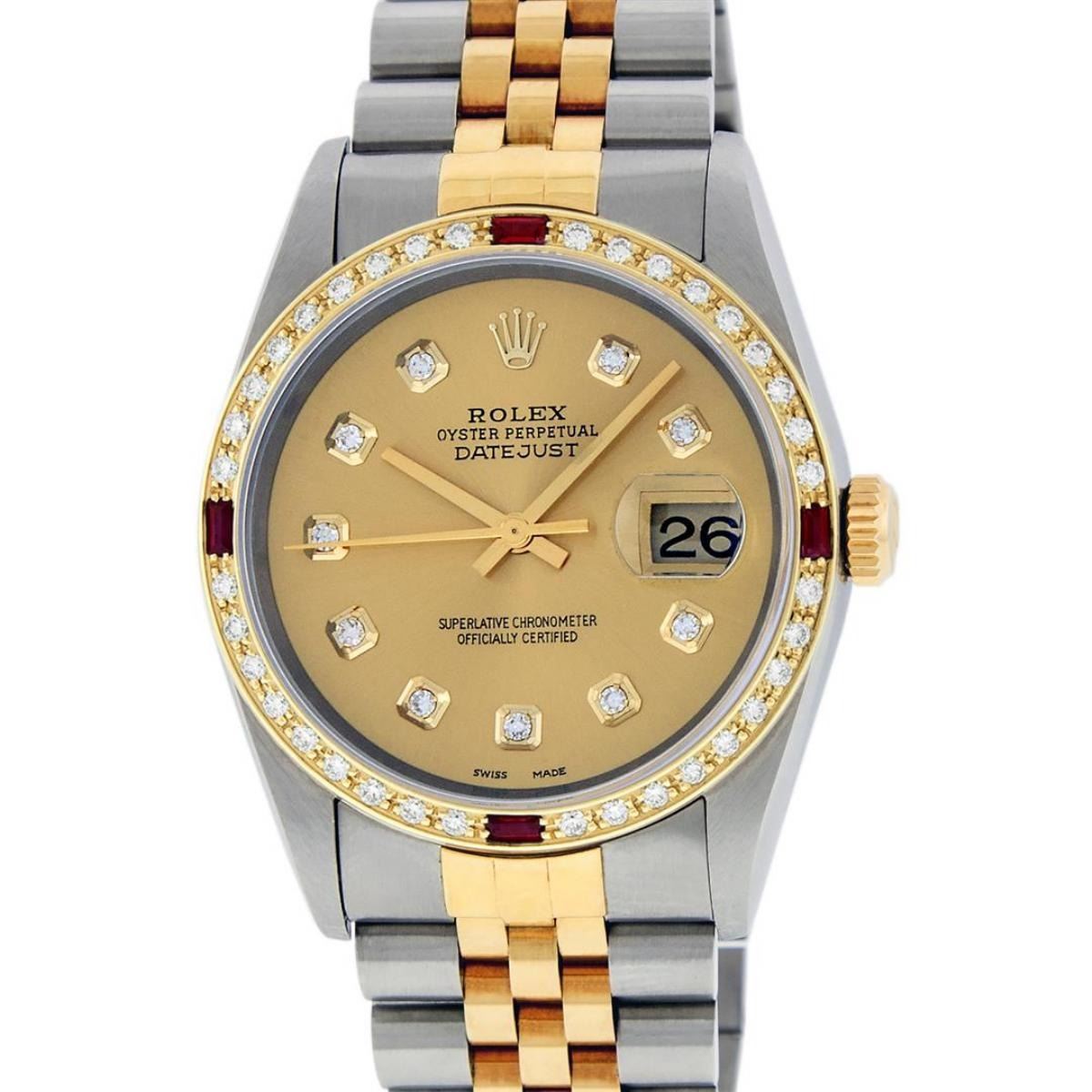 One Mens Yellow Gold Two Tone Rolex Datejust Polished, Serviced & Electronically Tested, Yellow Gold & Stainless Steel Case: 36mm, Yellow Gold Crown, Custom Bezel: New 18K Yellow Gold Ruby Beadset Diamond Bezel, Diamond Count: 36 Diamonds + 4 Rubies, Total Weight 1.00 Carat, Clarity: SI-VS, Color: G to H. Custom Crystal: New Scratch Resistant Synthetic Sapphire Cyclops Lens. Custom Hands: New Luminecent Hands. Movement: Automatic Winding Movement. Custom Dial: Champagne Dial With Diamond Hour Markers. Diamond Count: 10 Diamonds In Dial, Clarity: SI-VS, Color: Color G to H Date Window: 3 O'Clock Position Date Display, Quickset, Model: Datejust. Condition: G-6 Extra Fine. Bracelet: Two Tone Yellow Gold & Stainless Steel Jubilee. Bright Polish. 7.0 Inch Length, Adjustable. Standard Clasp, With Rolex Logo. This Watch Has Been Serviced Time Tested And Is In Excellent Condition It Is Free Of All Scratches And Dents.