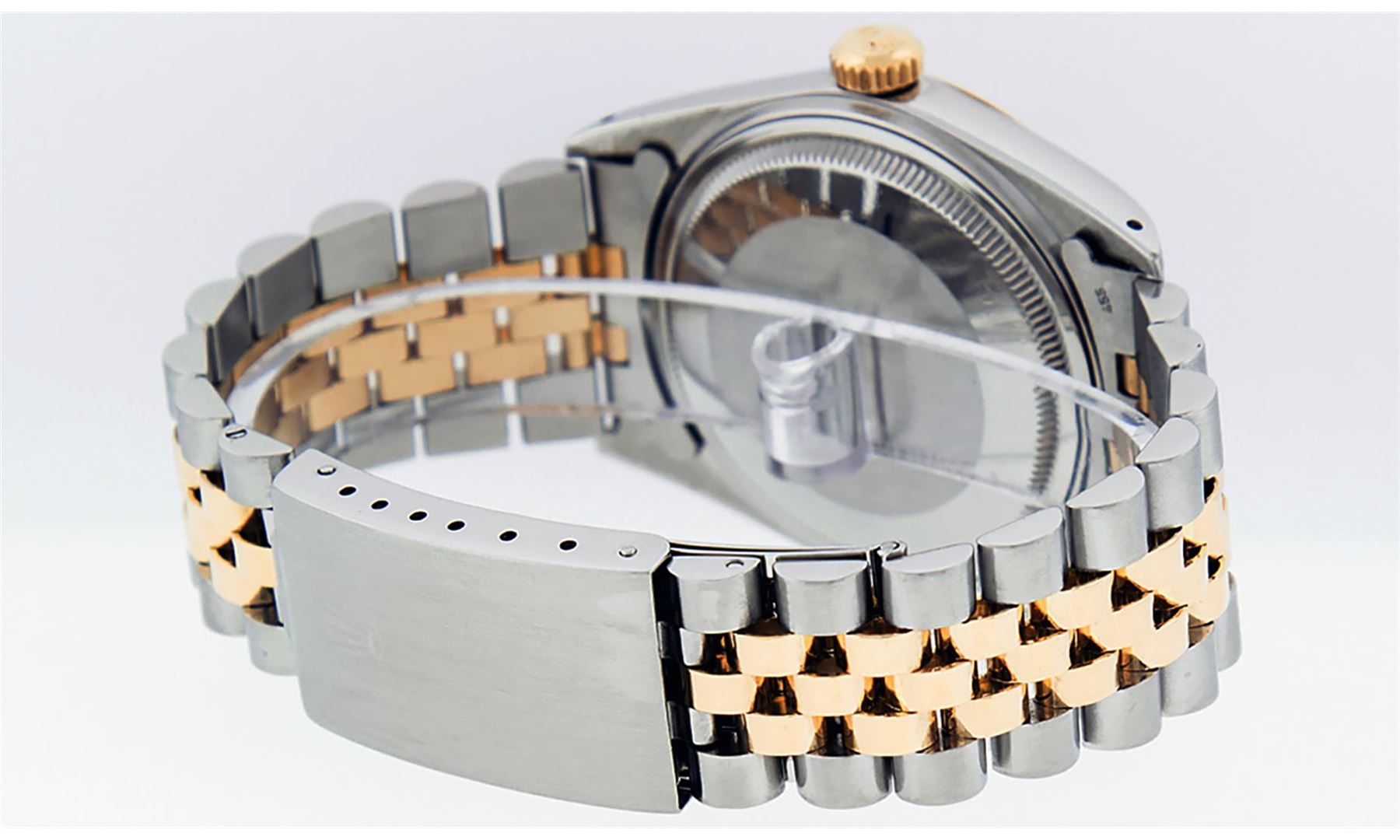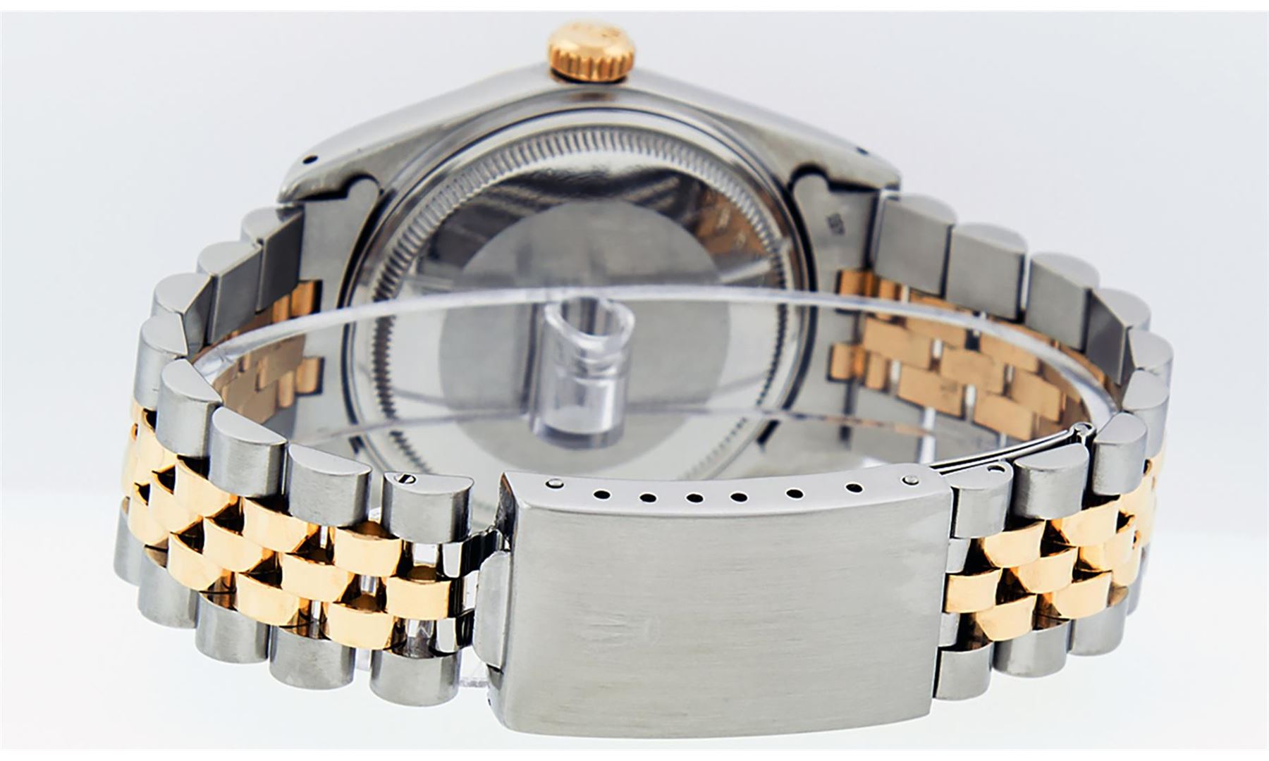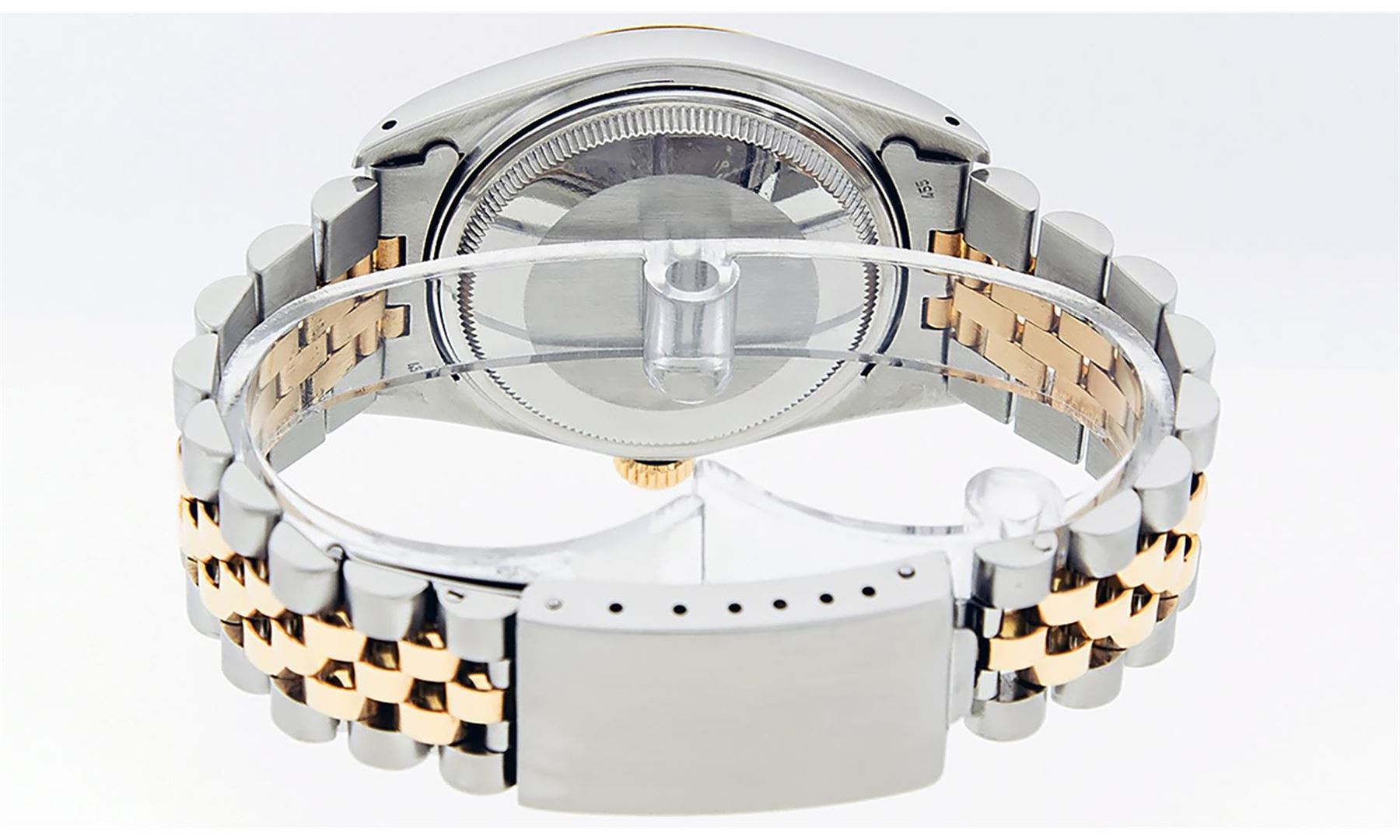 One Mens Yellow Gold Two Tone Rolex Datejust Polished, Serviced & Electronically Tested, Yellow Gold & Stainless Steel Case: 36mm,14K Yellow Gold Crown, Bezel: Yellow Gold Fluted Bezel. Custom Crystal: New Acrylic Cyclops Lens. Custom Hands: New Luminecent Hands. Movement: Automatic Winding Movement . Dial: Champagne Dial With Index Hour Markers and Small Track. Date Window: 3 O'Clock Position Date Display, Quickset, Model: Condition: G-6 Extra Fine. Bracelet: Two Tone Yellow Gold & Stainless Steel Jubilee. Bright Polish. 7.0 Inch Length, Adjustable. Standard Clasp, With Rolex Logo. This Watch Has Been Serviced Time Tested And Is In Excellent Condition It Is Free Of All Scratches And Dents.