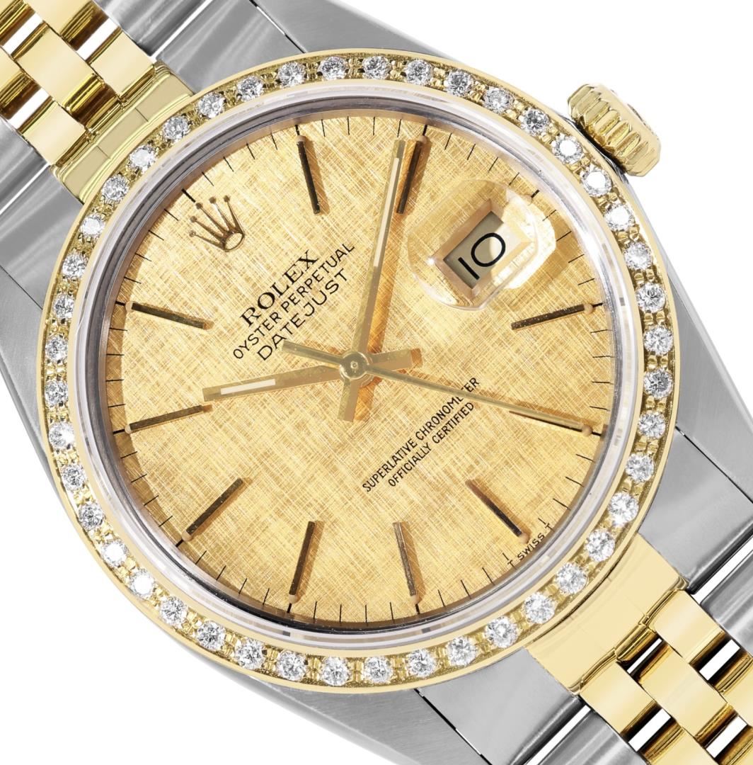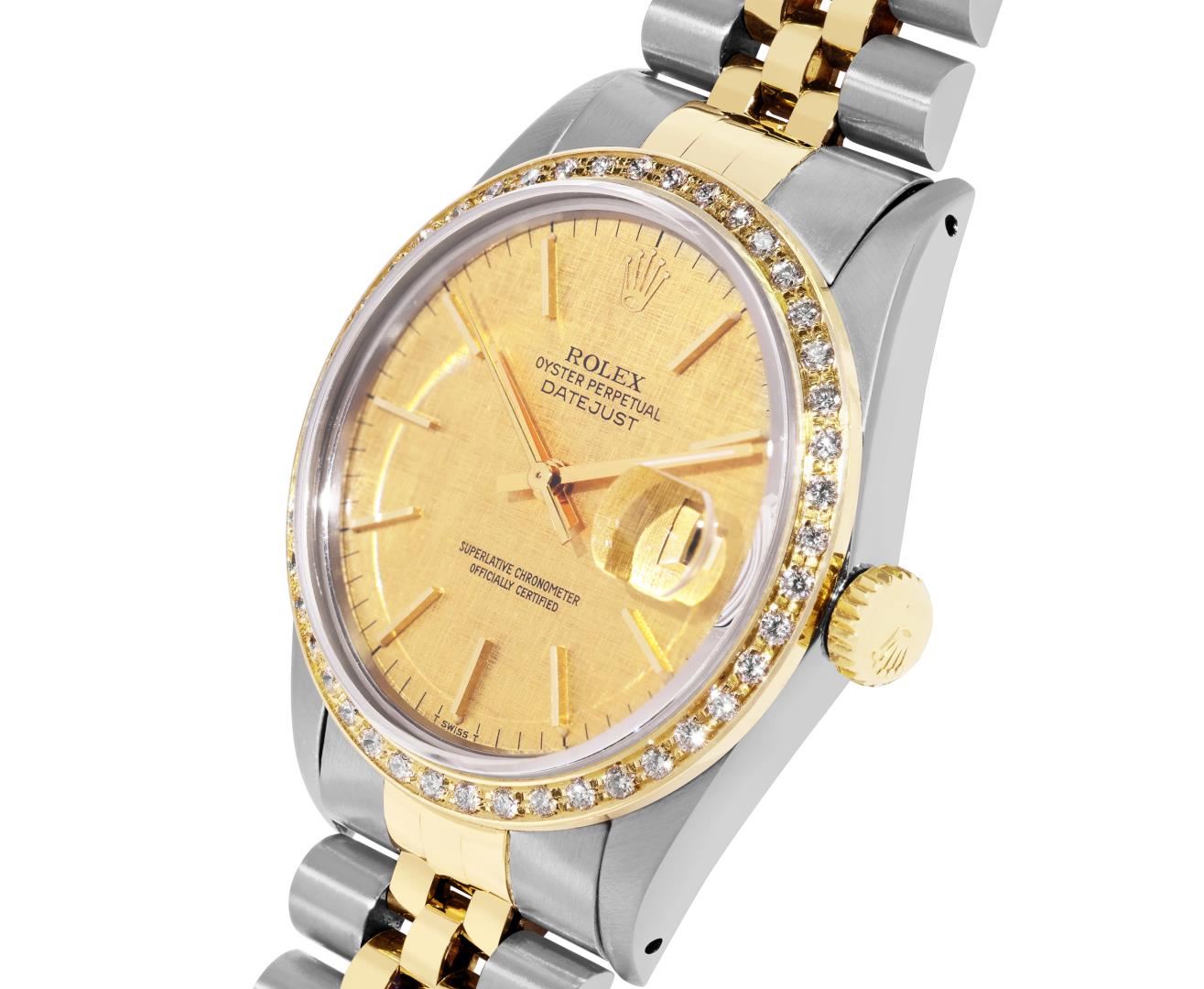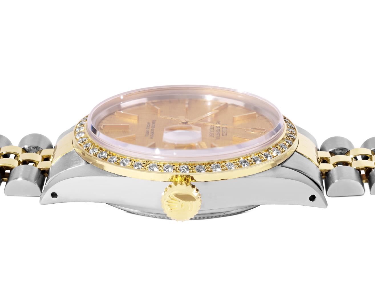 One Mens Pre Owned Yellow Gold Two Tone Rolex Datejust Polished, Serviced And Electronically Tested, Rolex Yellow Gold And Stainless Steel Case: 36mm, Rolex Yellow Gold Crown, Custom Bezel: New 18K Yellow Gold Beadset Diamond Bezel, Diamond Count: 44 Diamonds. Custom Crystal: New Sapphire With Magnified Date Window. Custom Hands: New Luminecent Hands. Rolex Movement: Automatic Winding Movement 3035. Rolex Dial: Champagne Linen Dial With Index Hour Markers and Dash Track With Lumi Dots. Date Window: 3 O'Clock Position Date Display, Quickset, Model: Quickset Datejust. Condition: G-6 Extra Fine. Rolex Bracelet: Two Tone Yellow Gold And Stainless Steel Jubilee Band. Bright Polish. 7.0 Inch Length, Adjustable. Standard Clasp, With Rolex Logo. This Watch Has Been Serviced Time Tested And Is In Excellent Condition It Is Free Of All Scratches And Dents.
